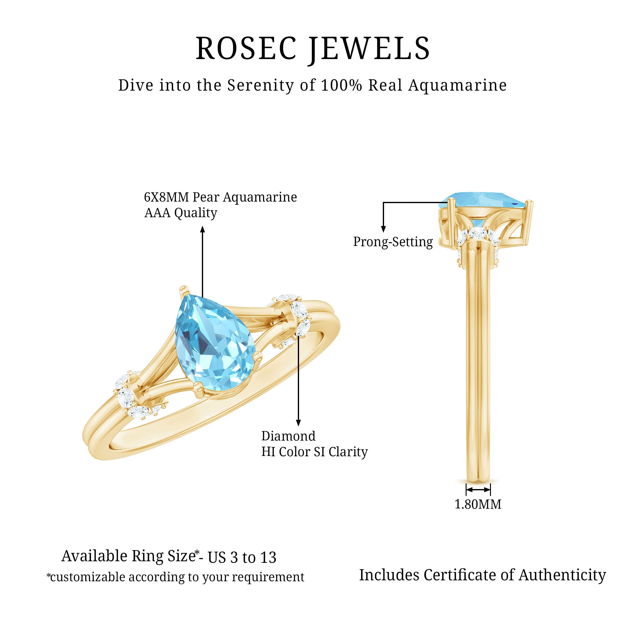 Elevate your style with a touch of royal purple by wearing an Aquamarine Solitaire Ring every day. This ring features a stunning Pear Shape Aquamarine as the centerpiece, held securely by a Prong Setting. The delicate hoops of Round Shape Diamond on either side add extra brilliance, enhancing its beauty. With a Split Shank design, this Certified Aquamarine Ring combines classic elegance with a bold appeal, making it a coveted addition to your jewelry collection.