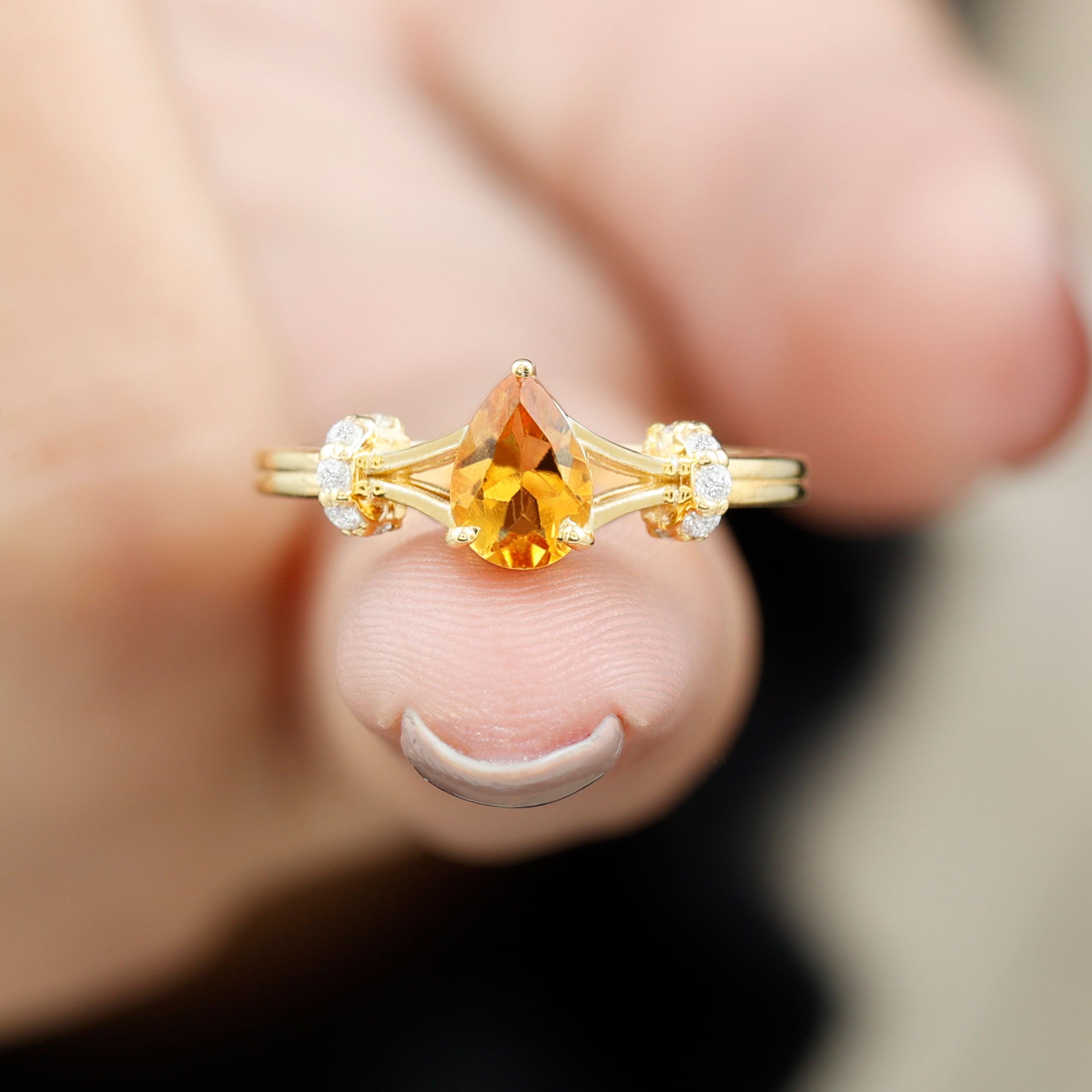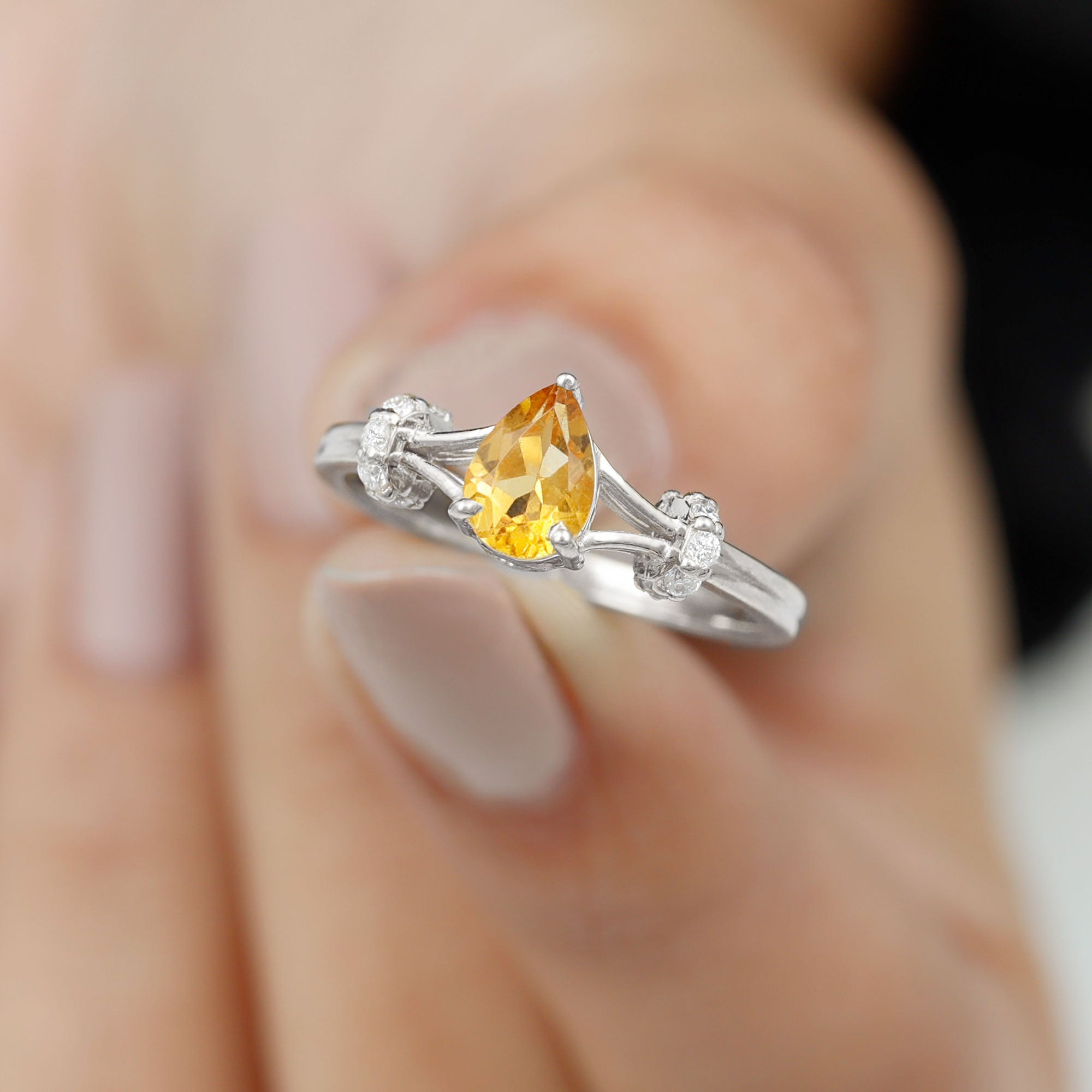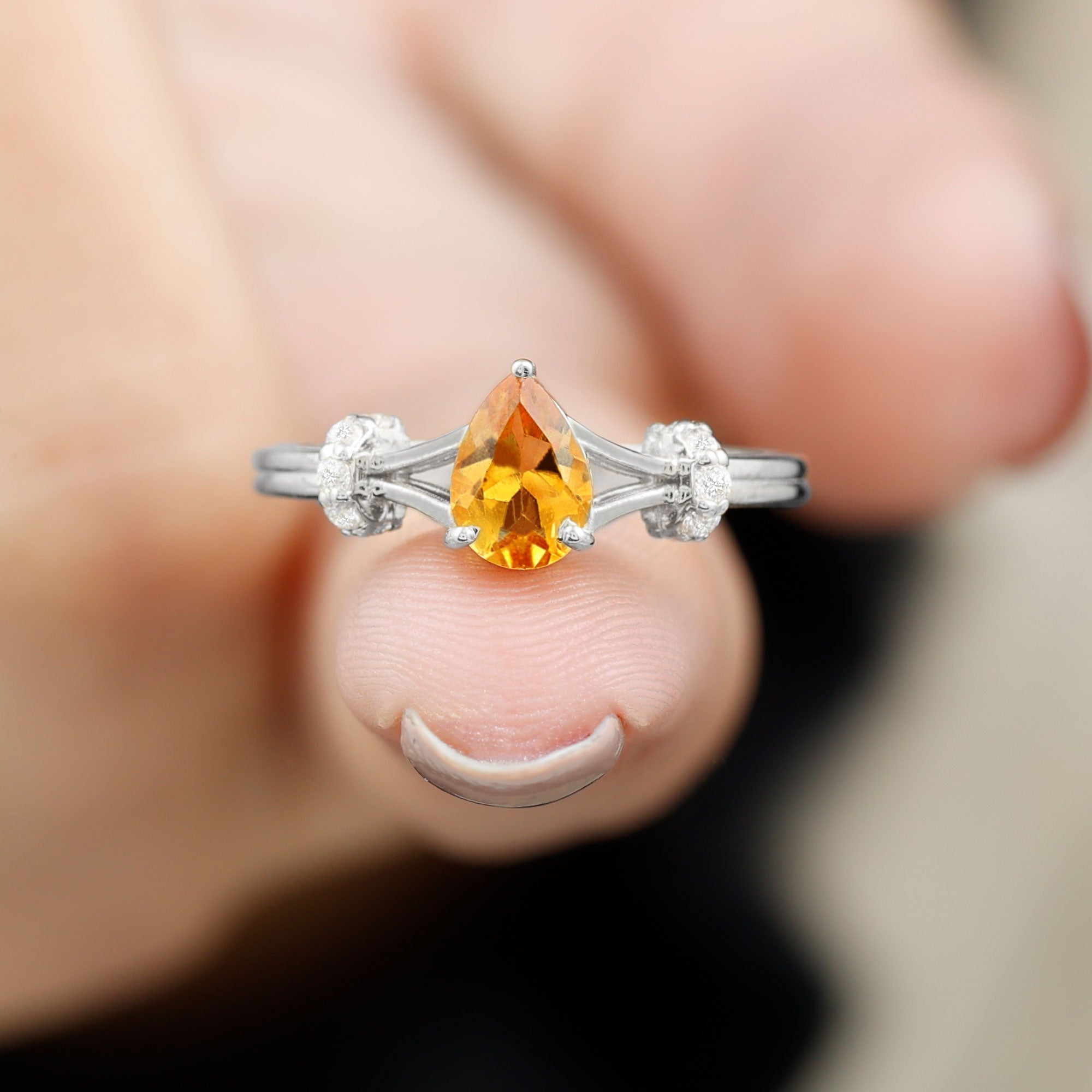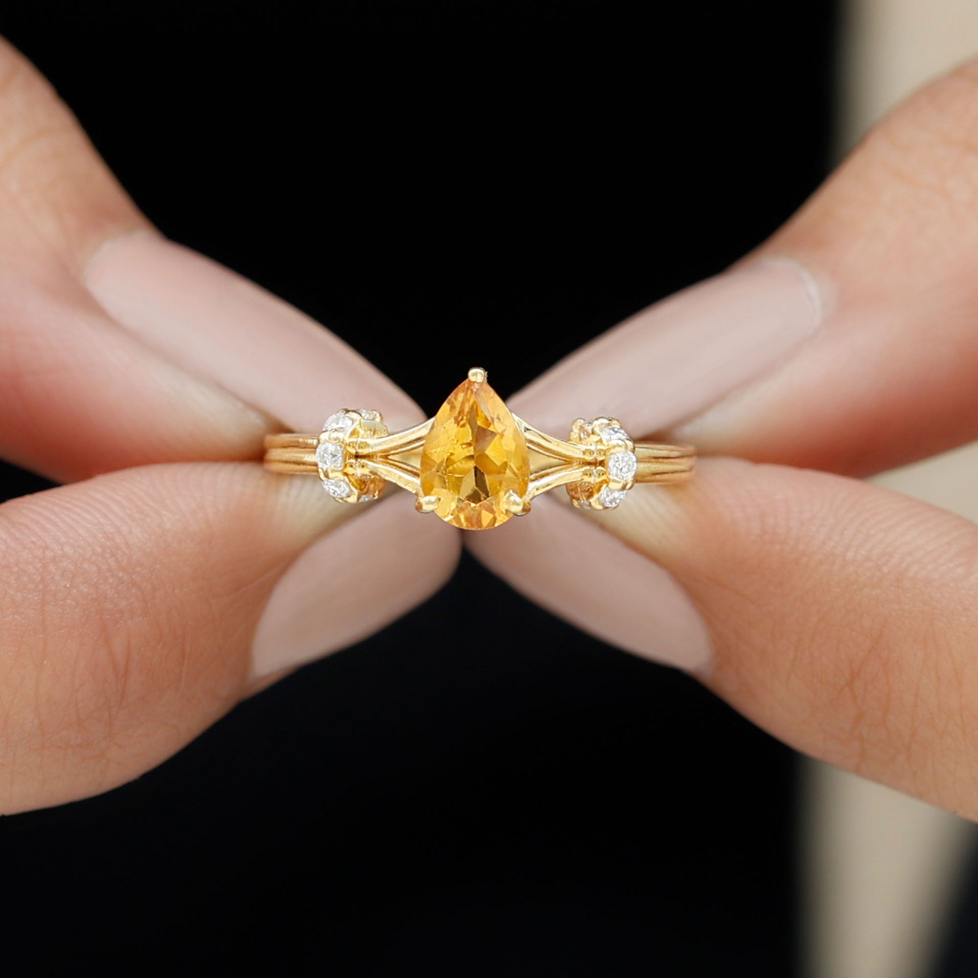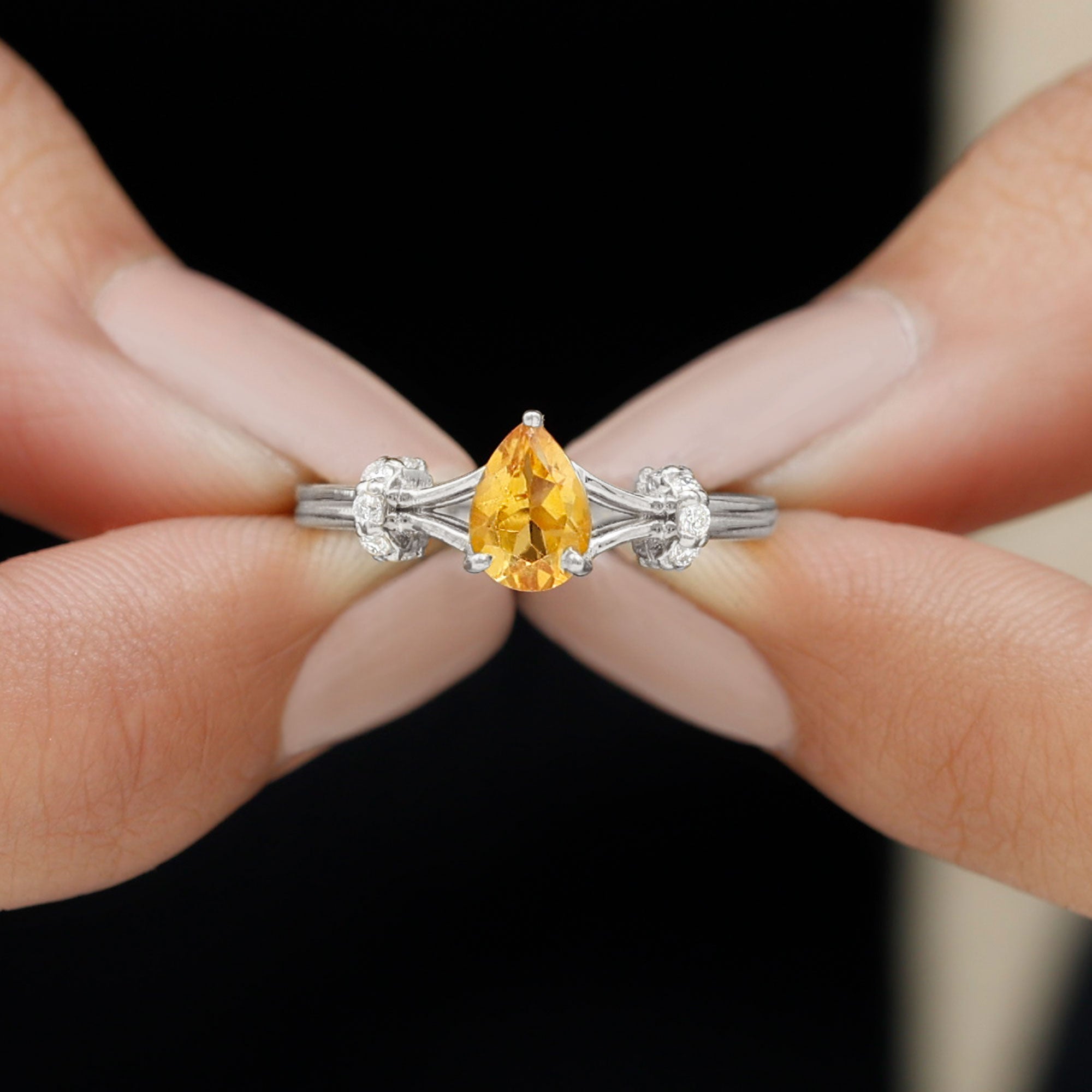 Infuse your daily outfits with a touch of classiness when you wear this everyday Citrine Solitaire Ring. Its main attraction is the Pear Shape Citrine, securely cradled by a Prong Setting, exuding a royal charm. Petite Round Shape Diamonds on each side add an extra layer of brilliance, enhancing its allure. The Split Shank design of this Citrine Ring combines classic and bold elements, making it a distinctive appeal that captures attention effortlessly.