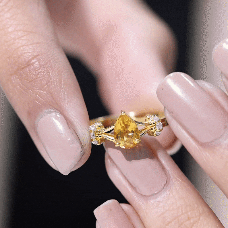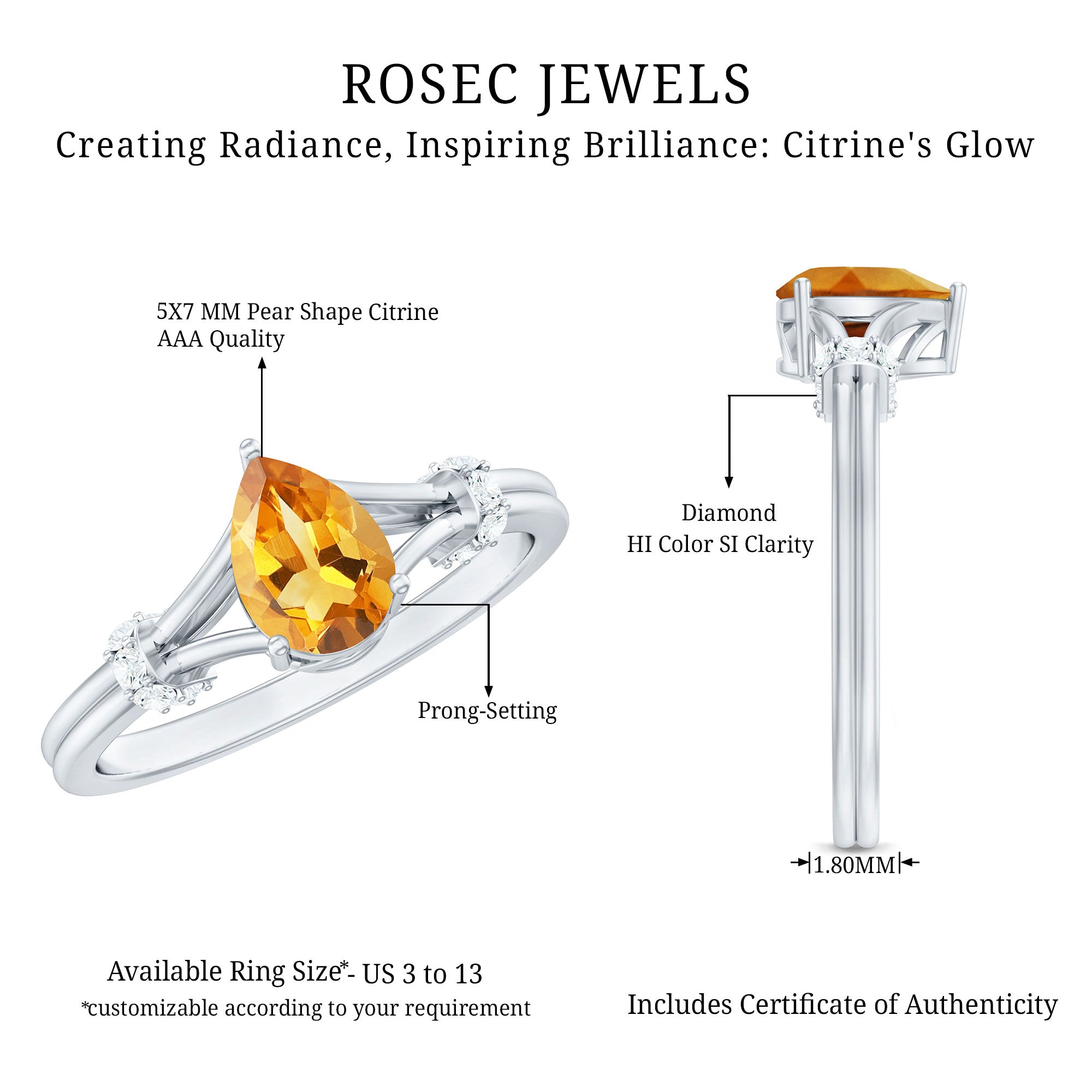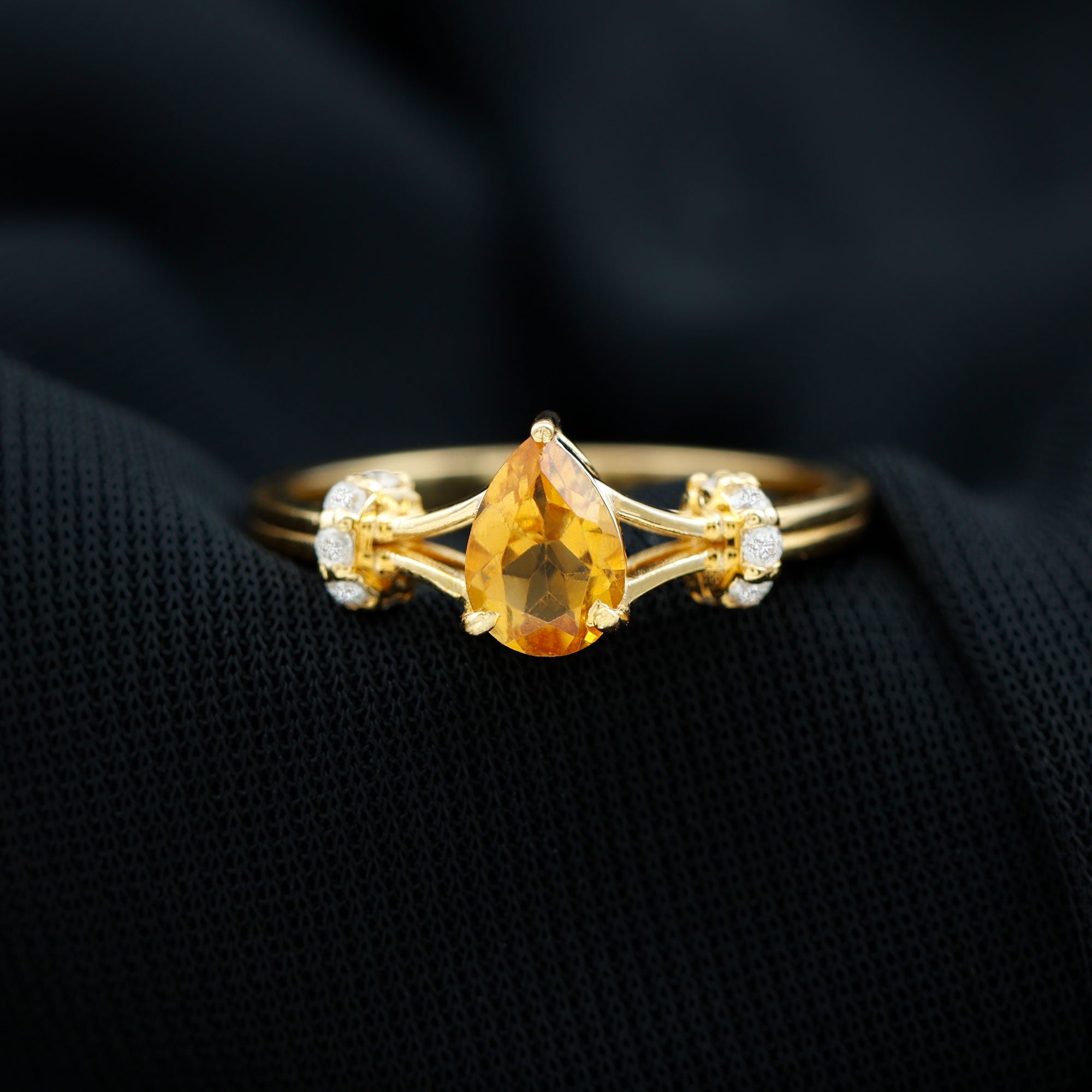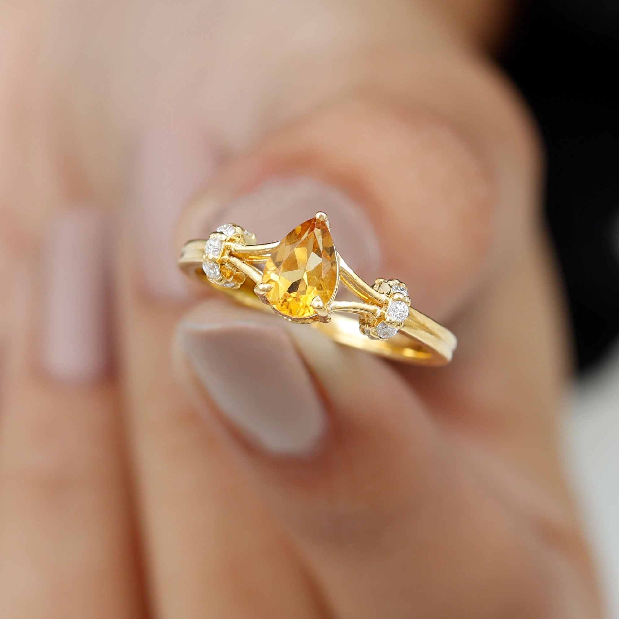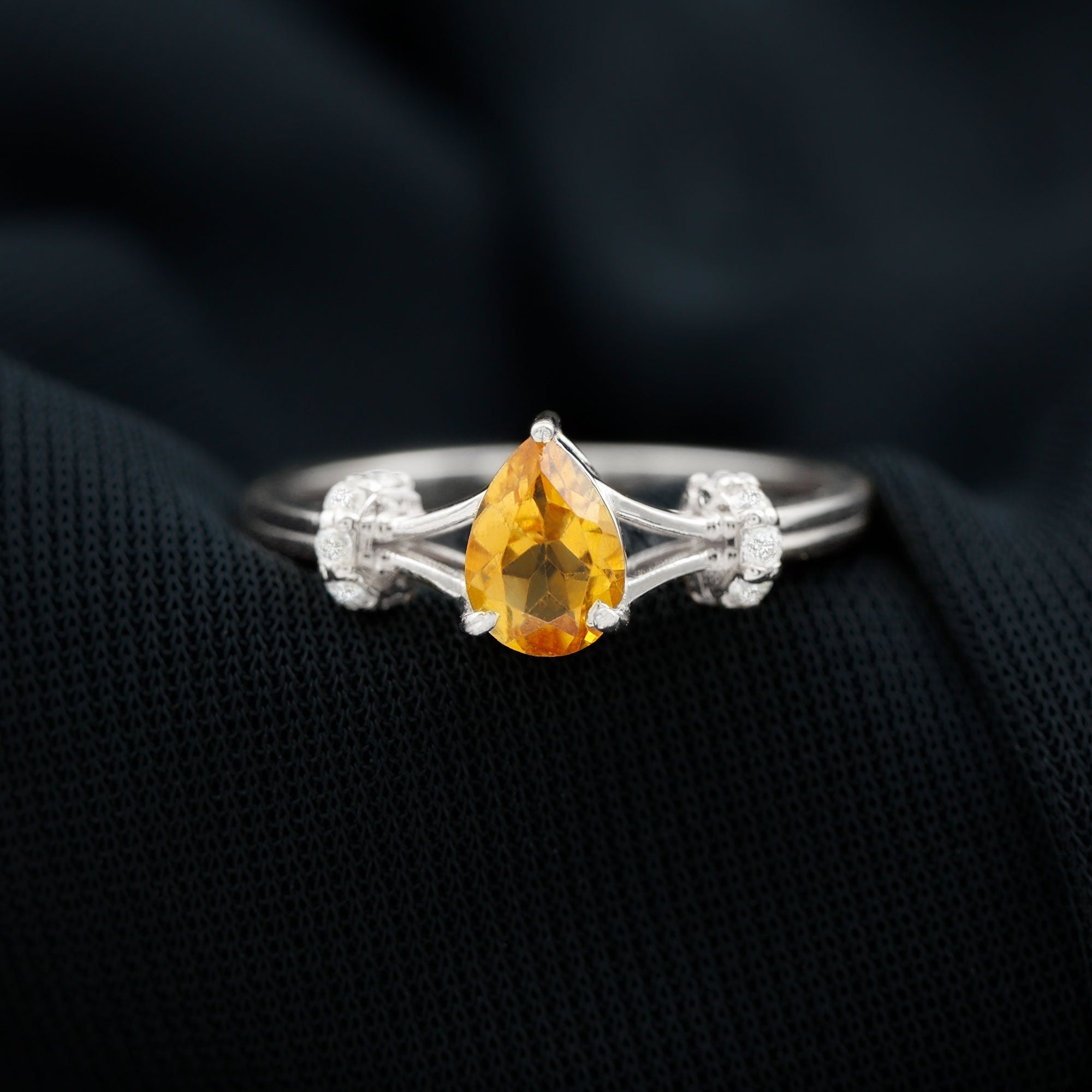 Infuse your daily outfits with a touch of classiness when you wear this everyday Citrine Solitaire Ring. Its main attraction is the Pear Shape Citrine, securely cradled by a Prong Setting, exuding a royal charm. Petite Round Shape Diamonds on each side add an extra layer of brilliance, enhancing its allure. The Split Shank design of this Citrine Ring combines classic and bold elements, making it a distinctive appeal that captures attention effortlessly.
