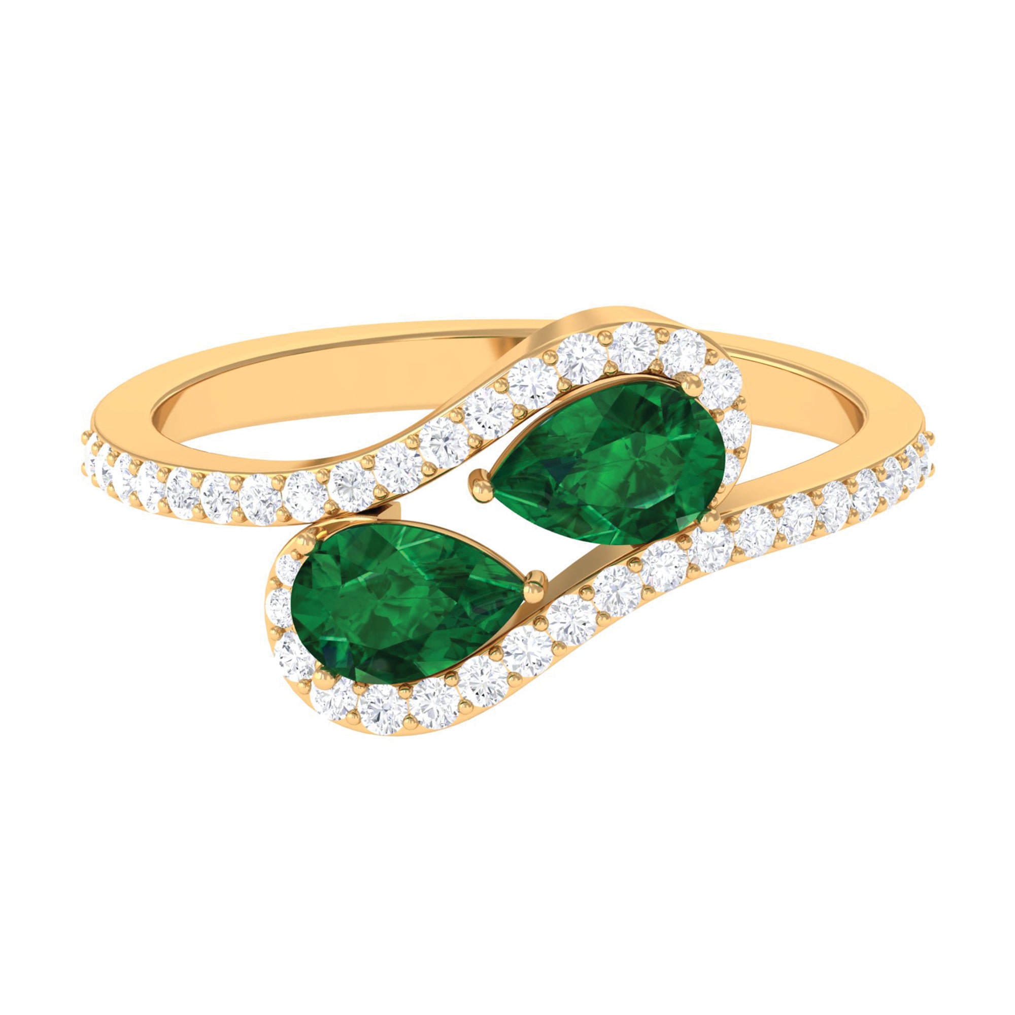 This engagement ring features a pear shape created emerald set within a flowing bypass design, accented by diamonds. The composition highlights vibrant color, graceful structure, and a contemporary engagement-ready silhouette.
