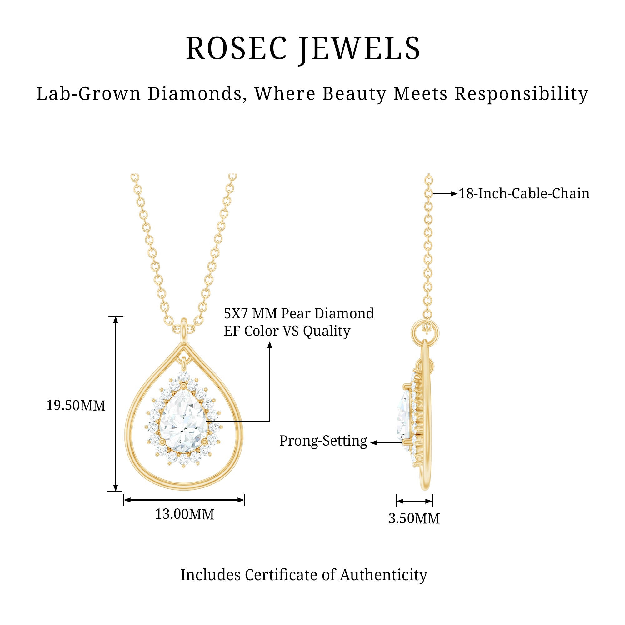 Elevate your style with this charming Teardrop Pendant Necklace featuring a brilliant Pear Shape Lab Grown Diamond, elegantly encircled by a sparkling halo of Round Lab Grown Diamonds. This Pendant adds a touch of sophistication to your ensemble and exudes timeless elegance. Its timeless design and captivating shimmer make it the perfect accessory for any occasion, whether youre dressing up for a special event or adding a touch of glamour to your everyday look.