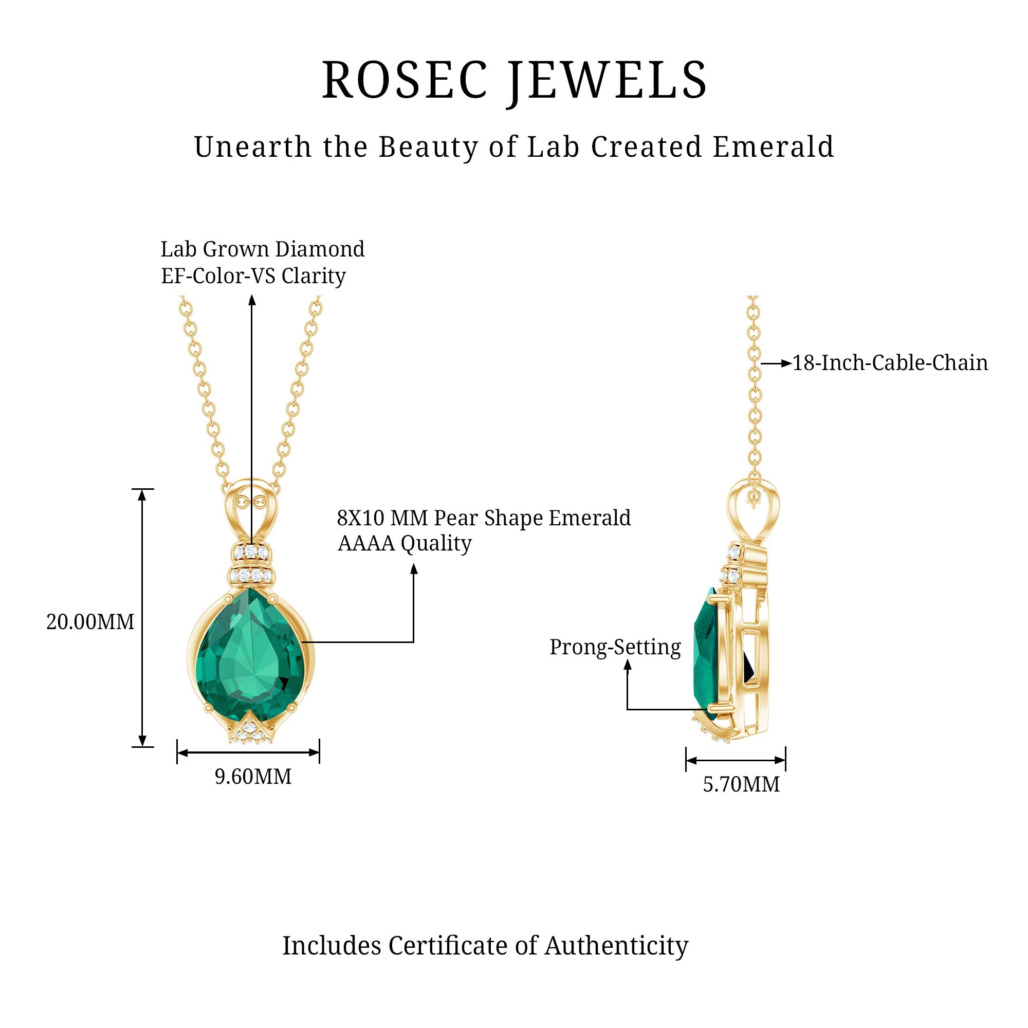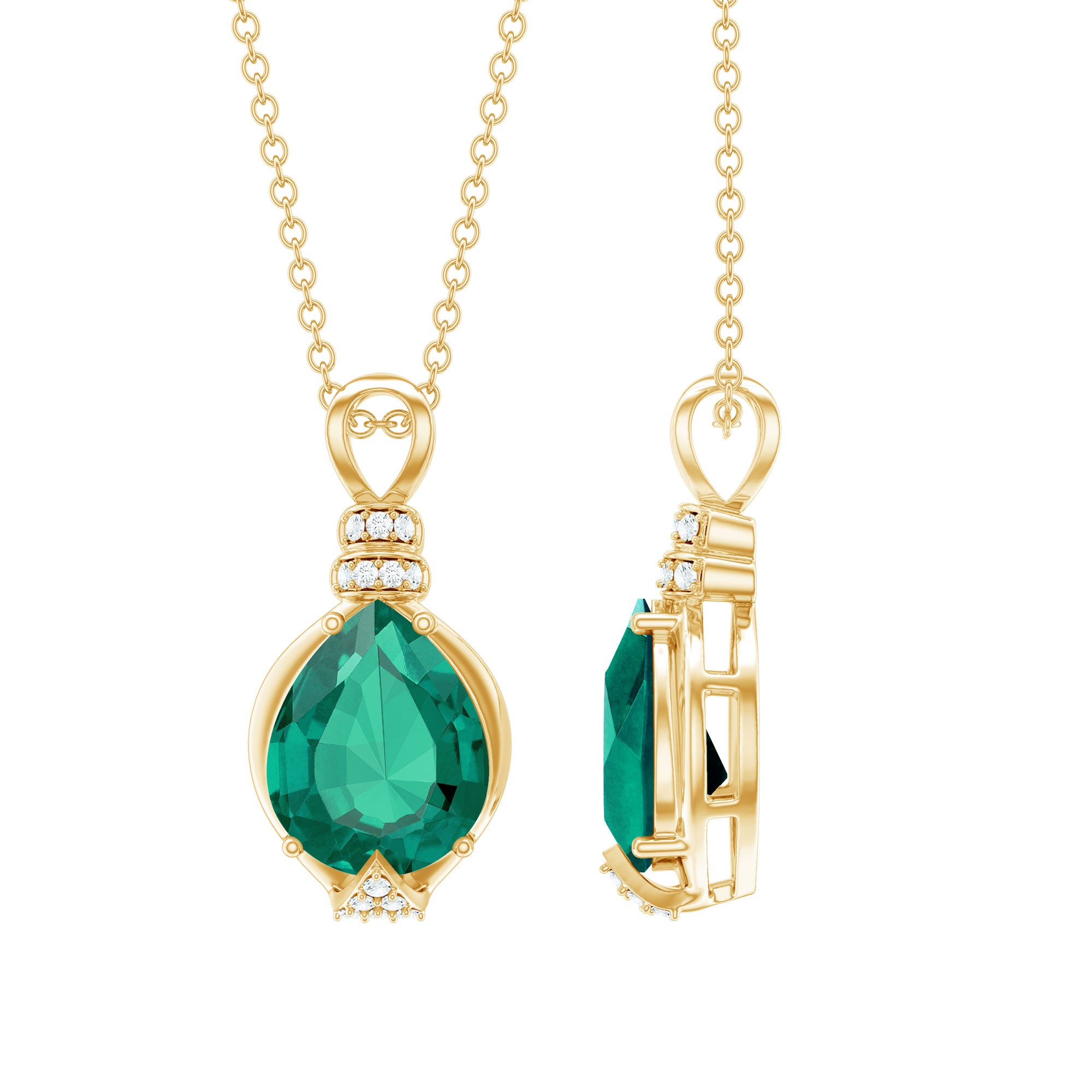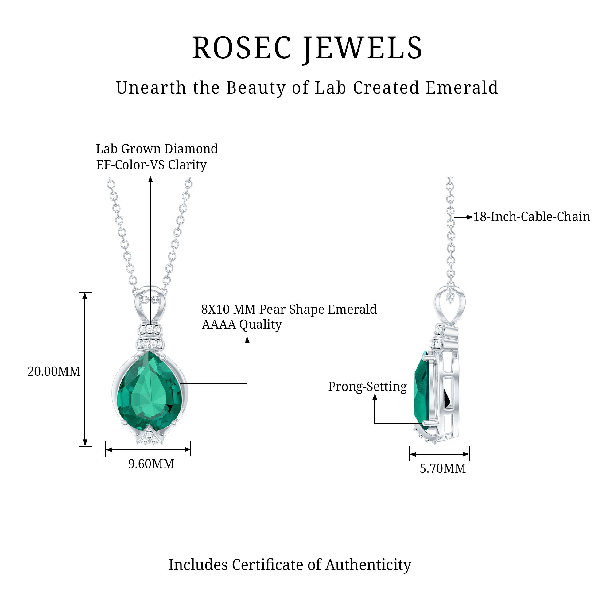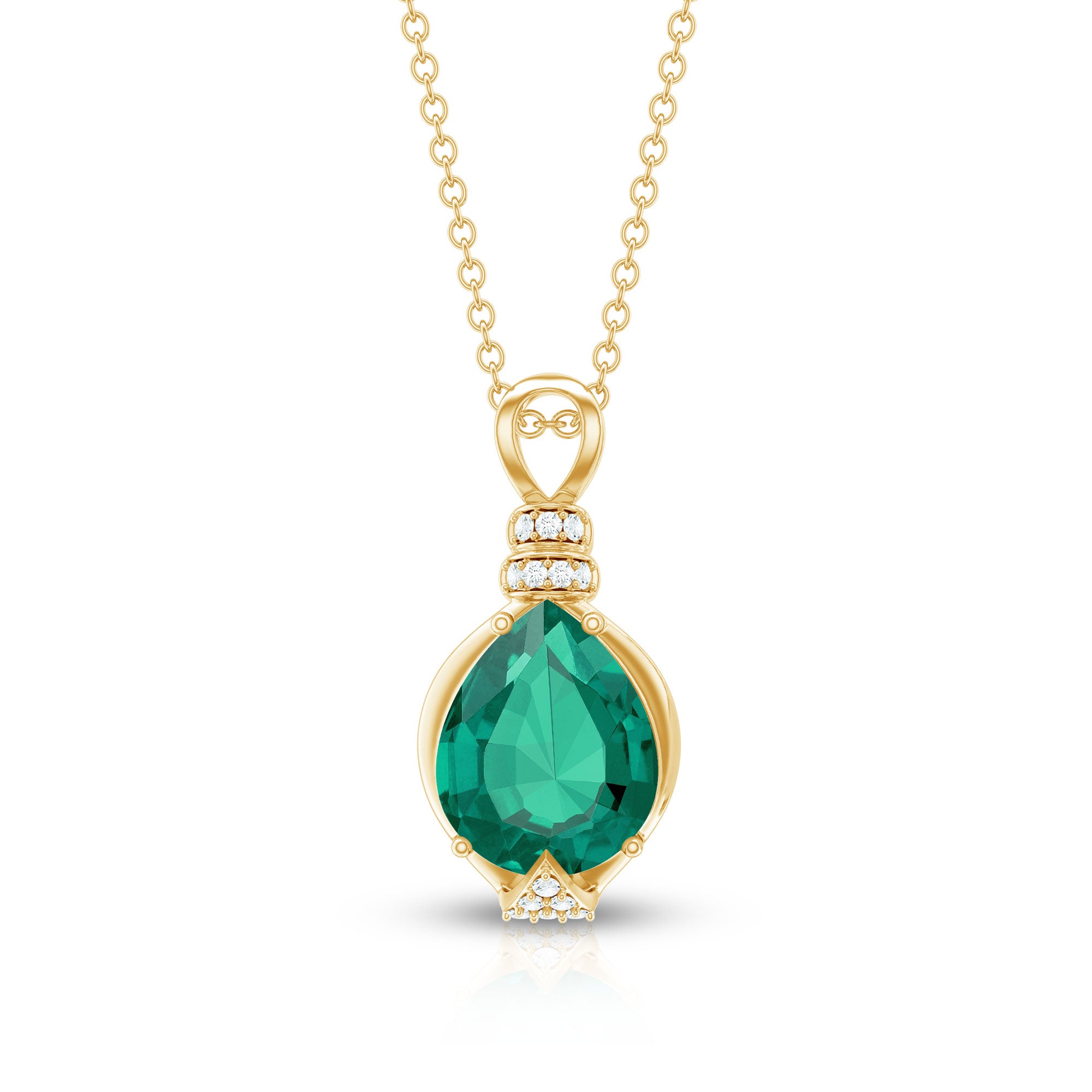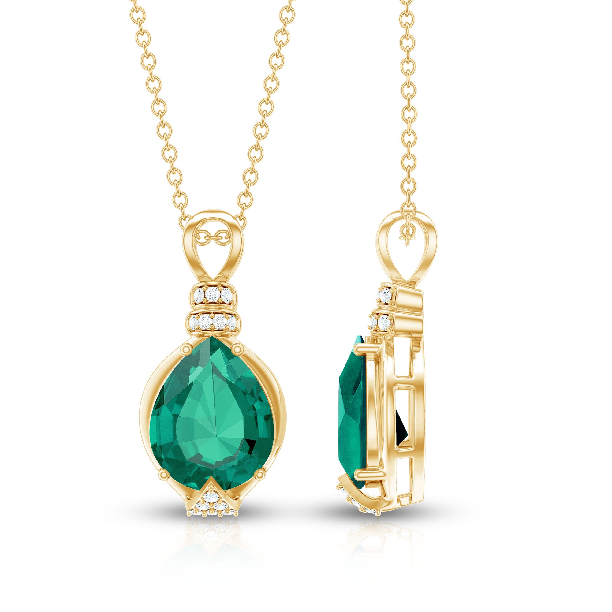 Grab attention with this mesmerizing Solitaire Pendant Necklace, a timeless marvel of elegance and sophistication. This Statement Pendant Necklace features an 8X10 mm Pear Shape Lab Created Emerald set in Prong Setting, highlighted by sparkling Diamond gemstones (Synthetic). Meticulously crafted with Aaaa Quality Emerlad and Ef-Vs Quality Diamond, renowned for merging ethical practices with unparalleled craftsmanship. Indulge in the allure of sustainable opulence with this breathtaking Emerald and Diamond Pendant.