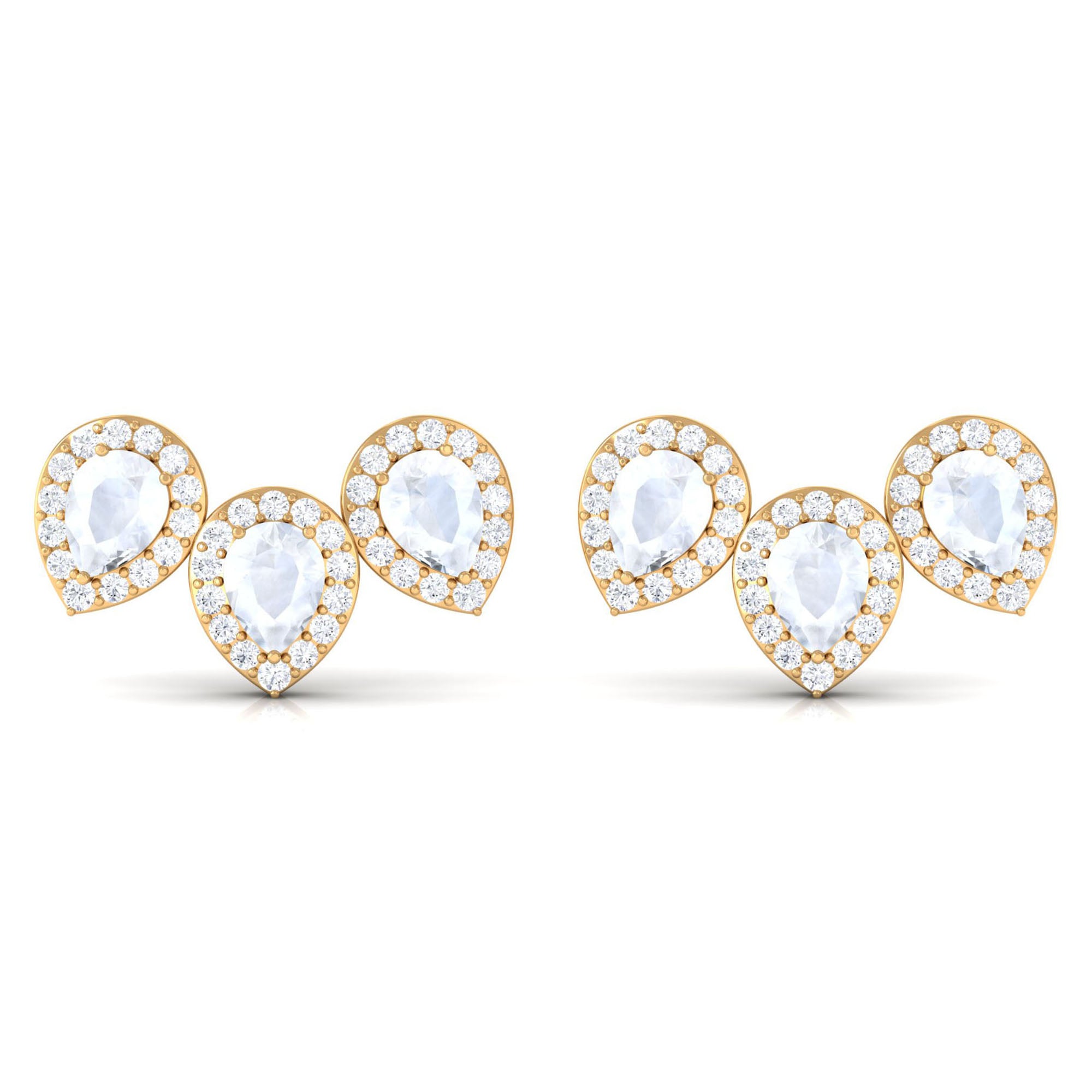 Indulge in timeless elegance with these Moonstone Stud Earrings. They feature three Pear Shape Moonstones set securely in a Prong Setting, each surrounded by Diamond Halo. These Bridal Earrings offer a trendy and stylish choice for various occasions. Seal your promise to your beloved with the beauty of Moonstone and Diamond in these Three Stone Earrings.