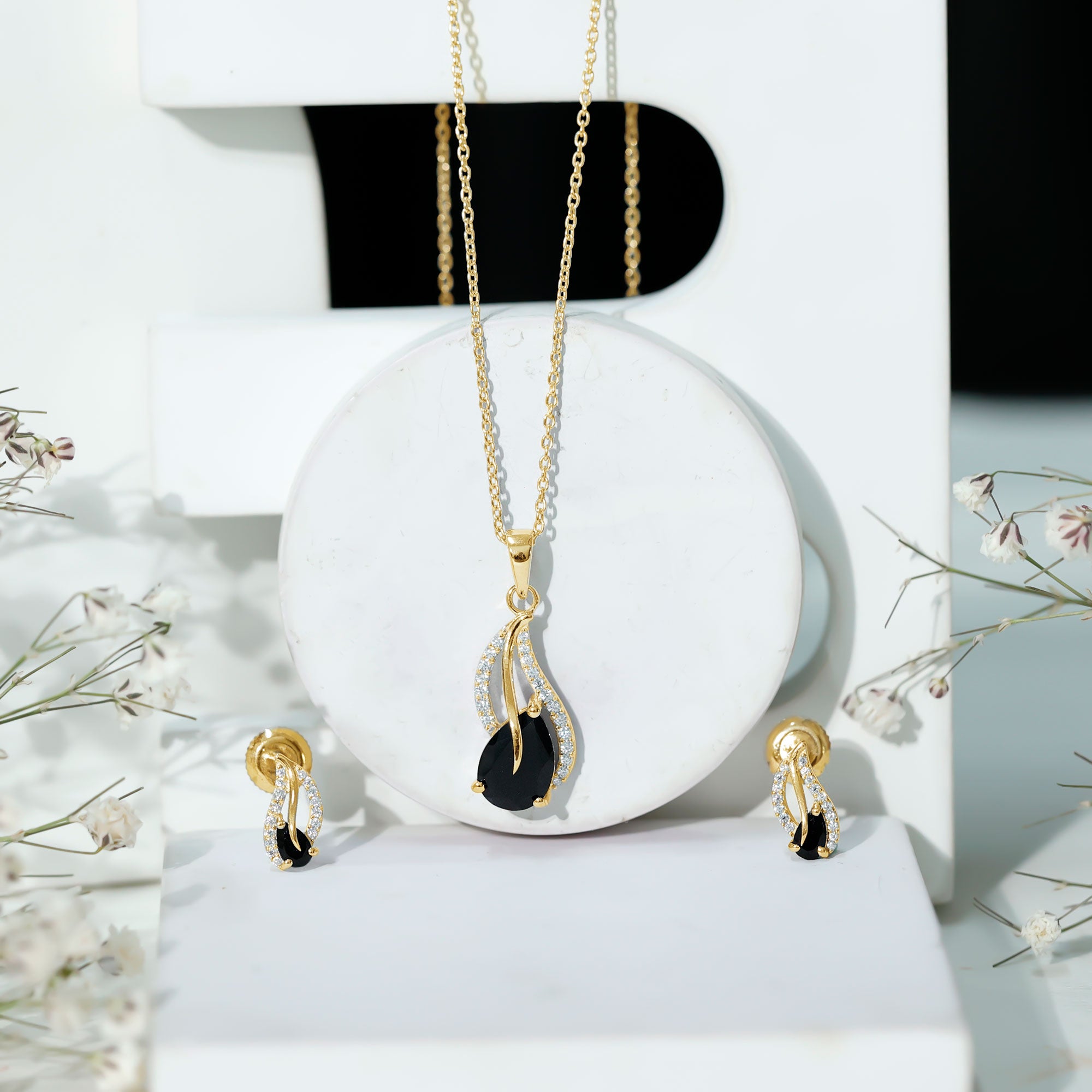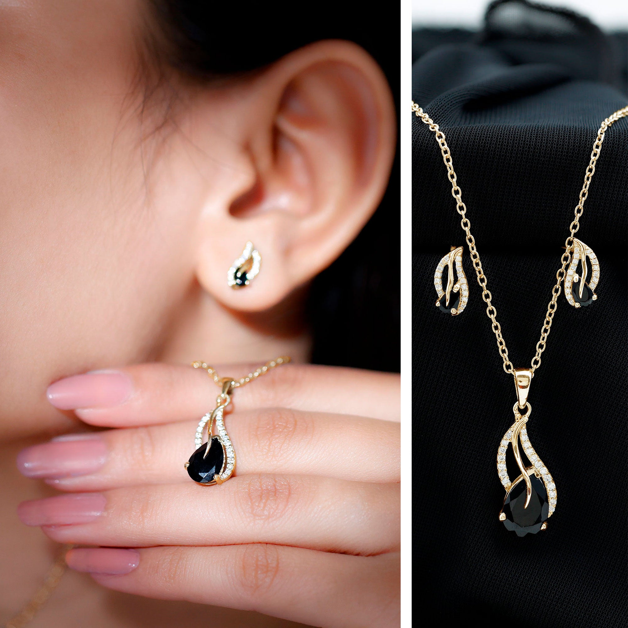 Pear Shaped Black Onyx Necklace and Earrings Set with Moissanite