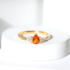 Shine elegantly with this stunning and glistening Teardrop Ring. The Pear Cut Fire Opal in Claw Setting with Diamond as Trio on Solitaire Ring.