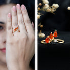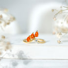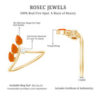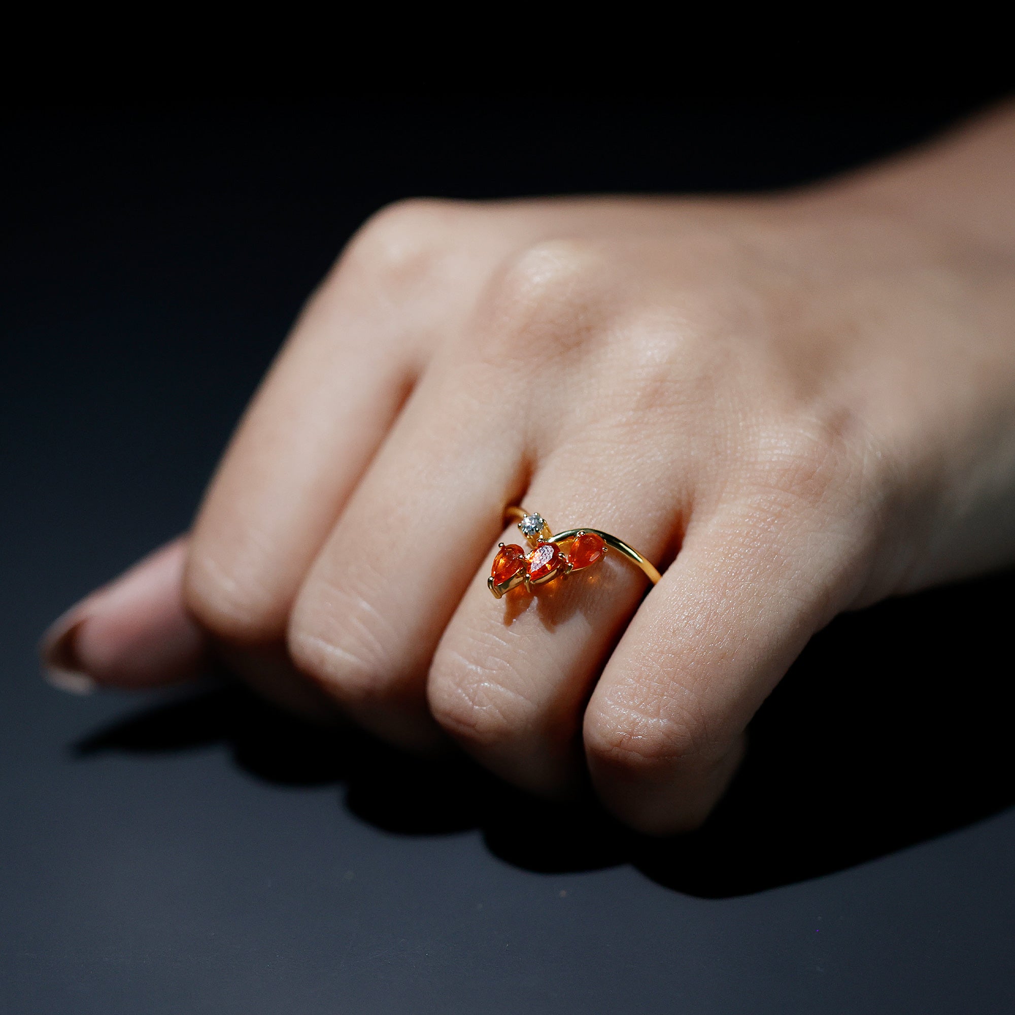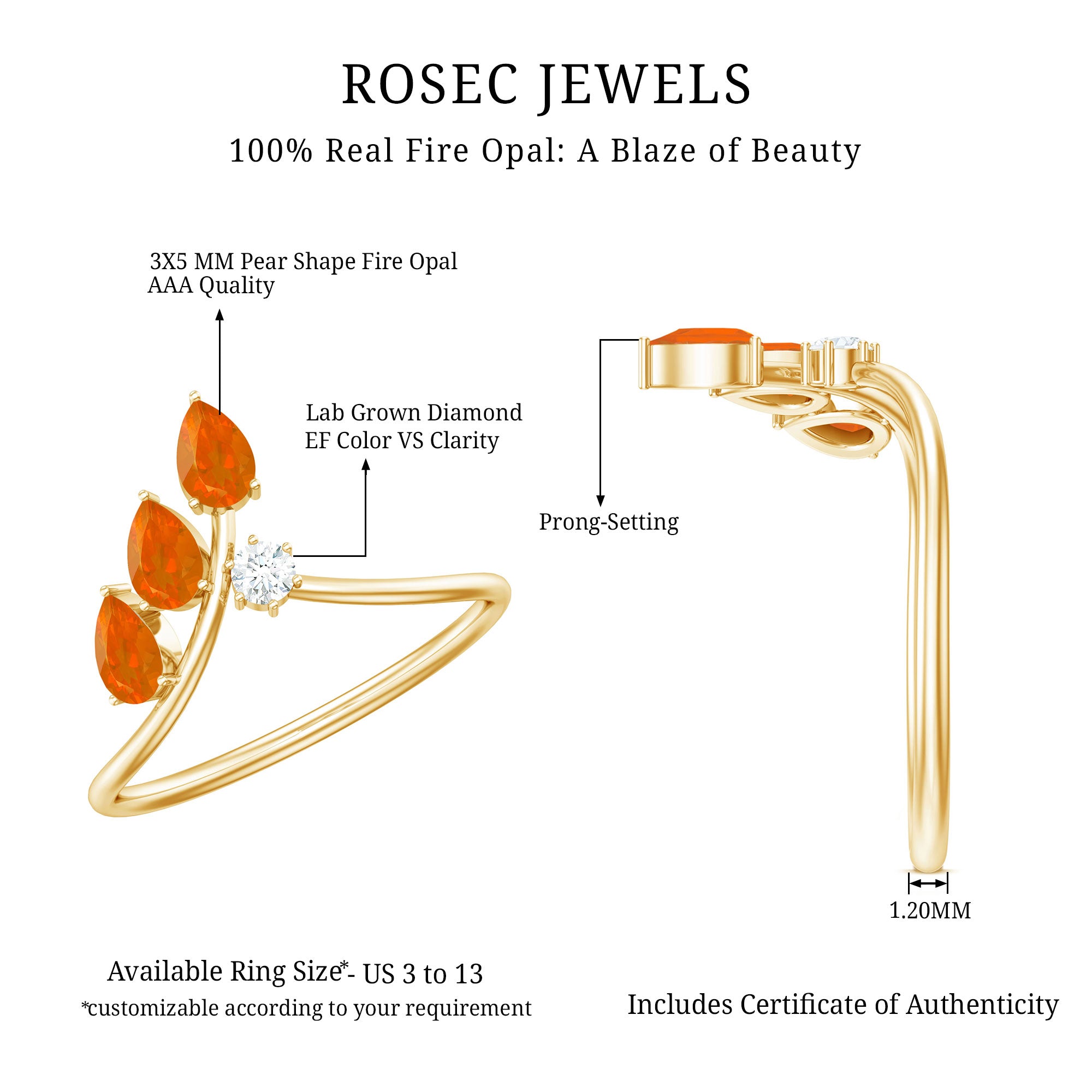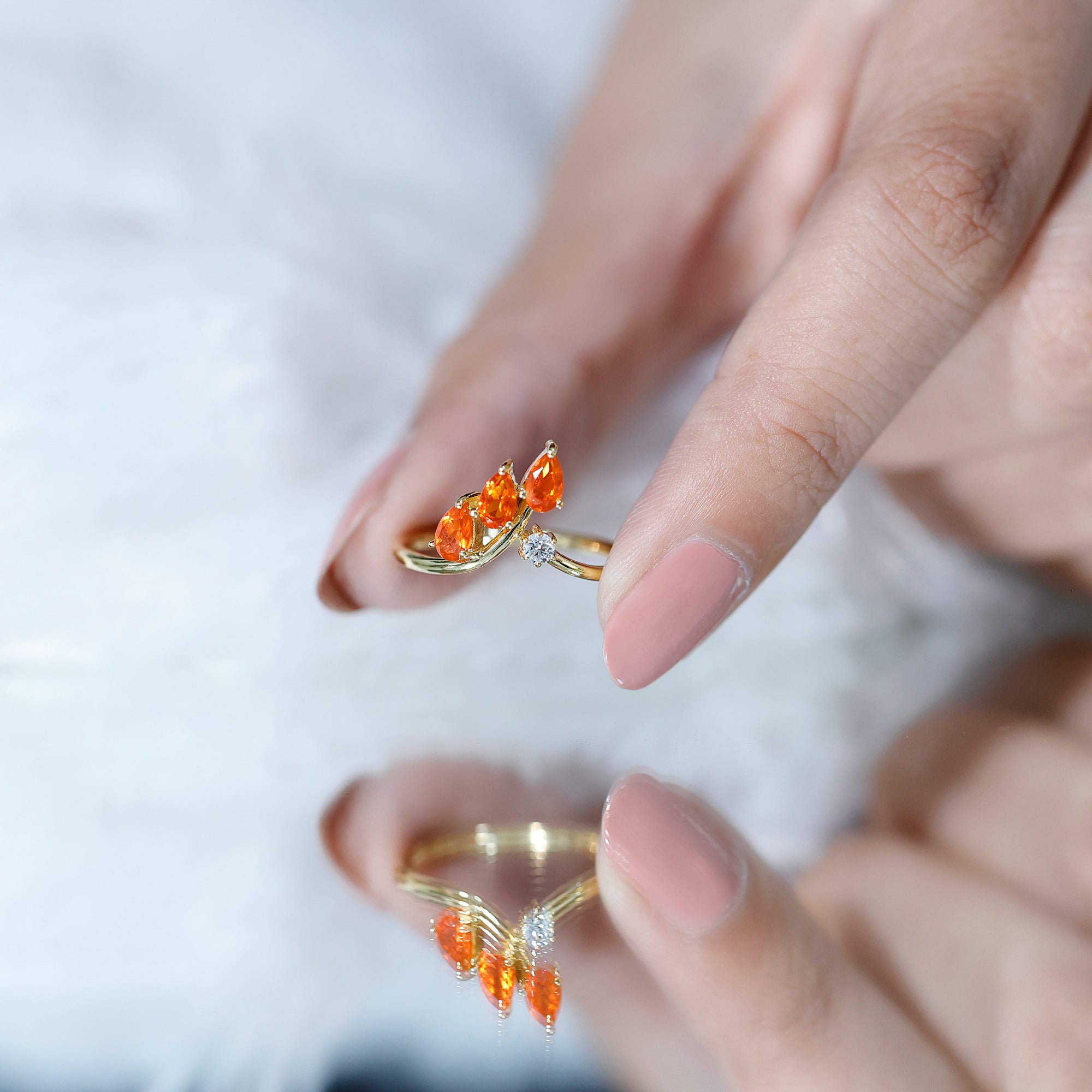 Upgrade the look of your engagement ring with a radiant, nature-inspired touch with this Fire Opal Stacking Ring. Designed to resemble a delicate leaf, this elegant Ring Enhancer beautifully blends the charm of nature with modern simplicity, making it perfect for those who appreciate meaningful and stylish jewelry. Handcrafted in yellow gold plated silver, this stunning piece features a sparkling round lab created diamond, securely held in prong setting. Just above it, three glowing pear shaped fire opals are arranged in a graceful, leaf-like shape. Their warm orange hue brings life and energy to the ring, creating a beautiful contrast with the cool brilliance of the diamond. The band of the ring features a unique chevron or V shape, which gently wraps around the finger. This shape not only enhances its elegant look but also makes it ideal as an Engagement Ring Enhancer or a stackable ring to pair with other favorites in your collection. The high-polish finish on the band adds a sleek, modern feel while letting the gemstones take center stage. Crafted with care and attention to detail, this Fire Opal and Diamond Ring is a symbol of growth, love, and renewal. A perfect blend of color, sparkle, and nature-inspired design, this Fire Opal Ring Guard is sure to become a treasured favorite. It comes in a ready-to-gift jewelry box, making it an ideal present for anniversaries, birthdays, or simply to celebrate a beautiful moment.