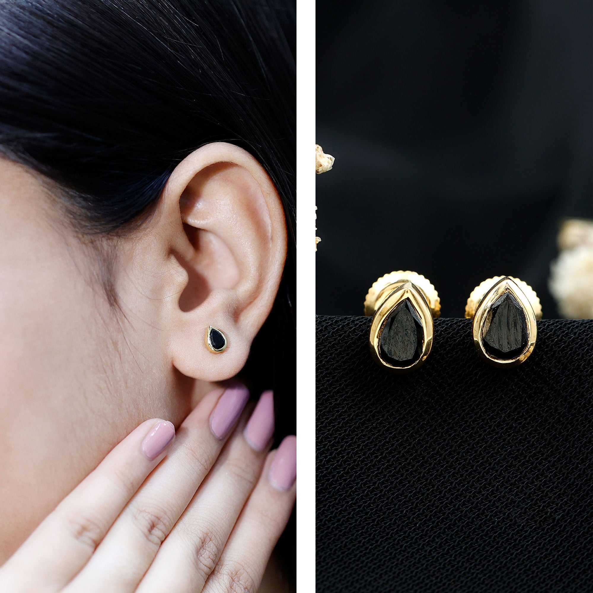 Add just the right amount of charm and elegance to your everyday style with these Black Diamond Stud Earrings. Designed for simplicity with a touch of bold charm, these studs are crafted in 14K yellow gold plated silver, making them the perfect balance of classic and contemporary. Each earring features a 5X7 MM pear shaped lab created black diamond, set in bezel setting that hugs the gem securely while keeping the look smooth and refined. These Teardrop Earrings are fitted with secure screw back closures, giving you that extra layer of comfort and peace of mind. Whether you are heading to the office, meeting friends, or stepping out for a dinner date, these Black Diamond Earrings stay in place effortlessly and complement everything from casual to formal looks. If you are looking for a meaningful gift, these Solitaire Studs make a thoughtful option, perfect for birthdays, anniversaries, or just to celebrate a personal moment. These Pear Shaped Earrings are designed to be a versatile go-to, understated, elegant, and full of personality.