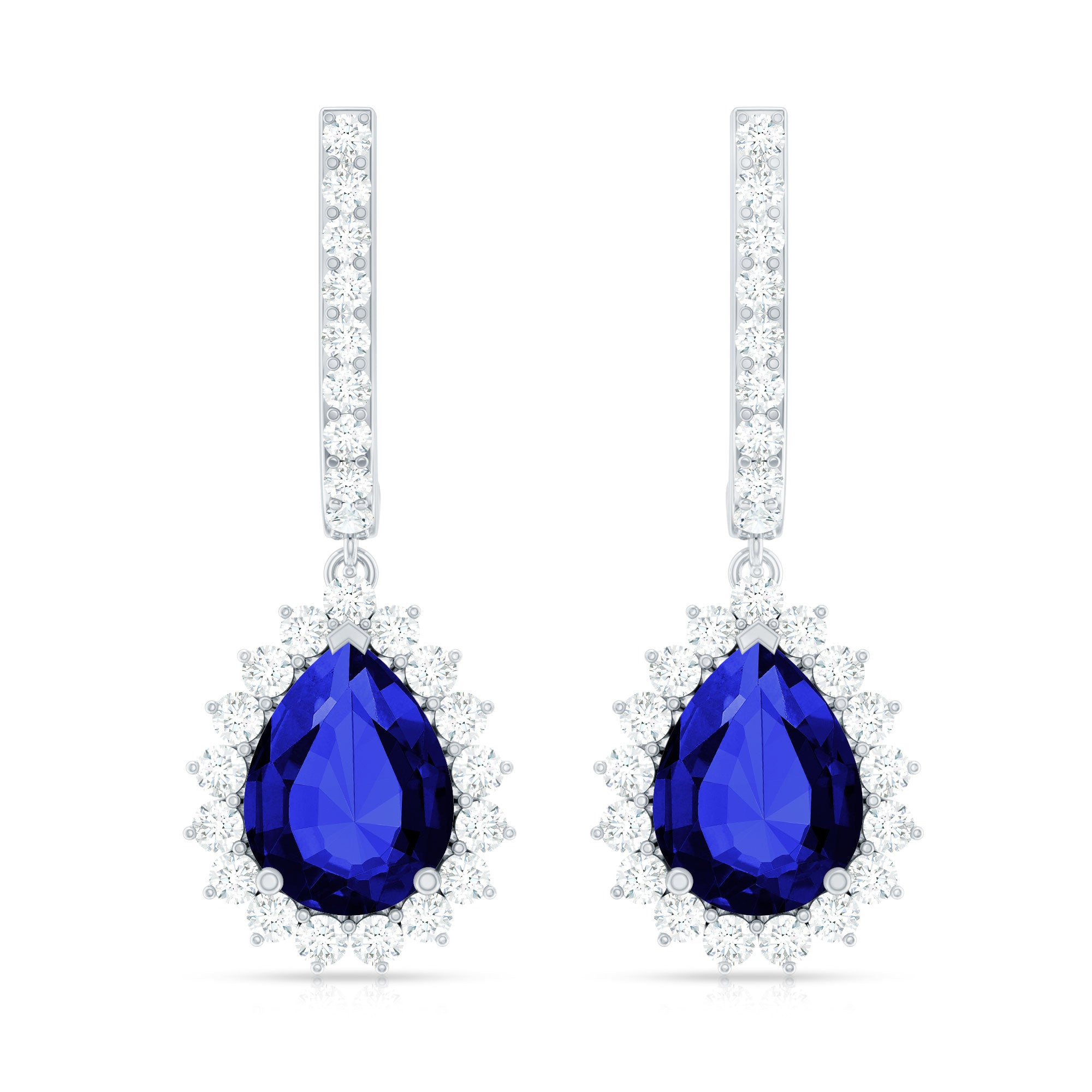 Pear Shaped Lab Grown Blue Sapphire and Diamond Hoop Drop Earrings