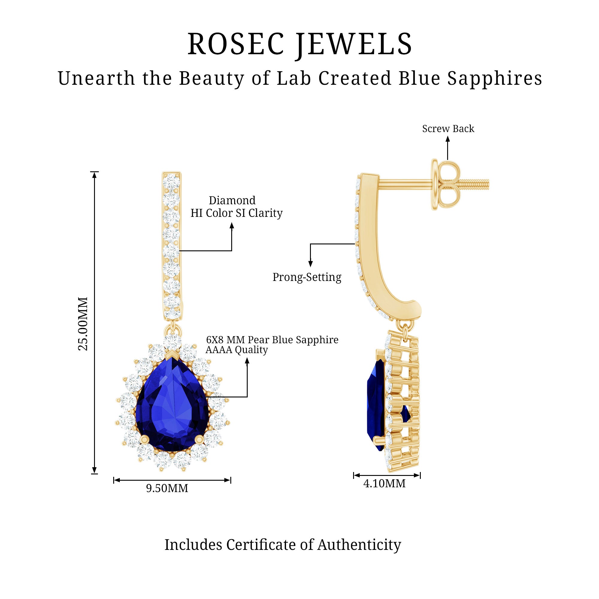 Perfect for the bride who wants elegance with a modern twist, these Blue Sapphire and Diamond Earrings are designed to turn heads on the big day. Featuring a 6X8 MM pear shaped lab created blue sapphire as the centerpiece, each earring is set in secure prong setting and surrounded by a sparkling round brilliant cut diamond halo. The teardrop shape is hanging from a J hoop, which is also adorned with round cut diamonds, adding extra shine and a graceful flow. Crafted with AAAA quality lab created sapphires and HI-SI quality diamonds, these Teardrop Earrings combine timeless sophistication with contemporary charm. Their subtle yet striking design makes these Wedding Earrings for Bride versatile enough for both wedding day glamour and special occasions afterward. Secure screw back closures ensure comfort and reliability, allowing you to enjoy your celebration without worry. These Lab Created Blue Sapphire Earrings are a statement of refined taste, blending depth and brilliance in every detail. They are designed for brides who want jewelry that feels luxurious without being overwhelming, creating a look that is effortlessly bold and memorable.