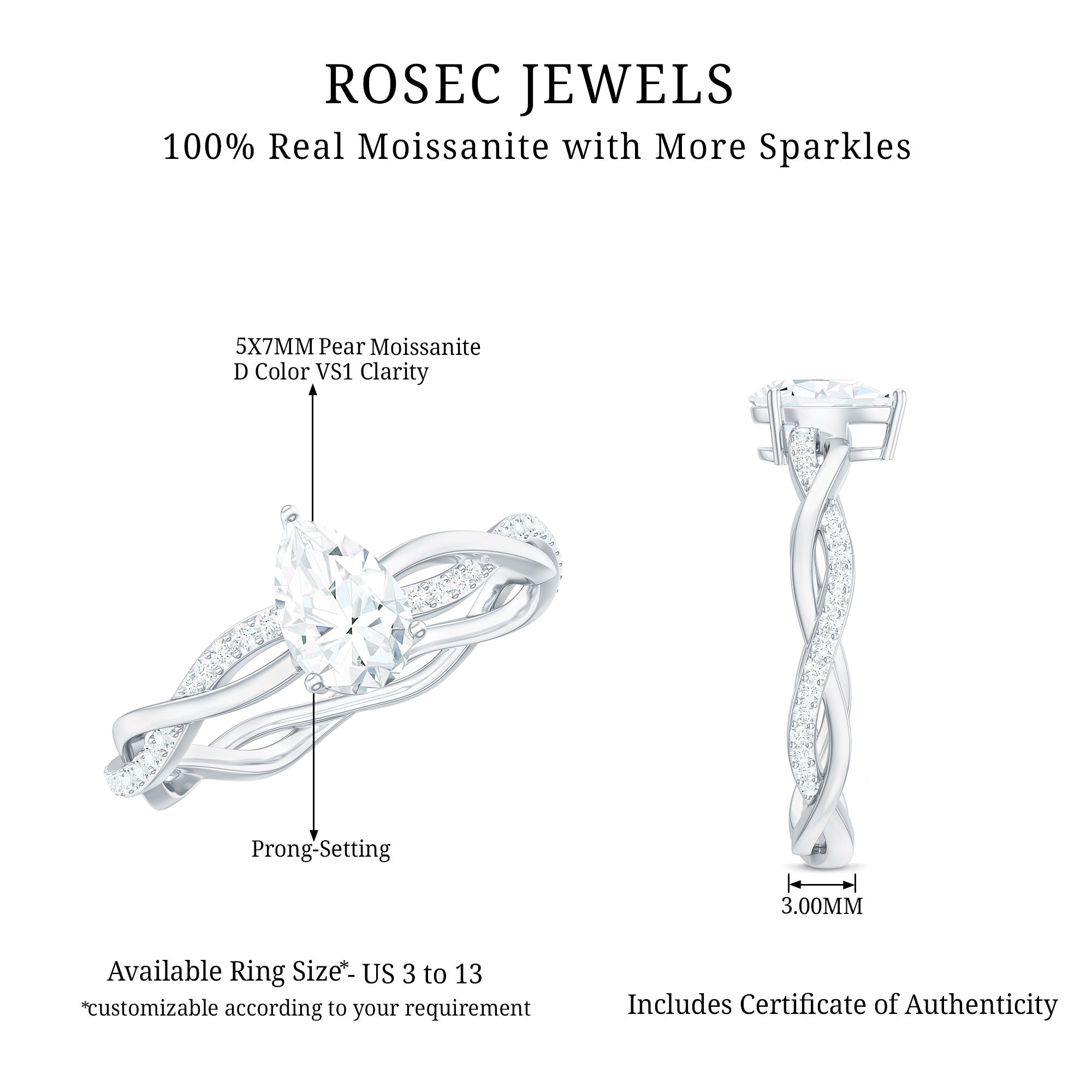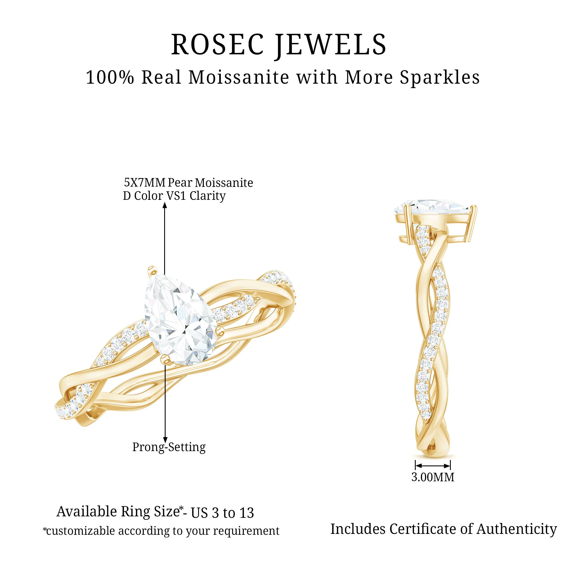 Adorn yourself with this stunning Moissanite ring and make a fashion statement wherever you go. The Pear-Cut 5X7 MM Moissanite solitaire, set in a 3-Prong setting, with round-cut Moissanite accents on a braided band, is a must-have for your jewelry collection. Crafted in solid gold with a twisted shank, this ring is sure to grab attention and make you feel special all day. With a total weight of 1 carat and a D color VS1 clarity, our certified gemstones undergo strict quality control to ensure their exceptional brilliance.