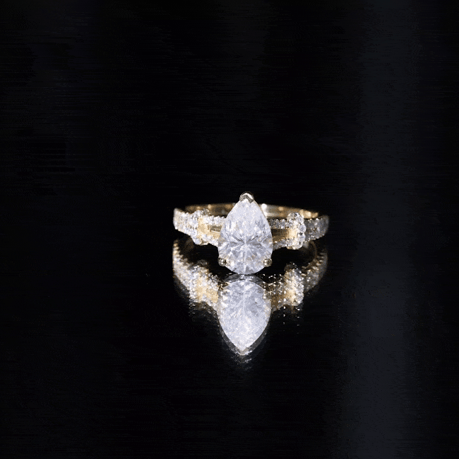 Celebrate your love story with this dazzling Moissanite Engagement Ring. Featuring a Pear-shaped Moissanite, this ring is set in a three-prong setting, placed at the center of the Solid Gold metal band. The rings beauty is further enhanced by the sparkling Side Stones along the split shank. With a total weight of 2.25 Carats and the quality of D Color VS1 Clarity, this ring is guaranteed to leave her speechless. Our gemstones are certified and undergo strict quality checks for your peace of mind.
