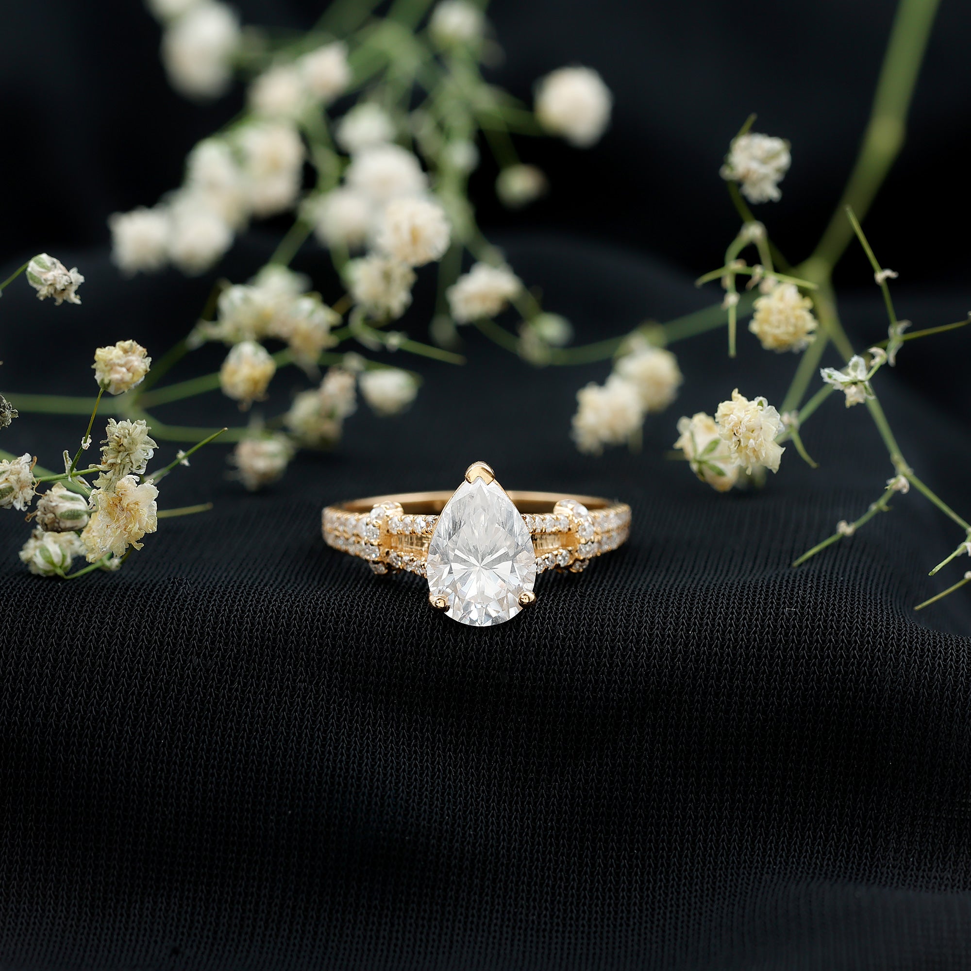 Pear Shaped Moissanite Solitaire Engagement Ring in Split Shank