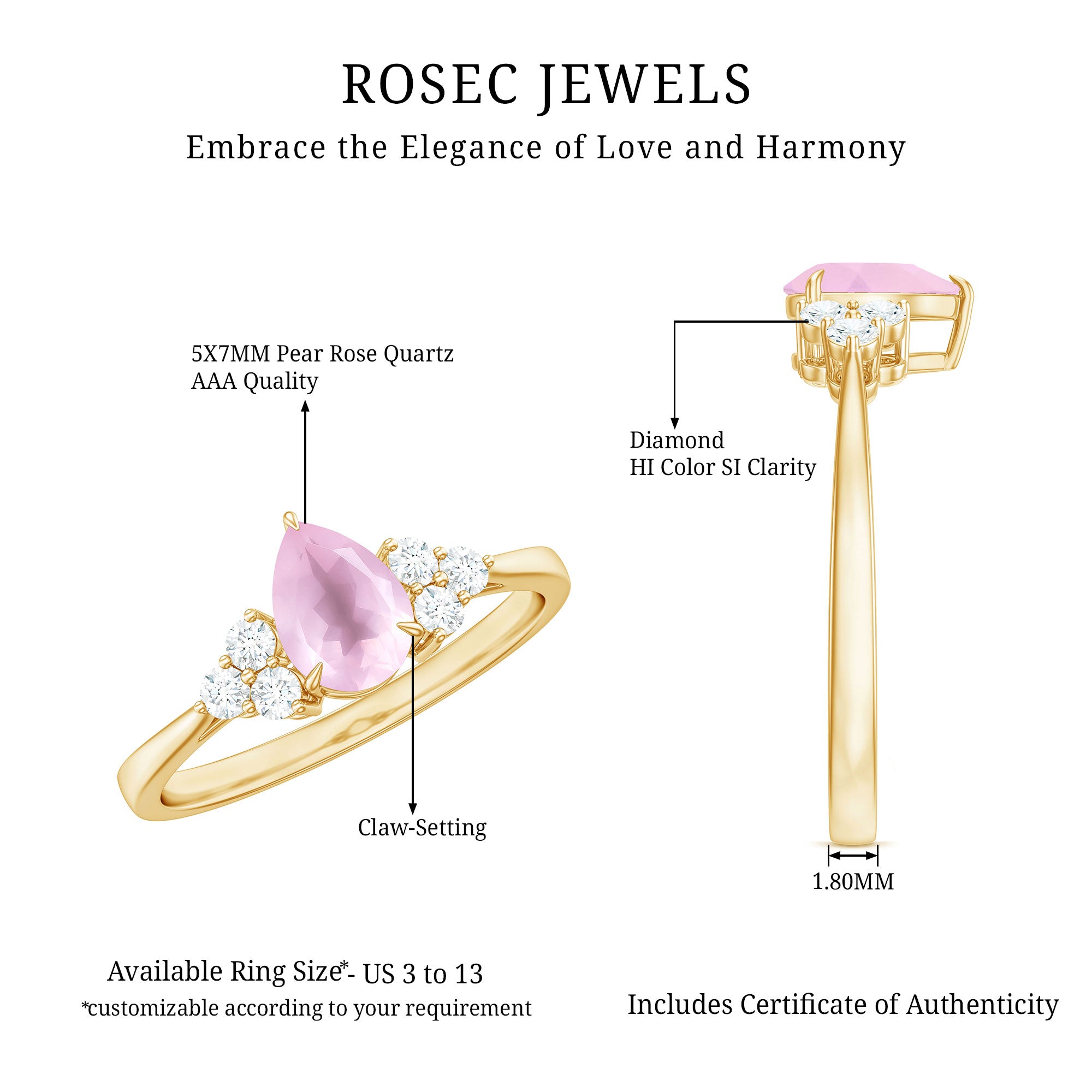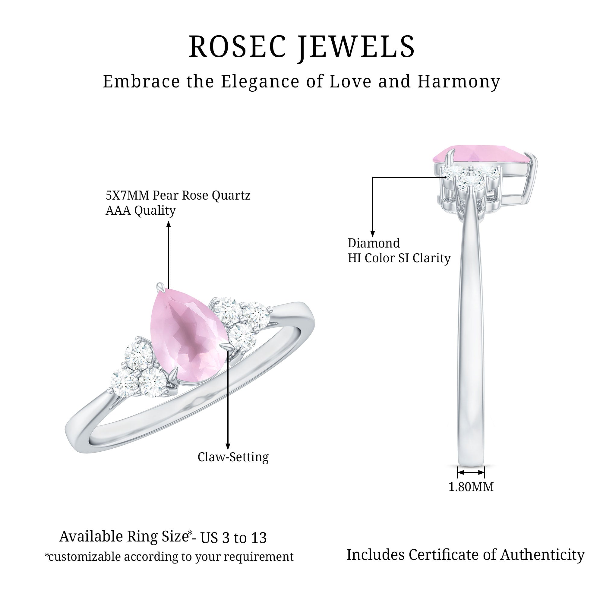 Add a touch of sparkle to your everyday routine with this stunning Rose Quartz Solitaire Ring. This Engagement ring is sure to make your loved one feel special and cherished, featuring a Pear Cut Rose Quartz gemstone and a trio of dazzling Diamond stones. The Claw Setting ensures that the gemstones remain securely in place, allowing you to flaunt this Teardrop ring at any occasion or party.