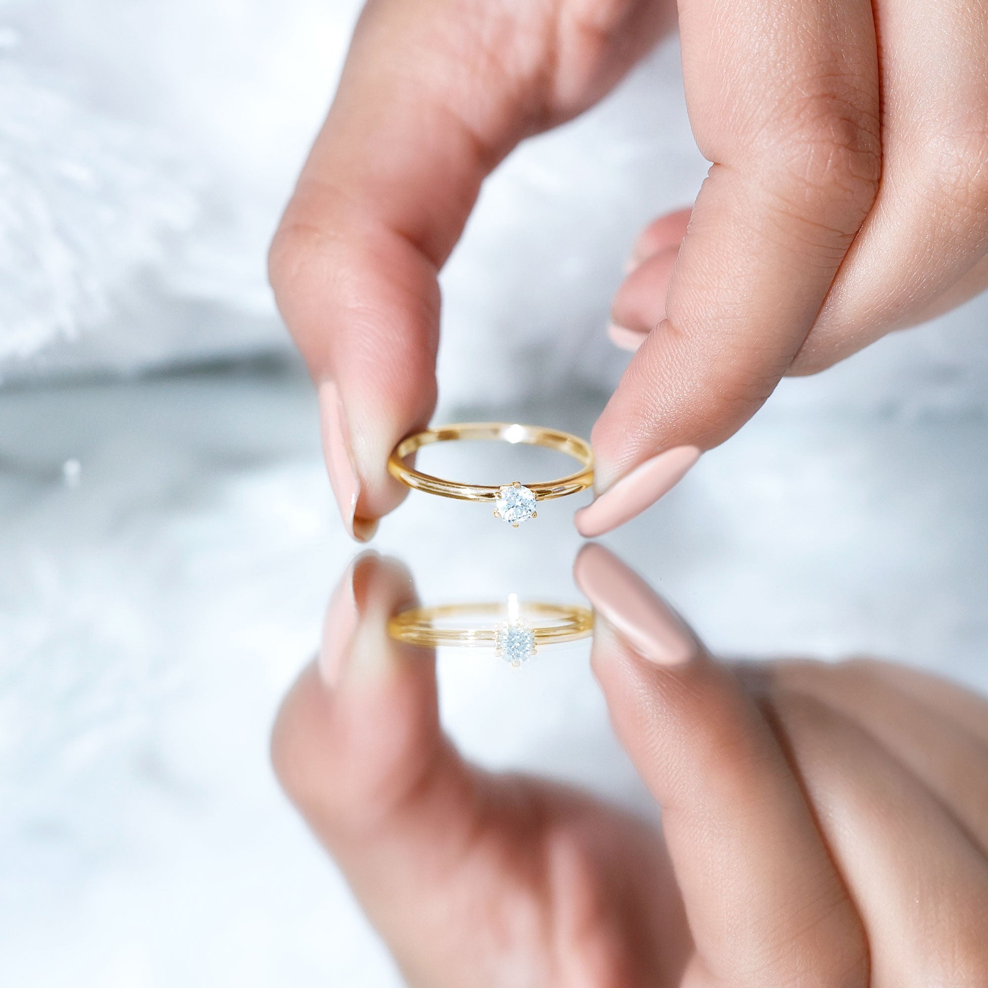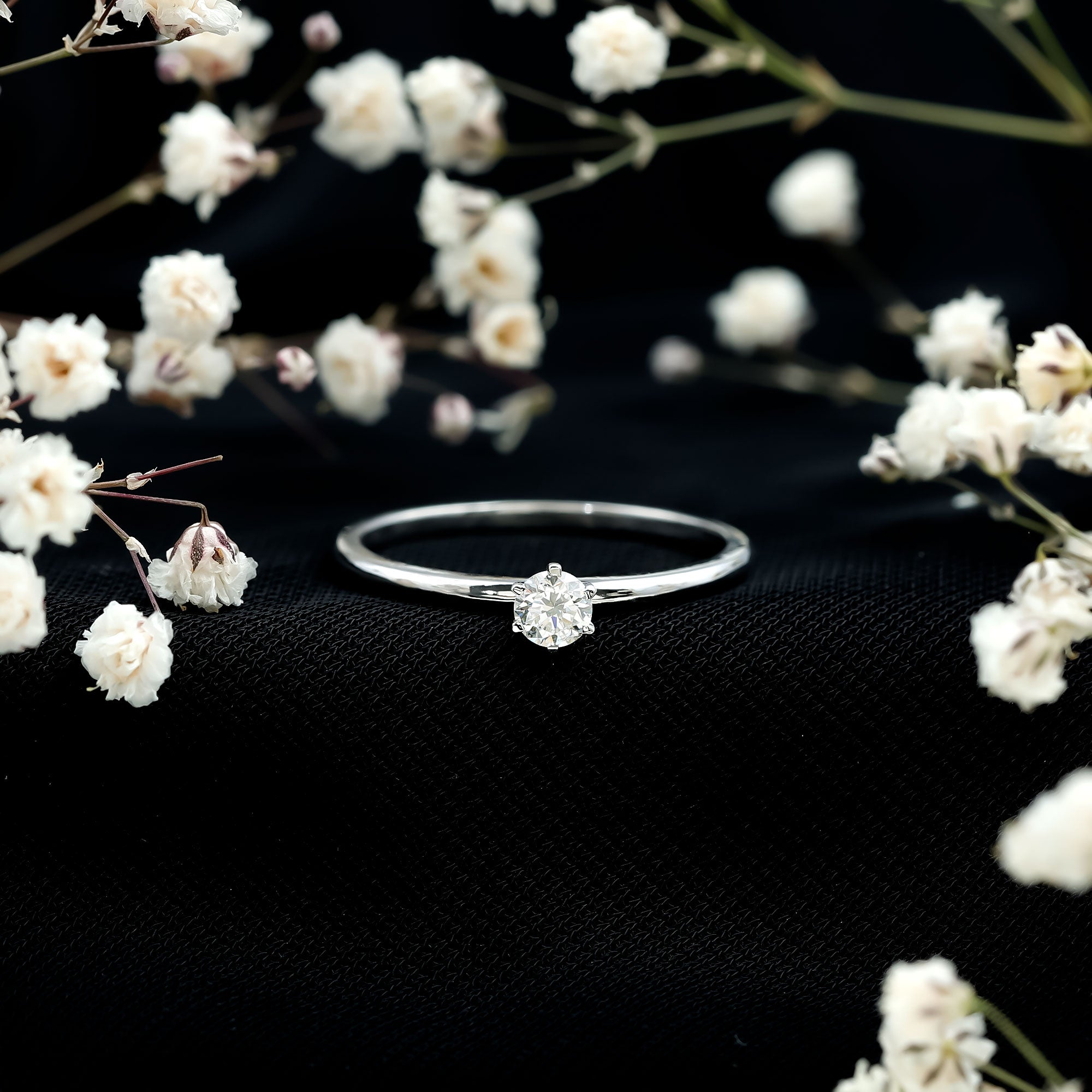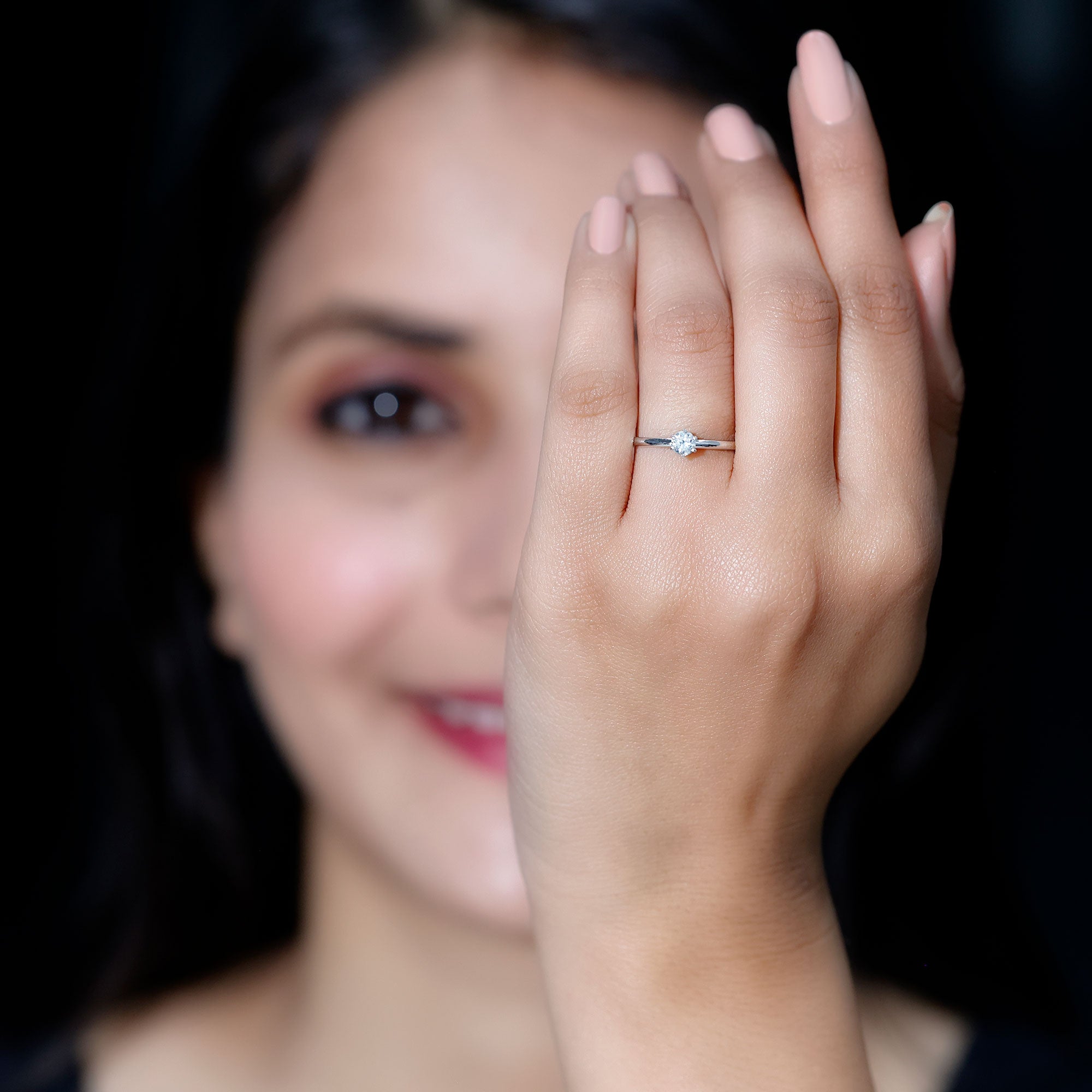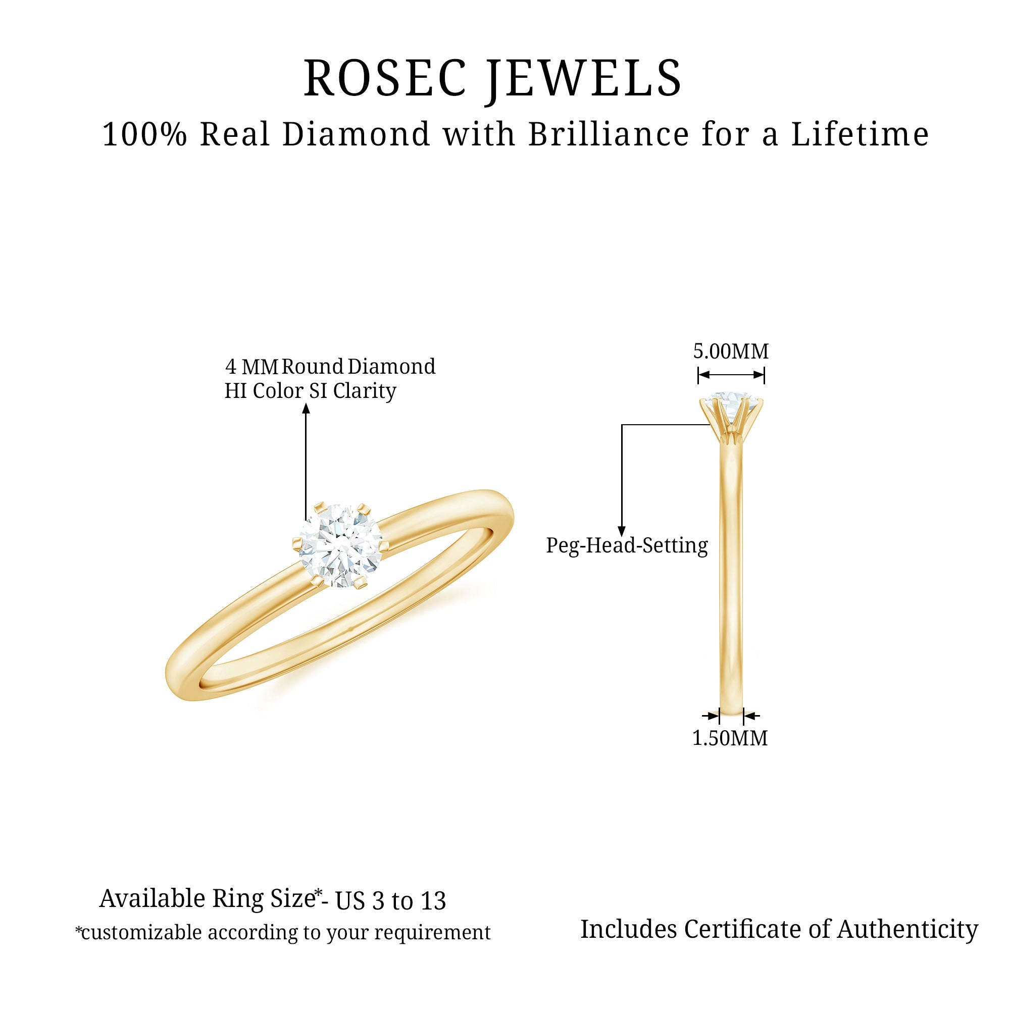 This Solitaire Diamond Ring is a timeless symbol of love, designed to captivate hearts at first sight. It features a 4 MM round brilliant cut diamond set in 4 prong peg head setting, beautifully conveying the romantic feelings tied to love. With its enduring and deep symbolism, this Diamond Promise Ring for Her embodies your unique relationship and tells your love story. Made with HI-SI Quality Diamonds, it boasts impressive clarity and brilliance, making it an ideal representation of everlasting love. Whether it is given as a pre-engagement present or as a reaffirmation of love and commitment, this Solitaire Promise Ring signifies a promise, perfect for marking special moments or simply acting as a daily reminder of the vows made and the love that continues to flourish. Celebrate your devotion with this Real Diamond Ring, showcasing a chic design that attracts attention while radiating a subtle elegance and a captivating glow.
