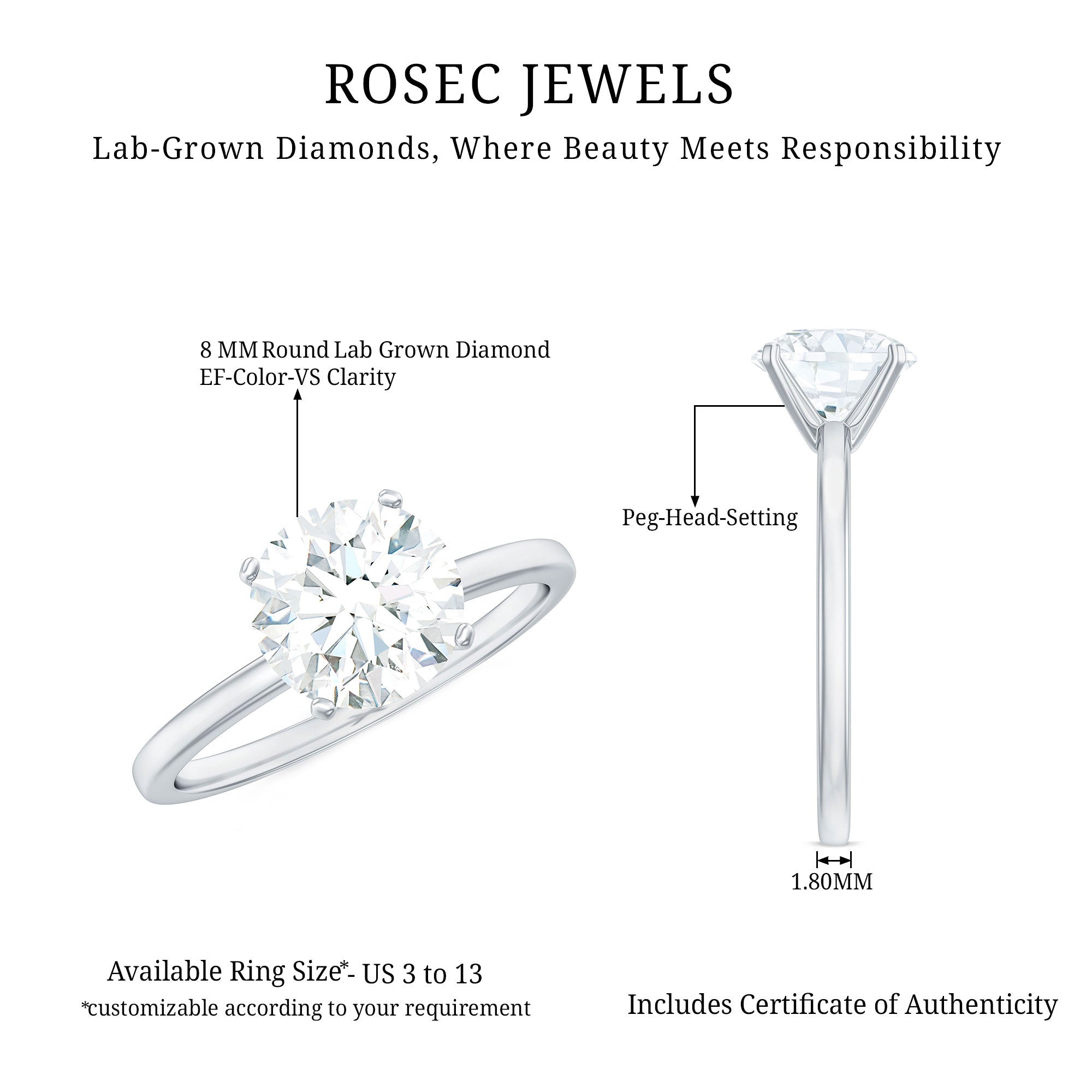 Simple yet elegant, this Solitaire Diamond Engagement Ring is a lovely reminder that sometimes, less truly is more. It features a stunning EF-VS Quality 8 MM Round Shape Lab Grown Diamond set in peg head setting and crafted from 14k white gold plated silver. This Round Cut Engagement Ring shines with a sparkle that feels effortlessly luxurious. With a man made Diamond, this ring is a timeless piece that never goes out of style. It sits on a sleek band and arrives in a beautiful jewelry box, making this 2 Carat Diamond Ring for Women perfect for celebrating love in a genuinely special way. Whether it is for heartfelt proposals, milestone anniversaries, or just a personal treat to say you deserve it, it is the perfect choice for any occasion. The Diamond Solitaire Ring is available in a range of sizes, ensuring everyone can find their ideal fit. It strikes the perfect balance - bold yet not overwhelming, refined but not too delicate. It is a thoughtful, ethical, and endlessly charming symbol of love. Let this Single Stone Ring be the highlight of your forever story.