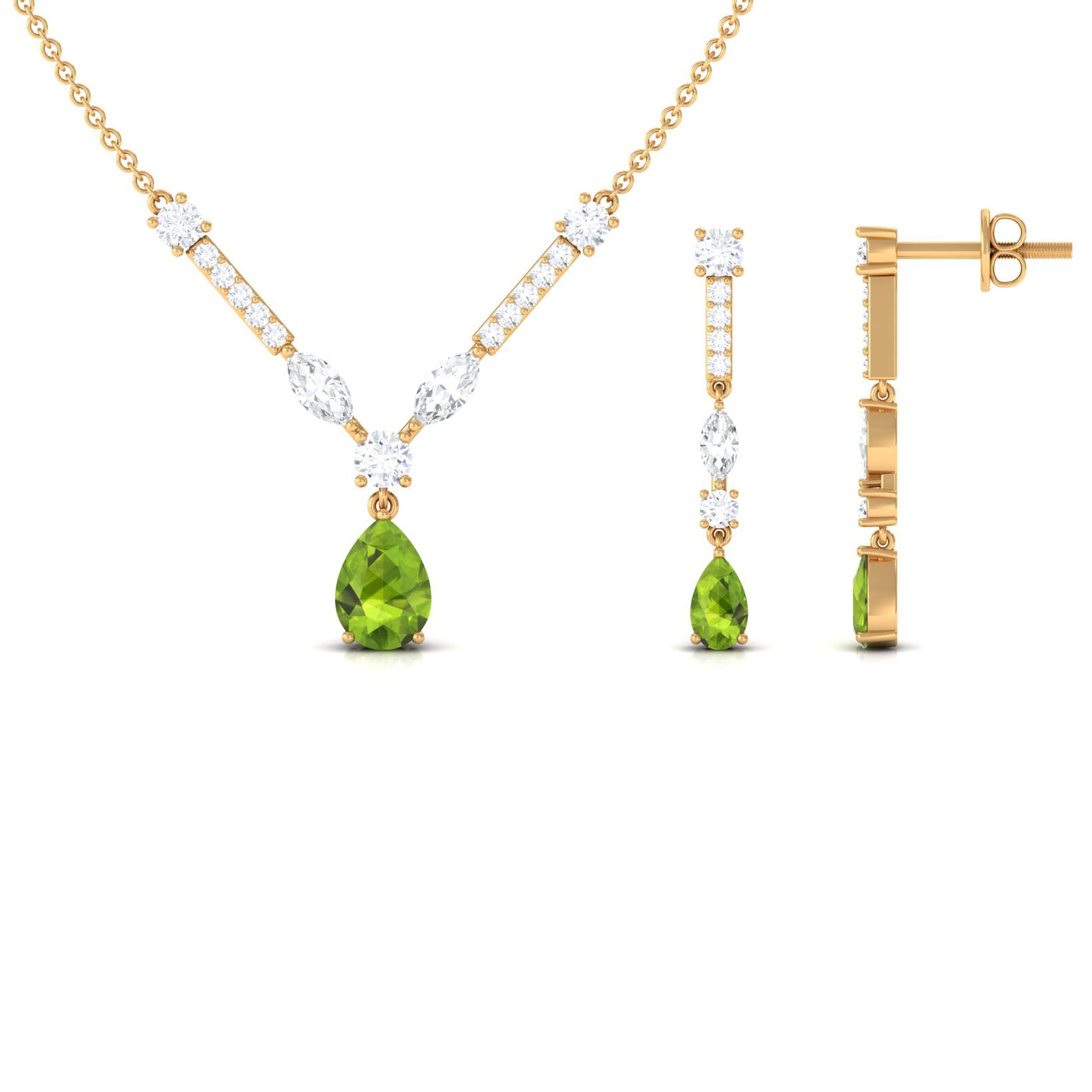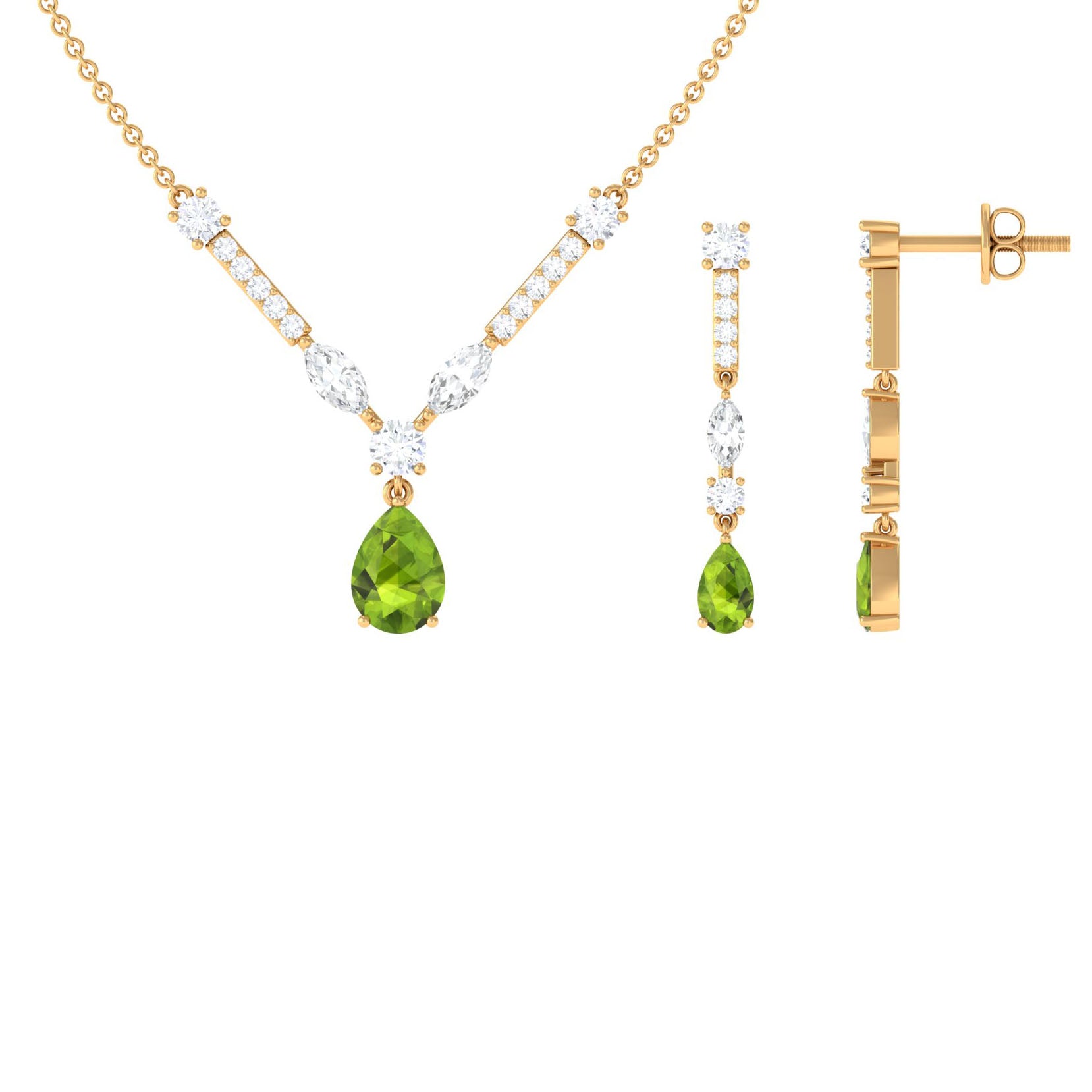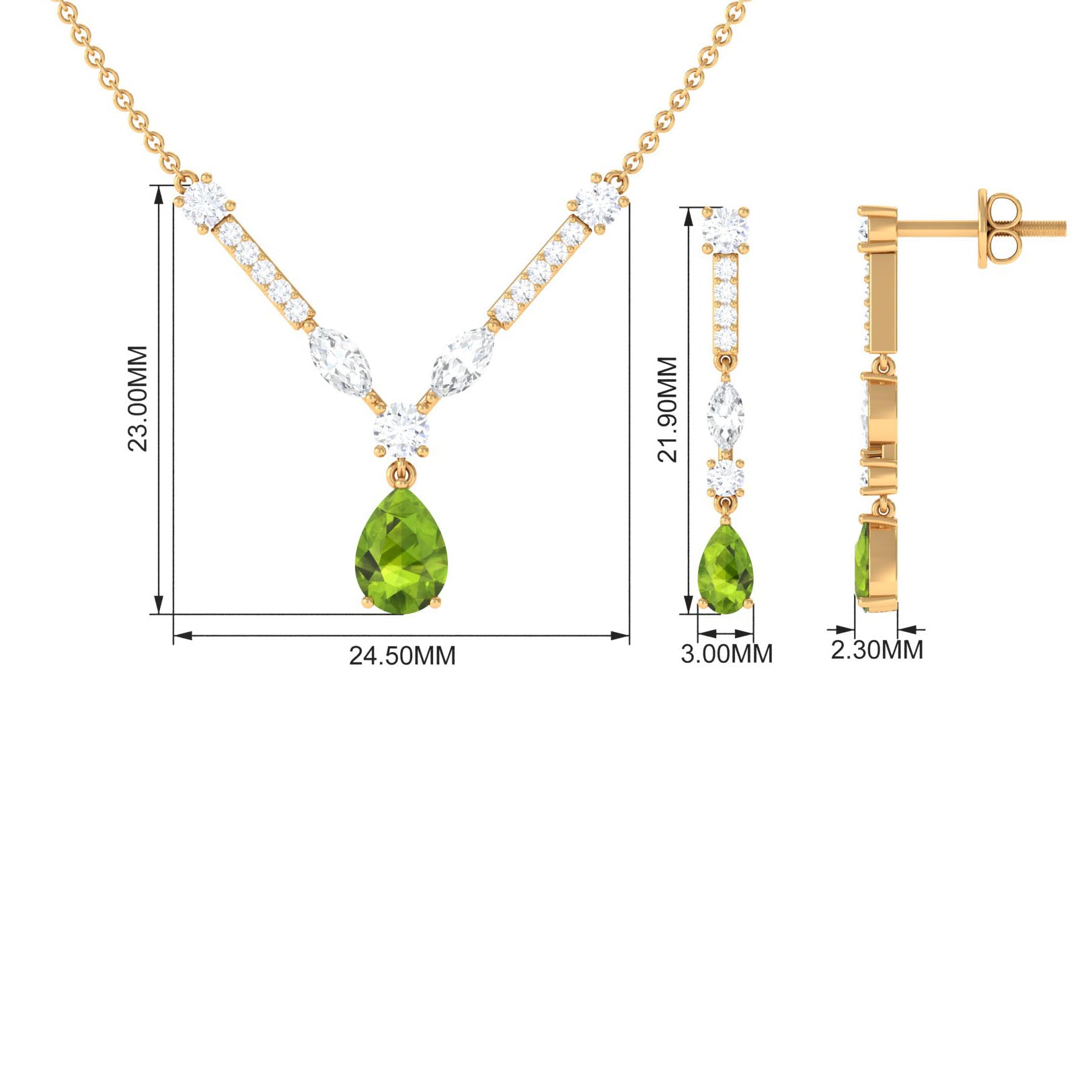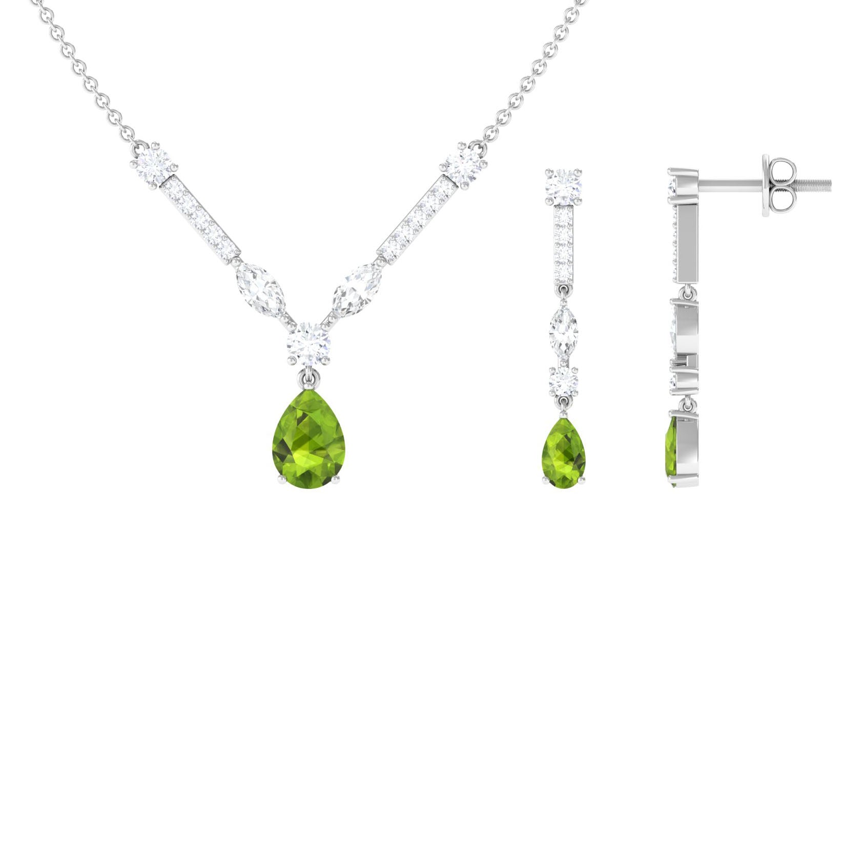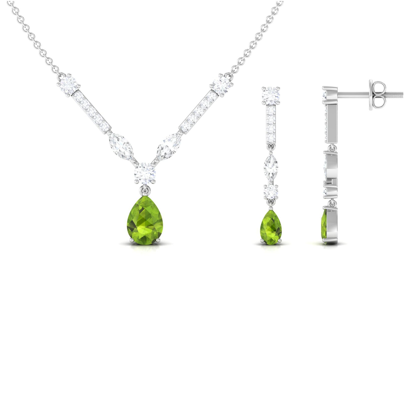 Looking for the perfect Necklace Earrings jewelry set to adorn your bride-to-be on your wedding day? Look no further than this stunning Peridot Jewelry Set. Featuring a gorgeous Pear Cut Peridot stone set in a secure Prong Setting and accented with sparkling Moissanite on both the pendant and drop earrings, this drop jewelry set is sure to make a statement. The elegant Peridot Pendant and Earrings Set is both beautiful and timeless and is sure to become a cherished piece in your loved ones jewelry collection.