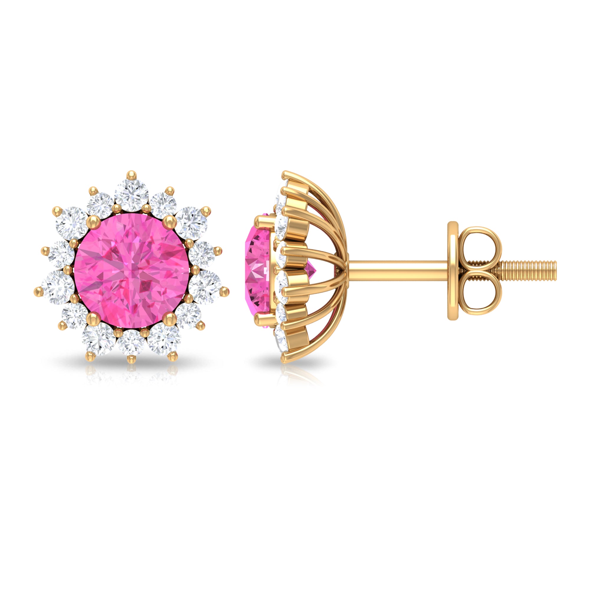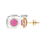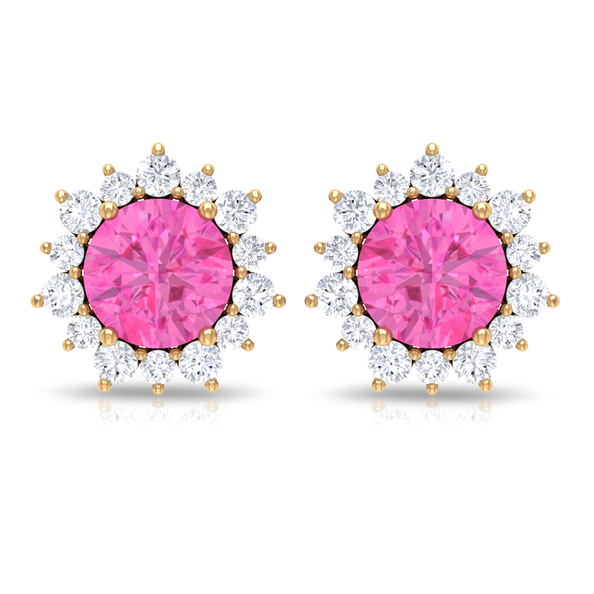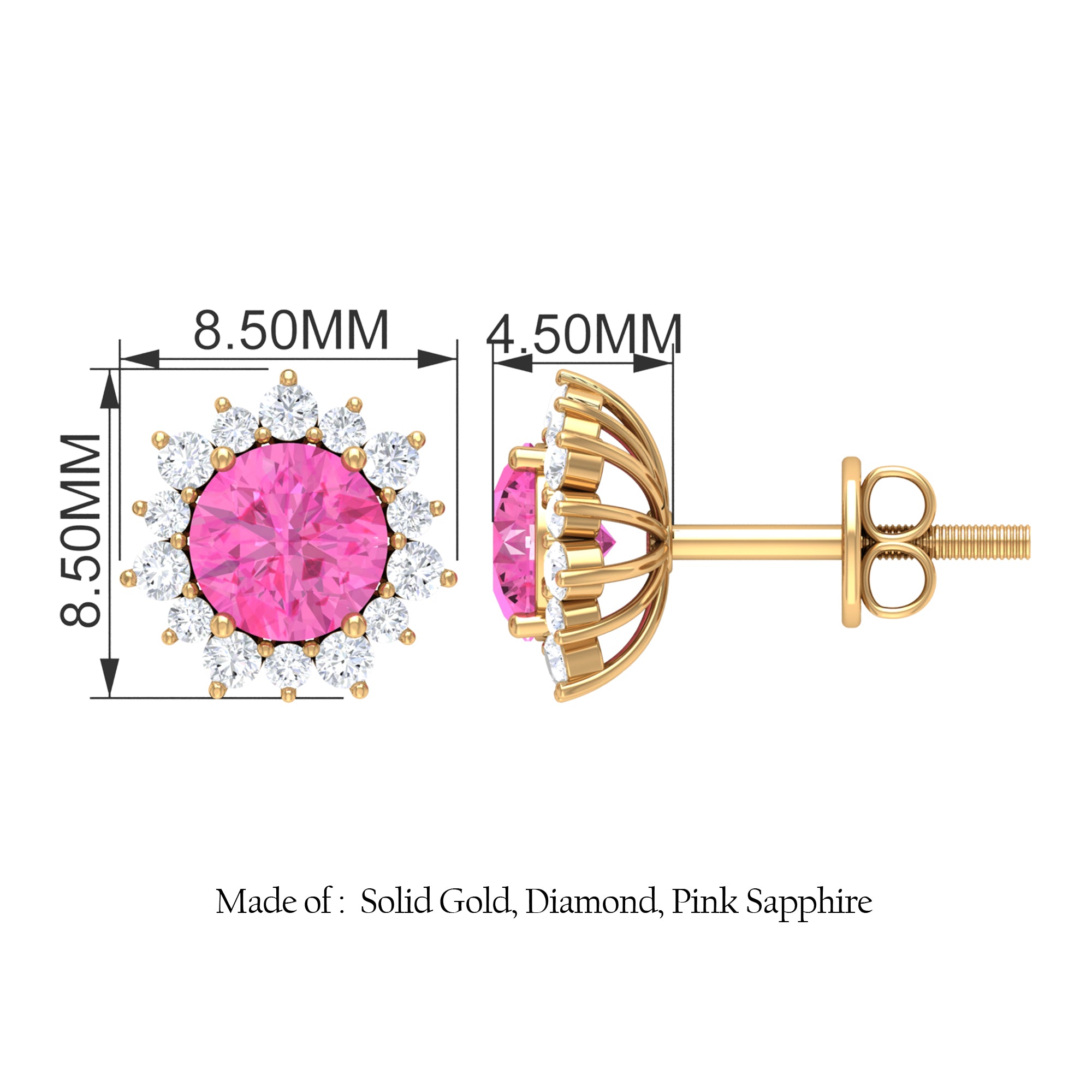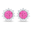 Experience enchantment with these captivating Stud Earrings adorned with Round Pink Sapphires in Prong Setting, encircled by Diamonds in a Halo arrangement. These Earrings, intricately engraved and composed of high-quality metal, exude a mesmerizing allure.