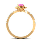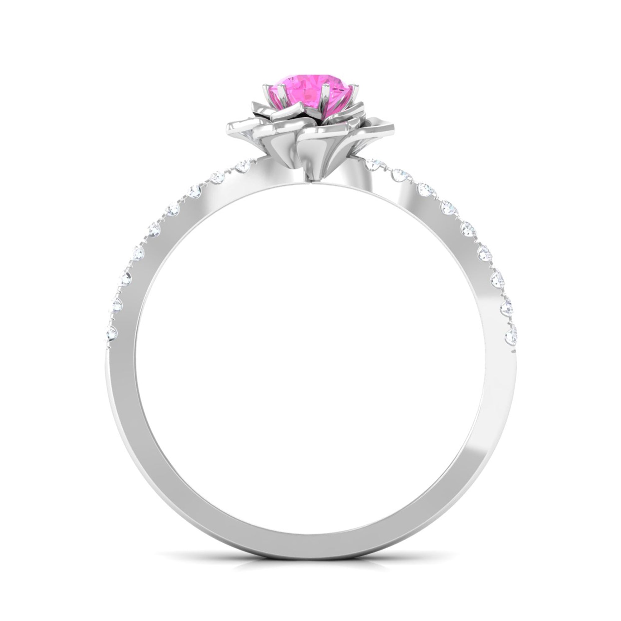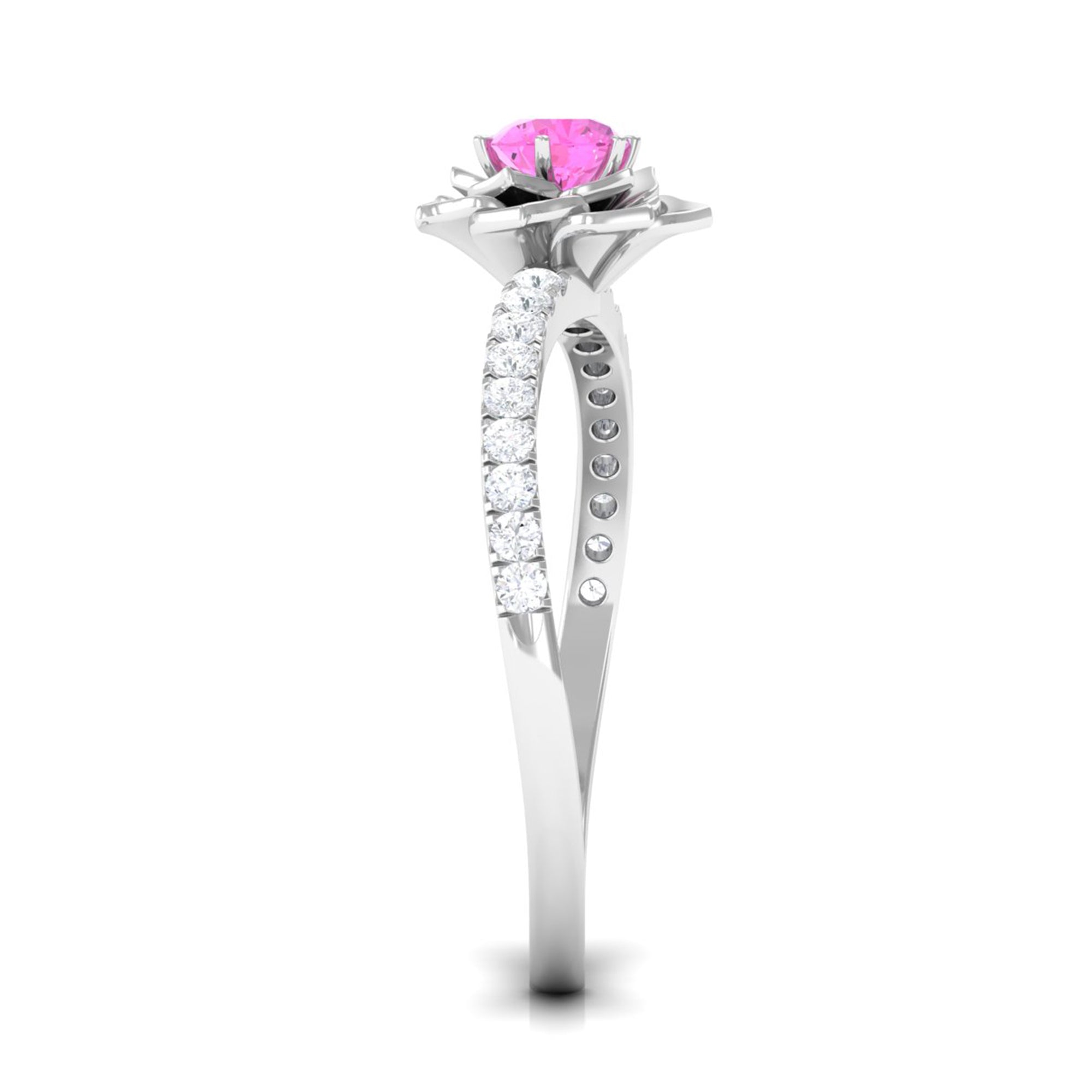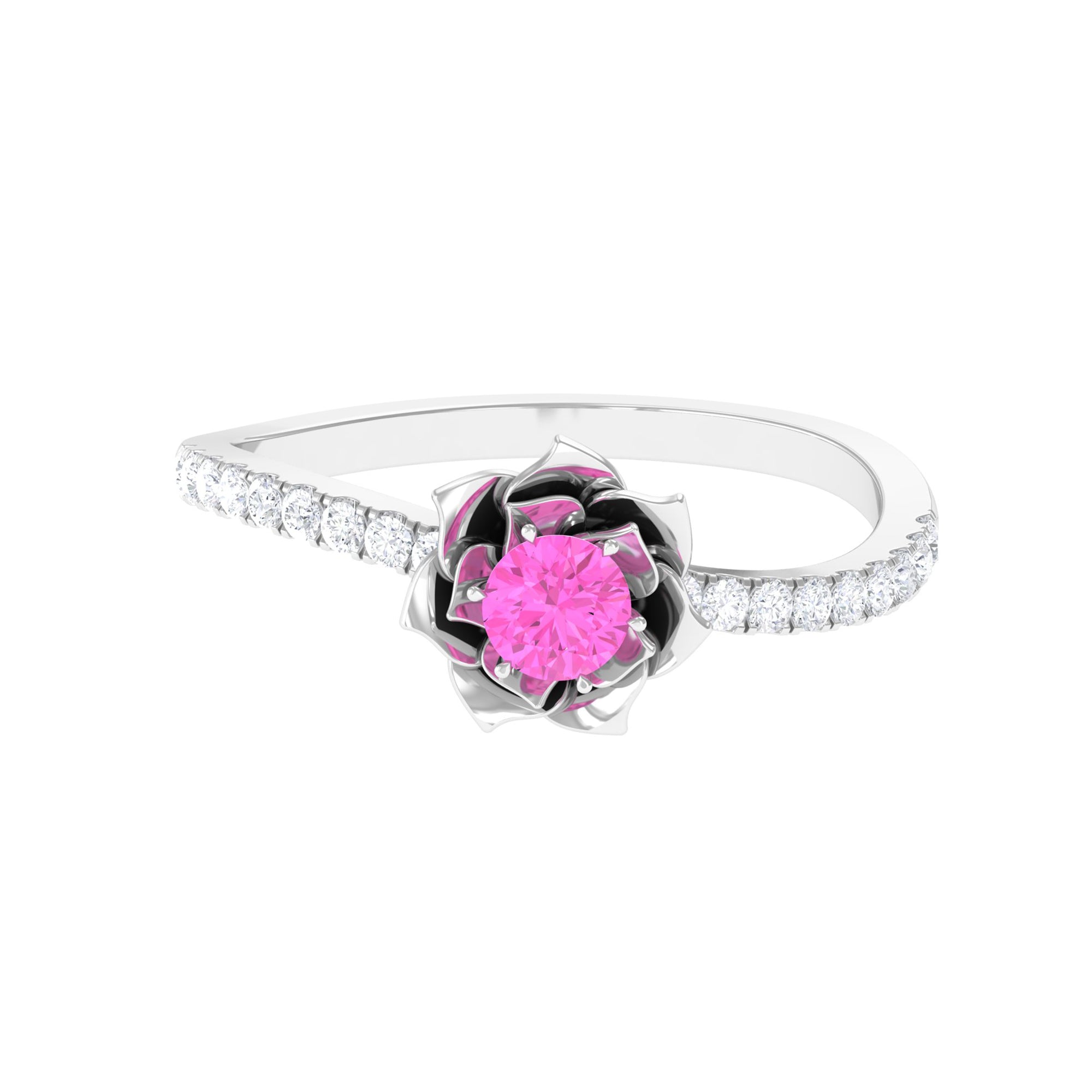 Prepare to be enchanted by the captivating blend of Pink Sapphire and Diamond in this breathtaking Rose Flower Ring. The Round Natural Pink Sapphire takes center stage, nestled amidst the delicate petals of a blossoming rose flower design that gracefully adorns the curved shank. This Floral Inspired Engagement Ring is a true gem, a testament to your blooming love.