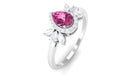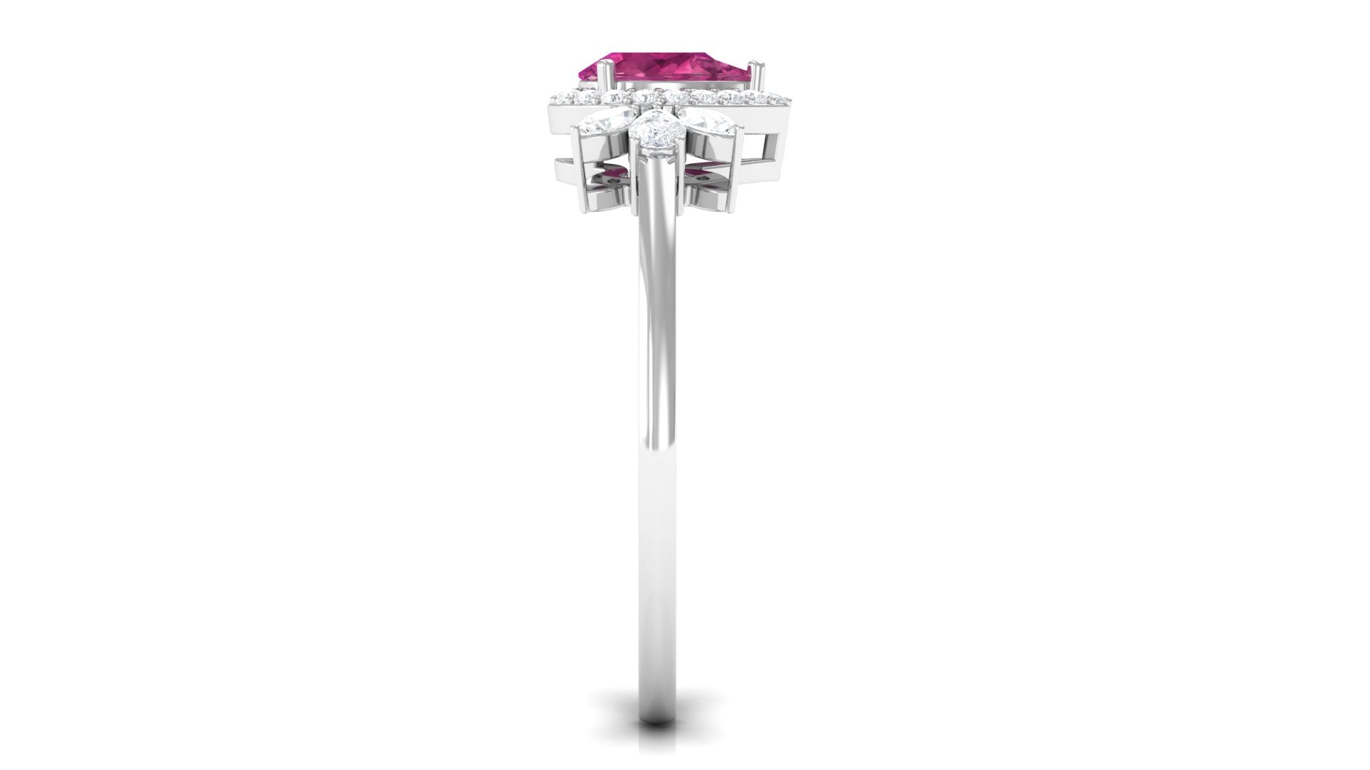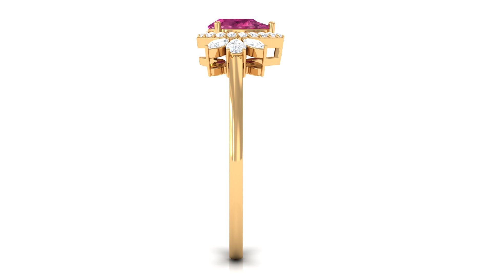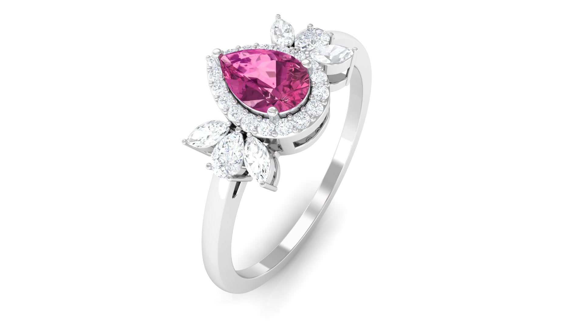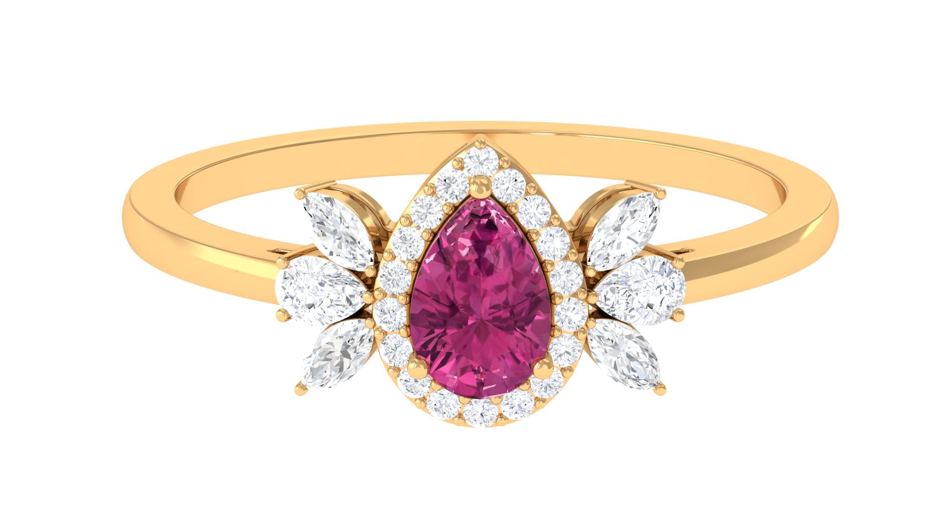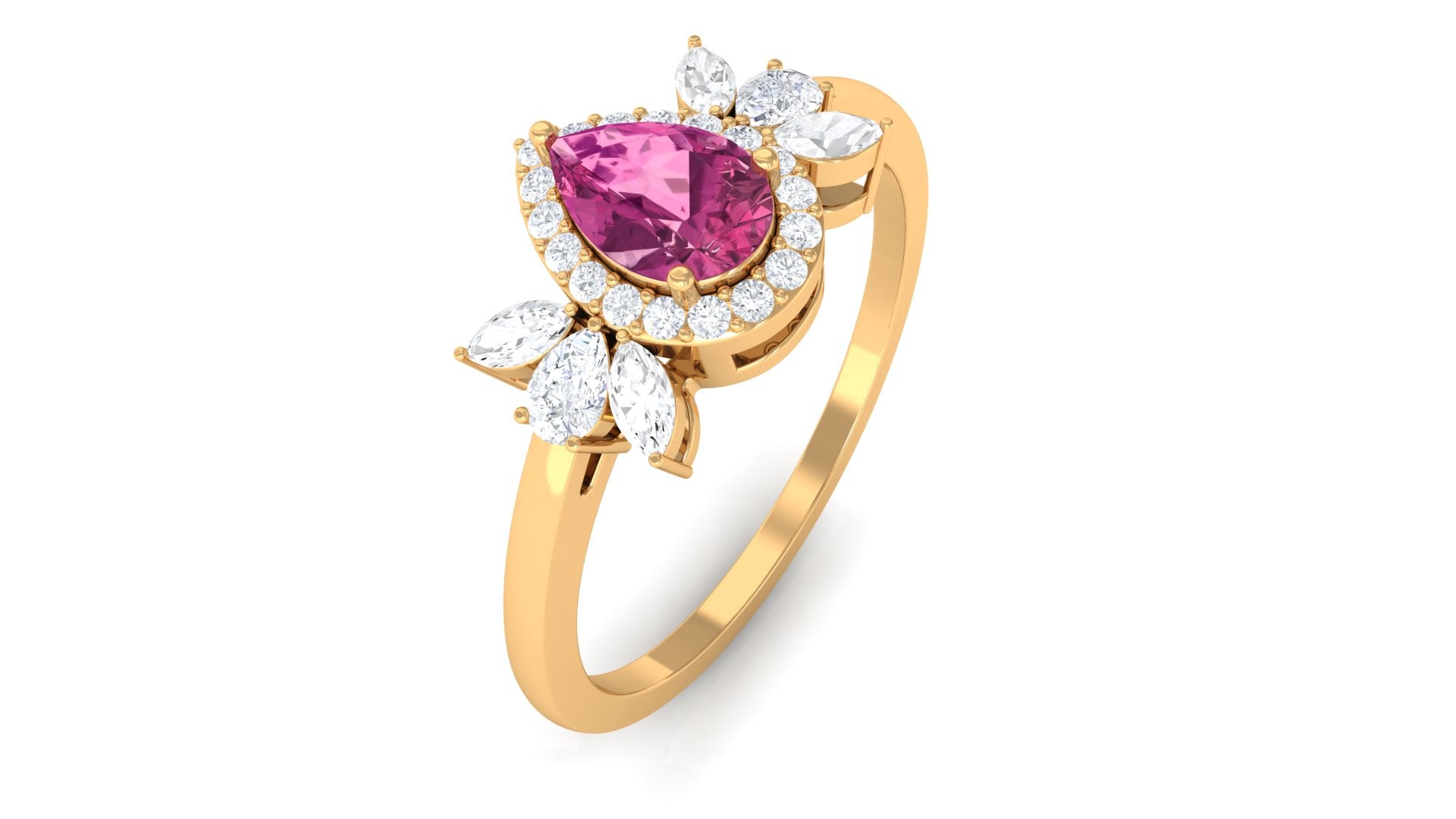 This exquisite engagement ring features a pear-cut pink tourmaline as the centerpiece, surrounded by a halo of sparkling Diamond stones. The tourmaline is expertly cut and polished to showcase its unique pink color and brilliance. The ring is crafted in a classic and durable gold. The ring is perfect for those who love the unique look of a pink tourmaline and want the benefits of the Diamond. The halo of Diamond adds a touch of elegance and sparkle to this timeless piece. The ring is designed to make a statement and is sure to be treasured for years to come. The combination of the Pink tourmaline and Diamond creates a perfect contrast of color and sparkle that is sure to dazzle.