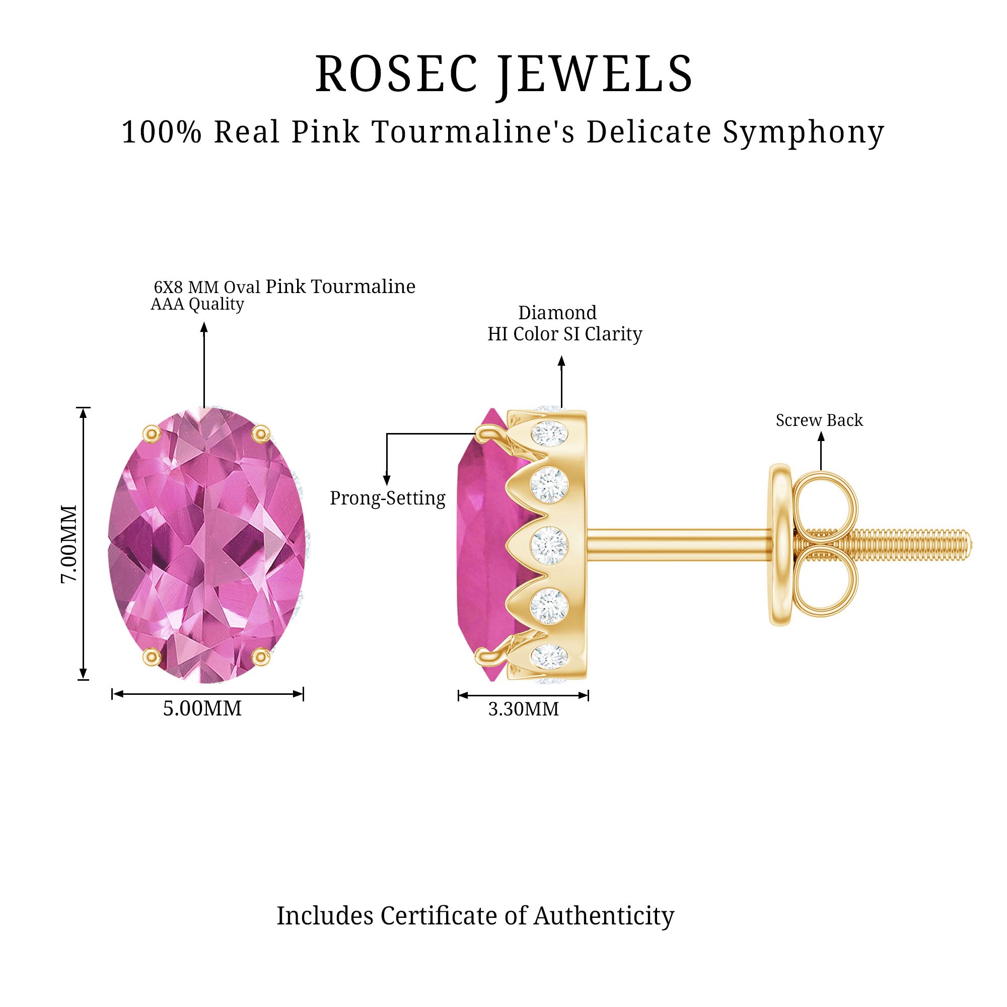 The Pink Tourmaline Oval Stud Earrings are a timeless keepsake that youll be finding reasons to wear again and again. Each stud in the Contemporary Earrings comprises an Oval Cut Pink Tourmaline secured by 4 Prong Setting while dainty Round Diamonds studded on the sides. These Screw Back Earrings are beautifully composed with Hallmarked Metal. Get these Tourmaline Earrings for your loved one as they will add sparkle to all her favorite looks.