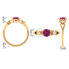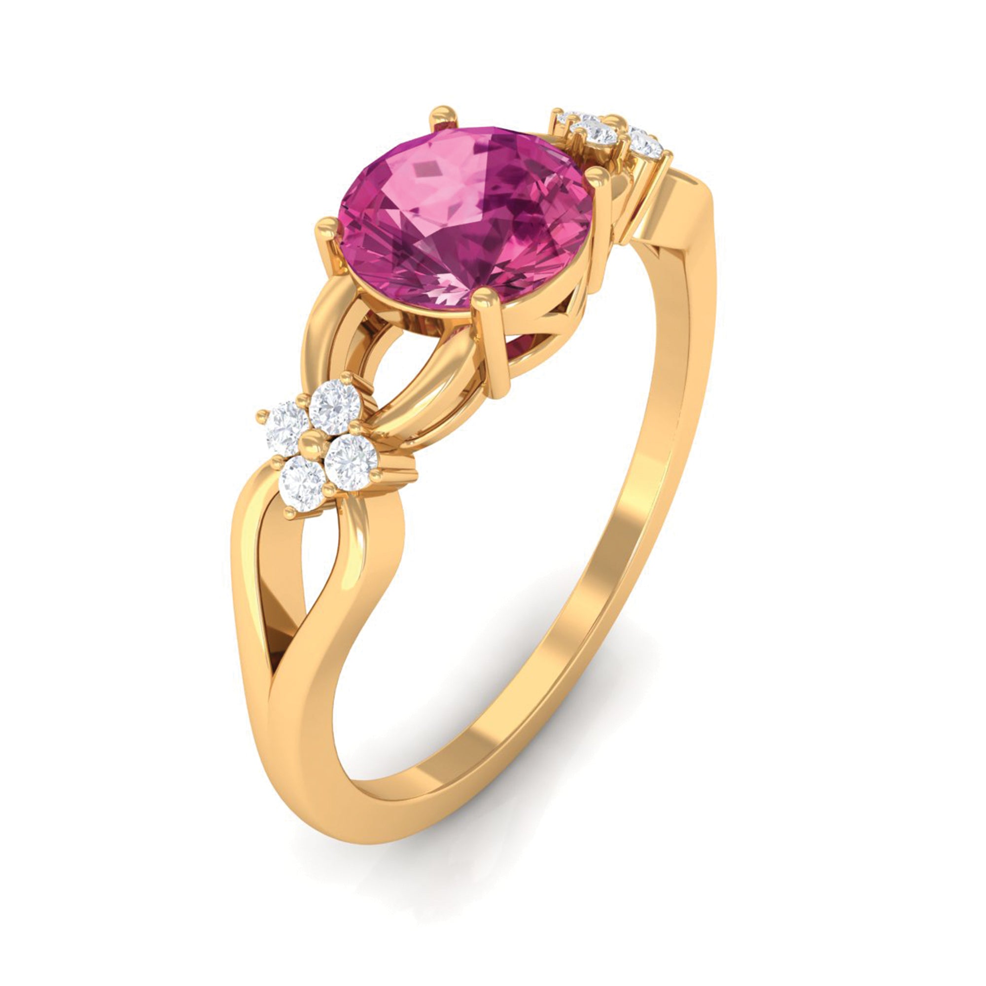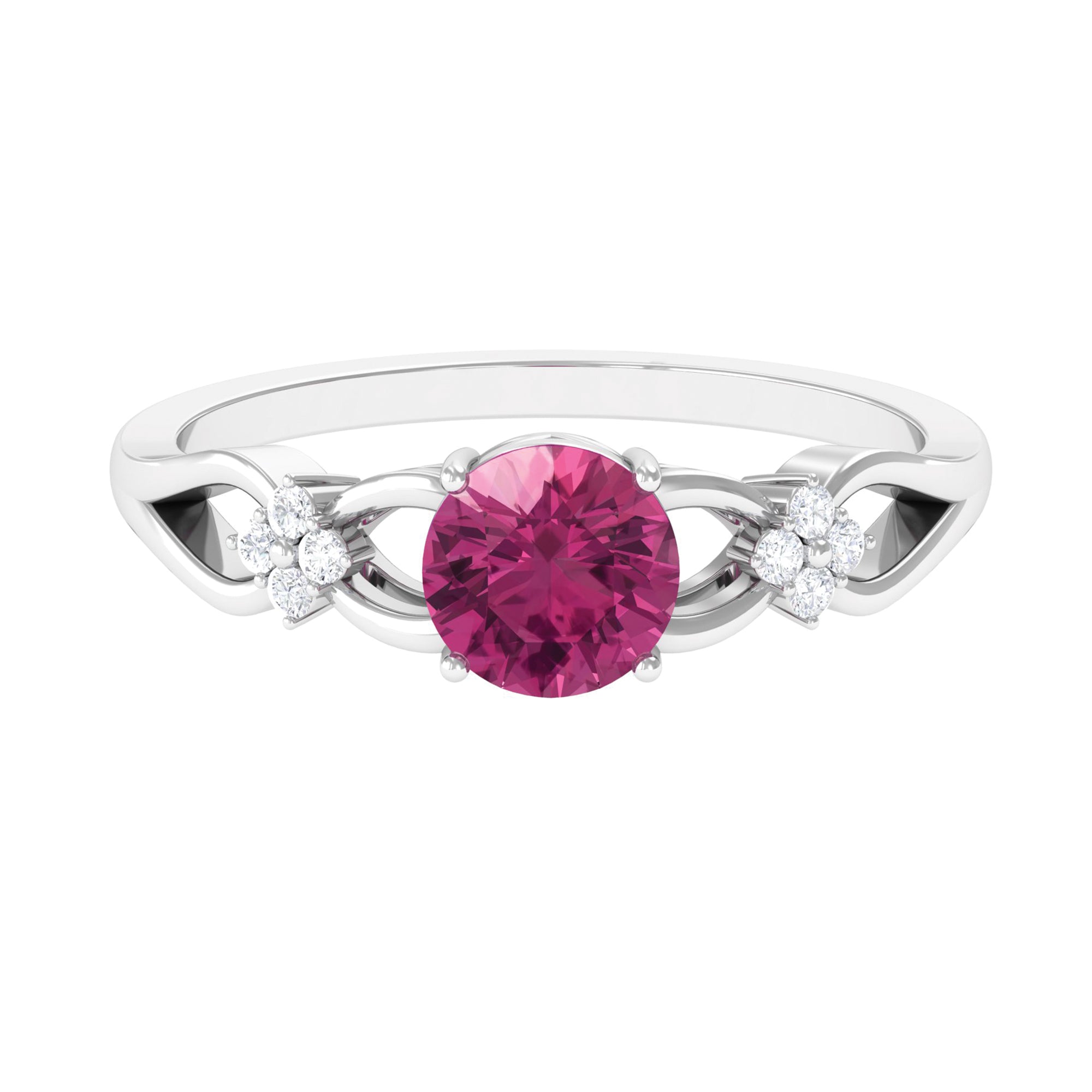 Bloom like a flower by wearing this elegant and feminine Floral Ring. A 6 MM Round Shape Pink Tourmaline gemstone set in 4 Prong Setting as a center stone over the Crossover Shank, for an eye-catching look. Shimmering Diamond gemstones set in a floral pattern over both sides of the center stone, brim this Solitaire Ring with natures grace. A perfect option for anyone who loves Nature Inspired Jewelry.
