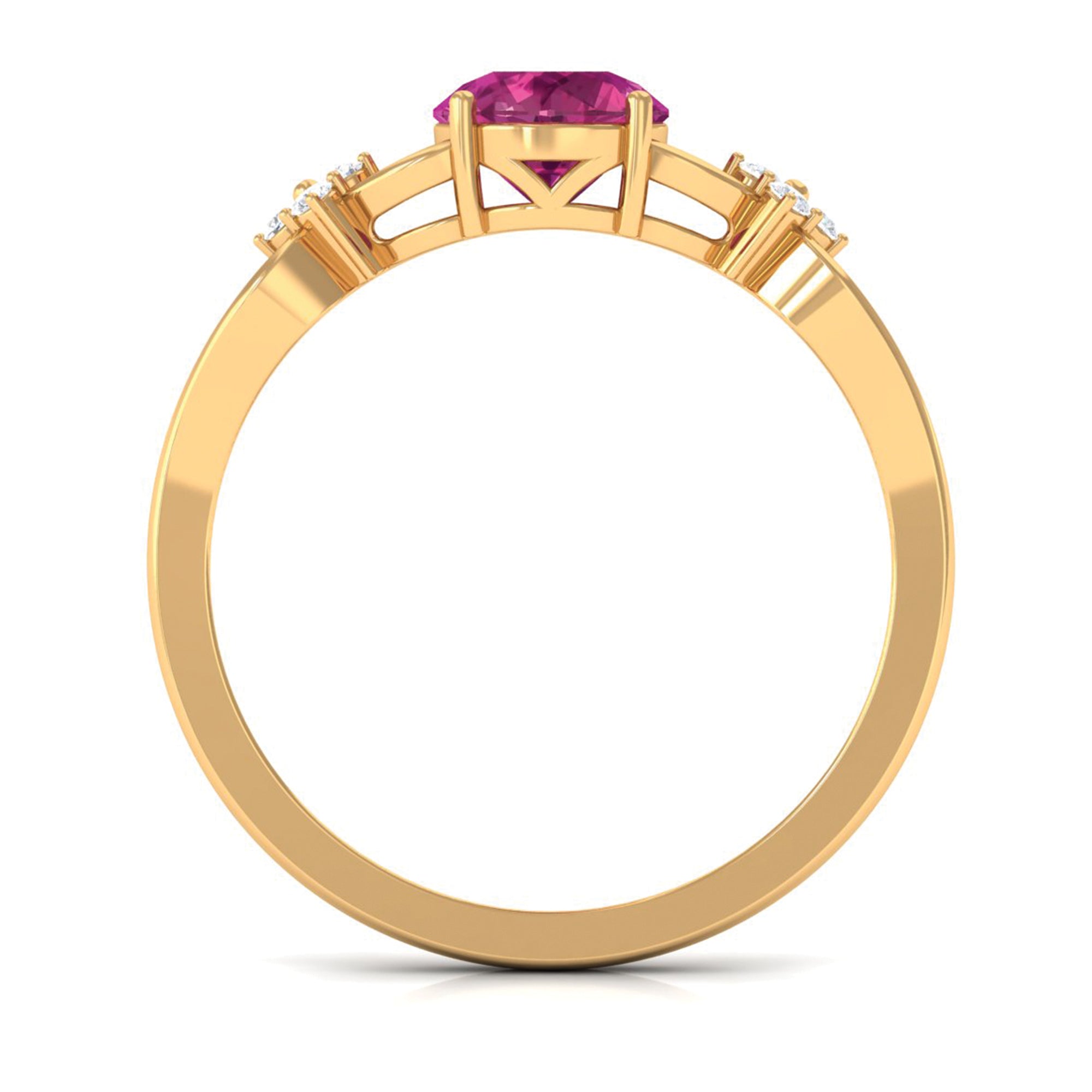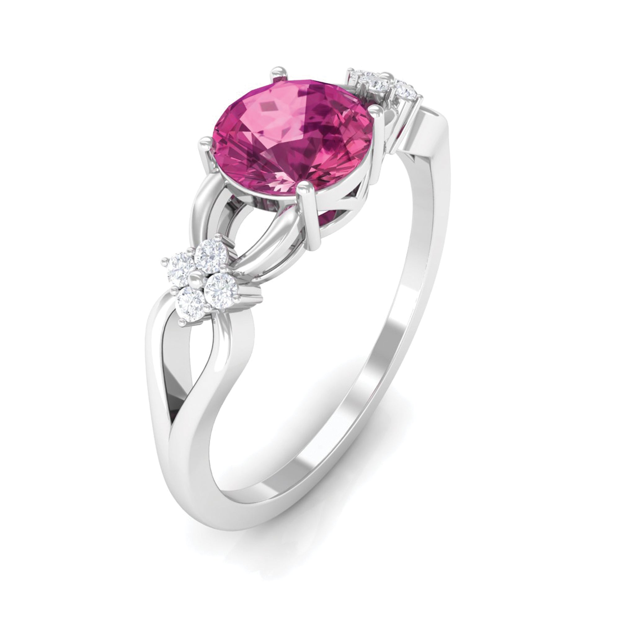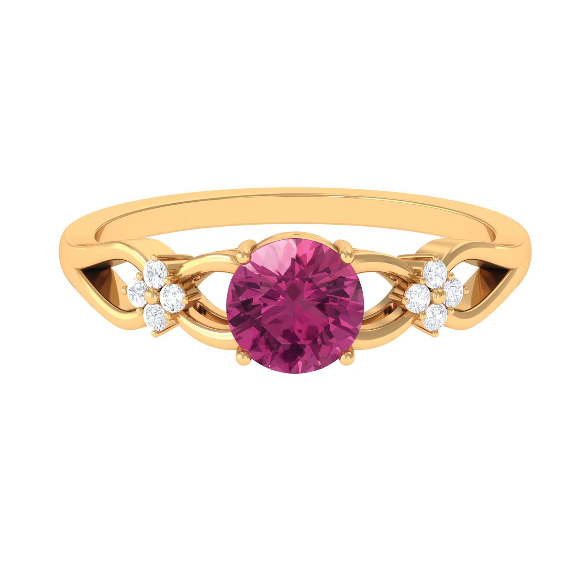 Bloom like a flower by wearing this elegant and feminine Floral Ring. A 6 MM Round Shape Pink Tourmaline gemstone set in 4 Prong Setting as a center stone over the Crossover Shank, for an eye-catching look. Shimmering Diamond gemstones set in a floral pattern over both sides of the center stone, brim this Solitaire Ring with natures grace. A perfect option for anyone who loves Nature Inspired Jewelry.