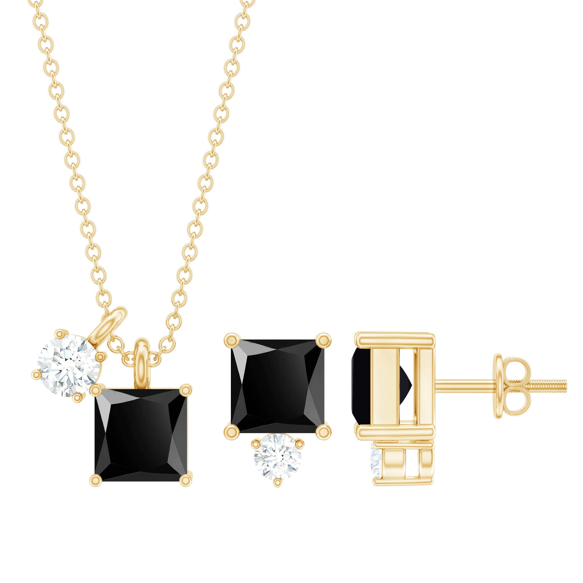 The graceful simplicity of this Black Onyx Jewelry is sure to complement all your party-wear looks. Includes a beautiful pendant and earrings set adorned with princess-cut black onyx and round diamond creating an elegant look. Make an unforgettable moment with her by gifting this jewelry set delicately designed to draw attention. Exquisitely elevates the beauty of this black stone jewelry. Each earring further offers comfort and security with its screw-back closures, so you can flaunt them with confidence.