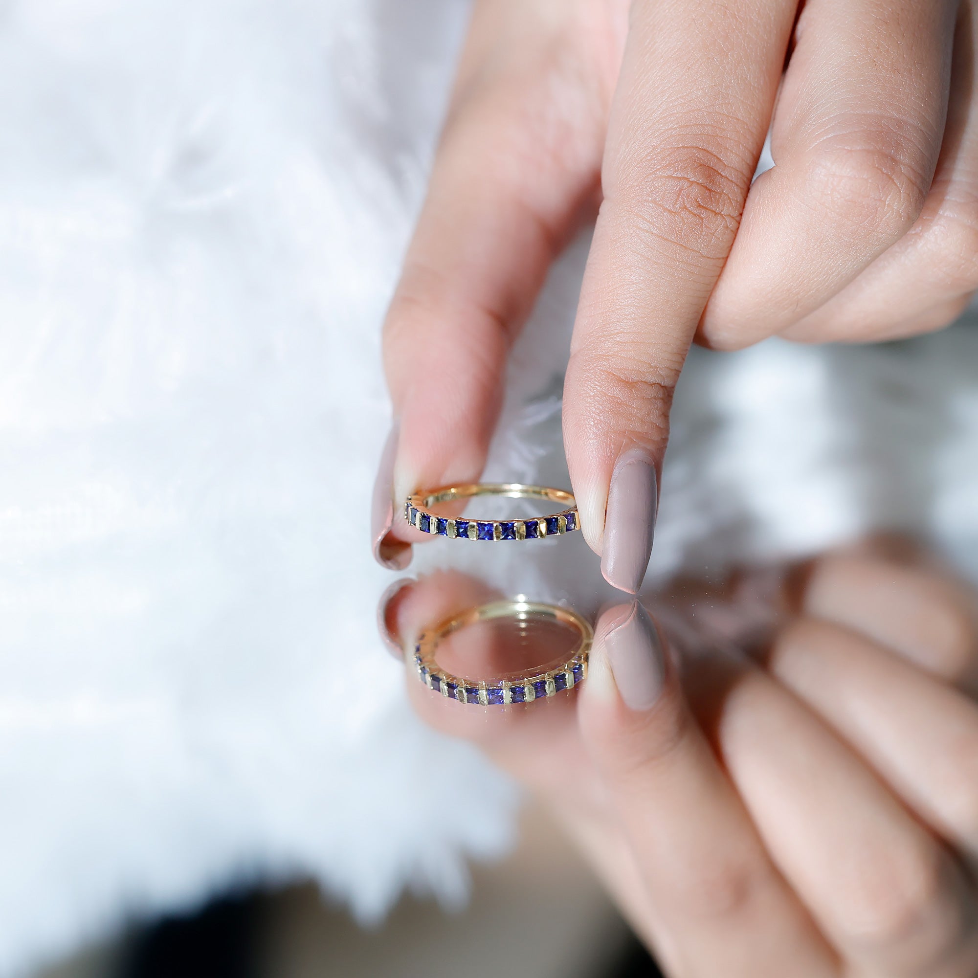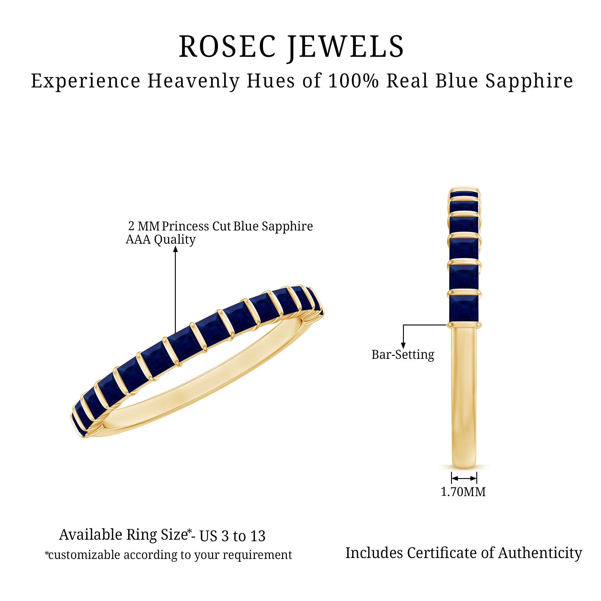 This Blue Sapphire Eternity Ring will make you the center of attraction with its enchanting blue hue. The ring features a single array of Princess Cut Sapphire securely placed in Bar Setting. The ring signifies loyalty and fidelity which makes it perfect for the celebration of relationship milestones. This Half Eternity Ring beholds the shine of AAA quality Sapphire reflecting elegance and enduring beauty. This September Birthstone Ring defines a love and commitment that makes it a meaningful choice for the special occasion. Get this natural sapphire ring for your special one and show your intense feelings to them.