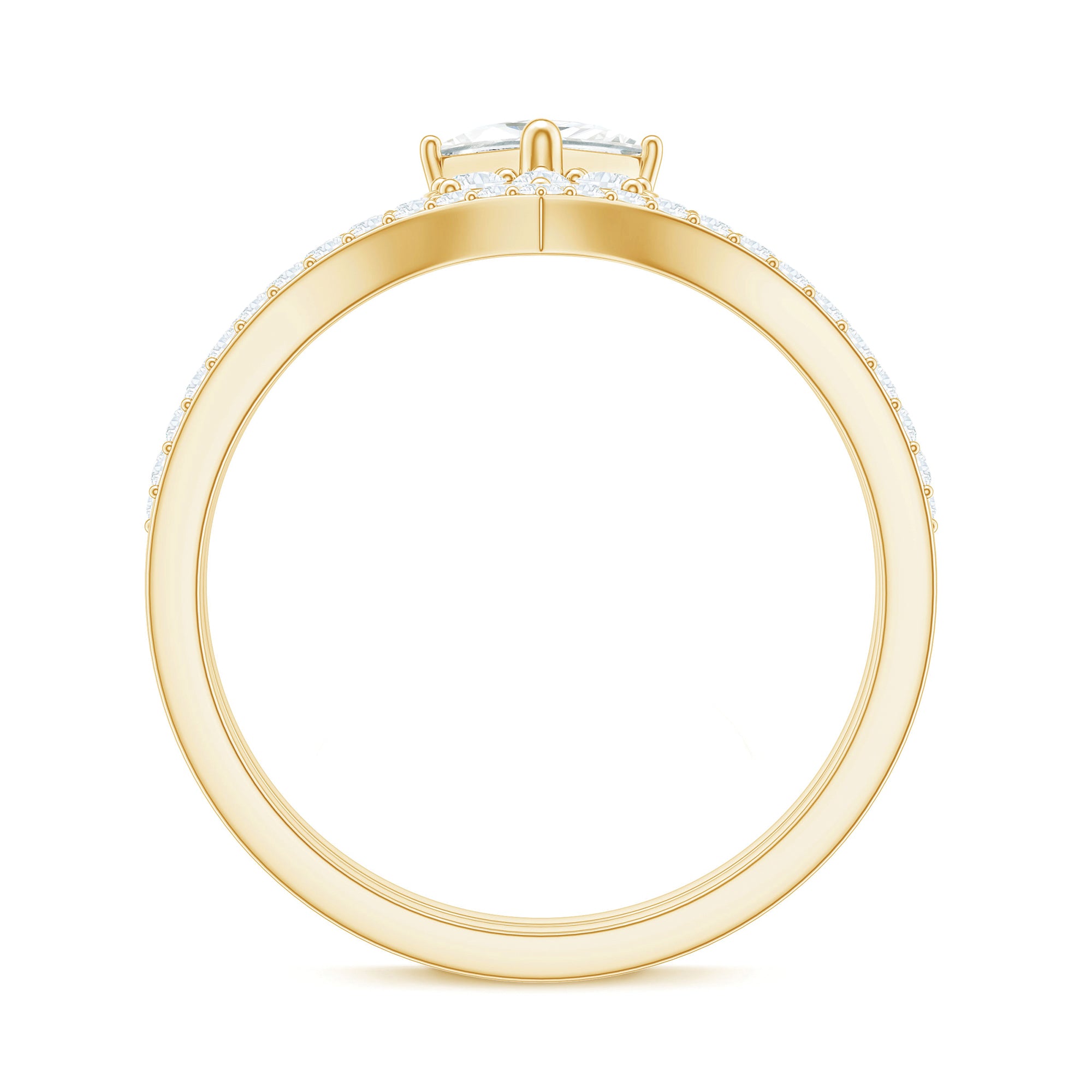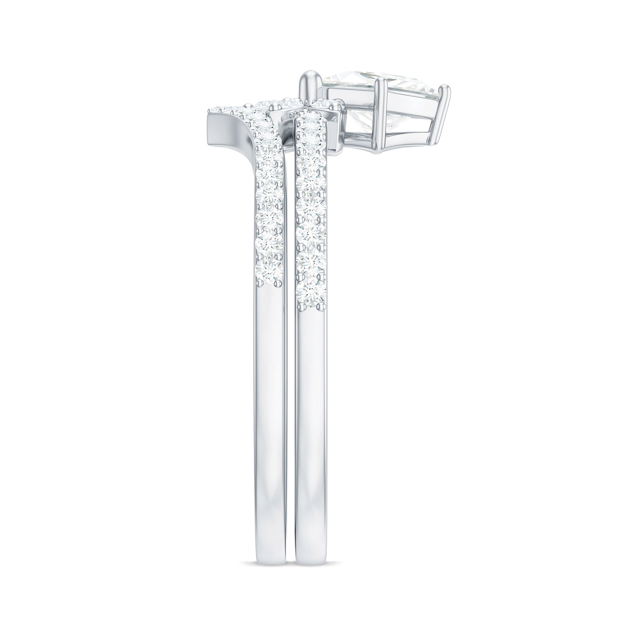 Delicate, radiant, and full of charm, this Moissanite Bridal Ring Set is made for the bride who adores floral elegance and timeless sparkle. Designed with a creative twist, this 2 piece Designer Wedding Ring Set features an engagement ring with a floral inspired center and a perfectly matched chevron wedding band, creating a look that is romantic, refined, and unique. The centerpiece of the engagement ring is a 4 MM princess cut moissanite, held securely in prong setting. Graded D color and VS1 clarity, the moissanite offers stunning brilliance and fire, a dazzling symbol of your love. Enhancing the beauty of the center stone is a cluster of round moissanite stones, artfully arranged to form a floral design, giving the ring a feminine touch with a bold sparkle. Complementing the floral ring is a sleek and elegant chevron wedding band, lined with shimmering round moissanite accents that curve gently to nestle perfectly against the engagement ring. This stacked look enhances the beauty of the centerpiece while maintaining a light and graceful silhouette. Thoughtfully designed for versatility, the rings can be worn together for a cohesive bridal look or styled separately for everyday sophistication. Whether you are proposing or celebrating a milestone, this Flower Wedding Ring Set is a sparkling symbol of love in bloom, one she will treasure for a lifetime.