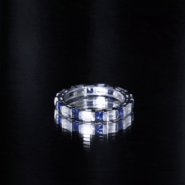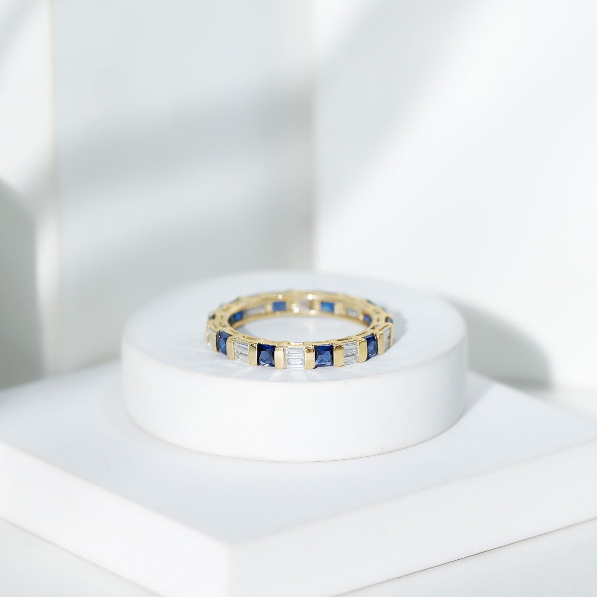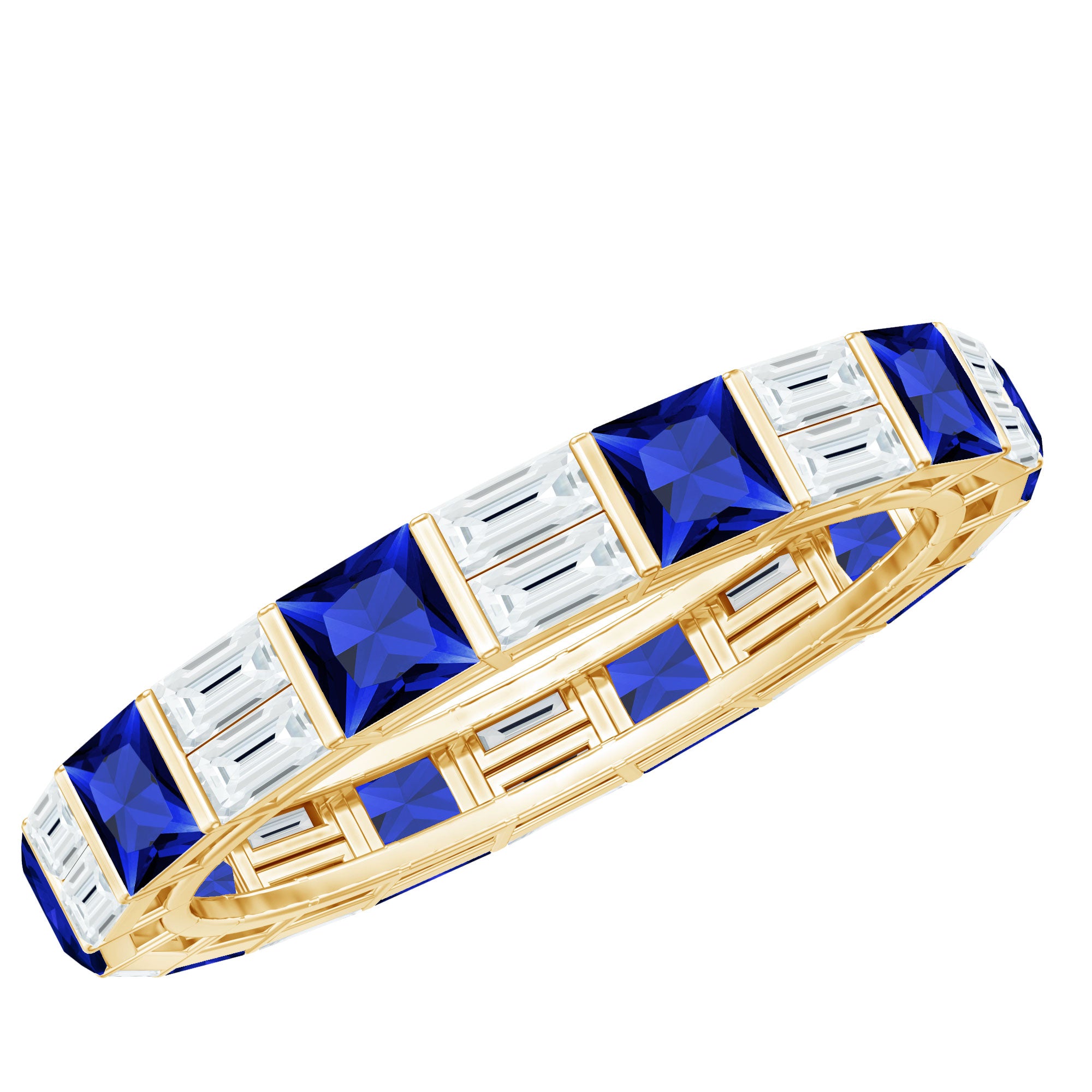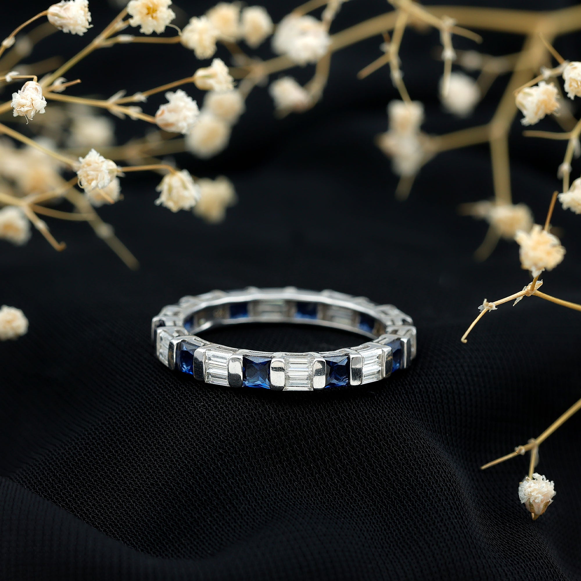 Strike a wonderful statement with this alluring Full Eternity Ring embellished with Princess Cut Lab Created Blue Sapphire and Baguette Cut Moissanite in Bar Setting. This Created Blue Sapphire Eternity Ring is crafted with hallmarked metal to make a luxurious choice.