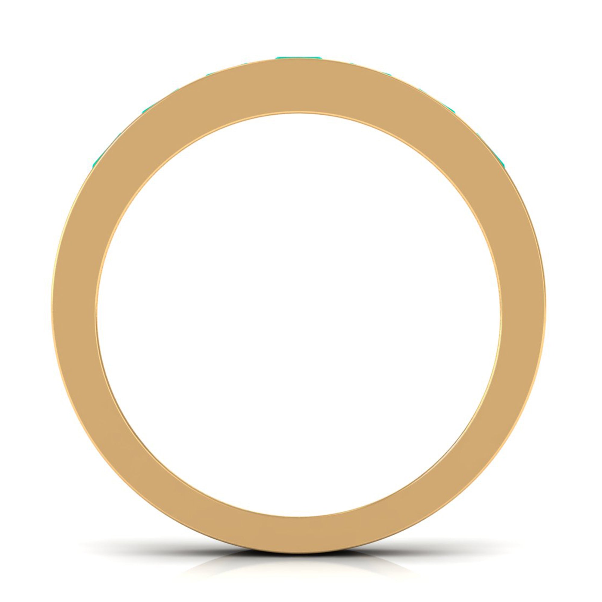 A beautiful 7 Stone Emerald Wedding Band is a classic piece of jewelry for the woman who loves to adore with a modern touch. The Princess Cut Emerald in Channel Setting facet has a positive vibrant striking impact creating a luxurious and a royal look. This Emerald Band Ring is an excellent choice for a wedding day, as a cocktail ring or even as a May Birthstone Ring. The exquisite Channel Set Emerald Ring is a one-of-a-kind ring that will leave her breathless. The ultimate symbol of eternal love this Emerald Half Eternity Ring has an elegant design with a sophisticated and charming appeal. This dazzling Wedding Band with Emerald has its glossy appearance when worn all alone or stacked with other ring to complement your engagement ring.