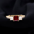 Princess Cut Created Ruby and Moissanite 3 Stone Designer Engagement Ring