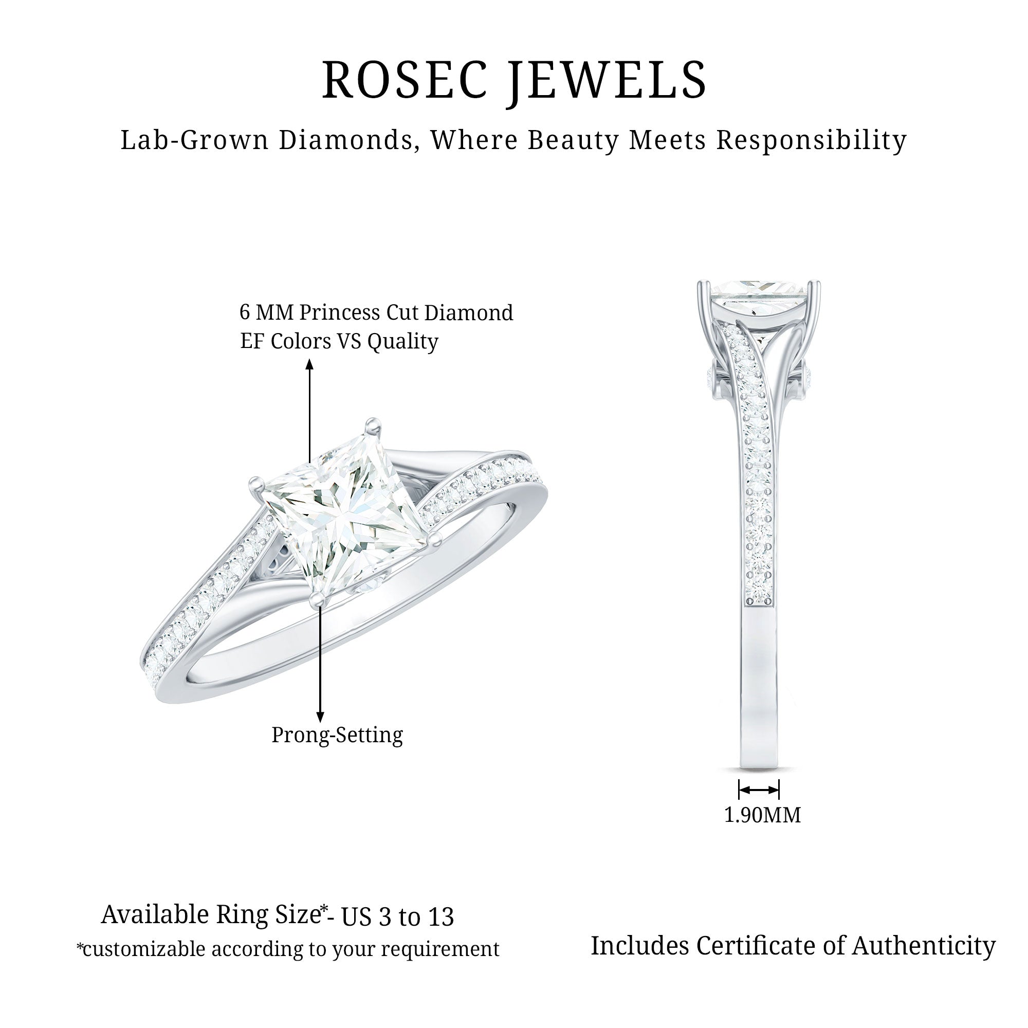 This captivating Lab Grown Diamond Engagement Ring features a contemporary twist on tradition that truly shines with its stunning brilliance from the solitaire gemstone. The Solitaire Engagement Ring showcases a 6 MM Princess Cut Lab Grown Diamond set in prong setting, complemented by a split shank embellished with delicate round cut stones that add extra sparkle from every angle. This Square Engagement Ring exudes a simple yet elegant charm that is sure to catch your eye. The EF-VS Quality Lab Grown Diamond serves as a remarkable alternative to Natural Diamonds, taking center stage with its sleek design. Rosec Jewels is dedicated to preserving your special moments, ensuring they are filled with unforgettable memories, whether you are celebrating a promise, a birthday, an engagement, or any other significant occasion. This modern and elegant Princess Cut Engagement Ring for Women boasts a timeless style that is both sparkling and brilliant, symbolizing beauty, love, and commitment. Delight your girlfriend, wife, or fiancee with this Split Shank Engagement Ring, characterized by its minimalistic aesthetics, making it a meaningful gift for someone dear to your heart.