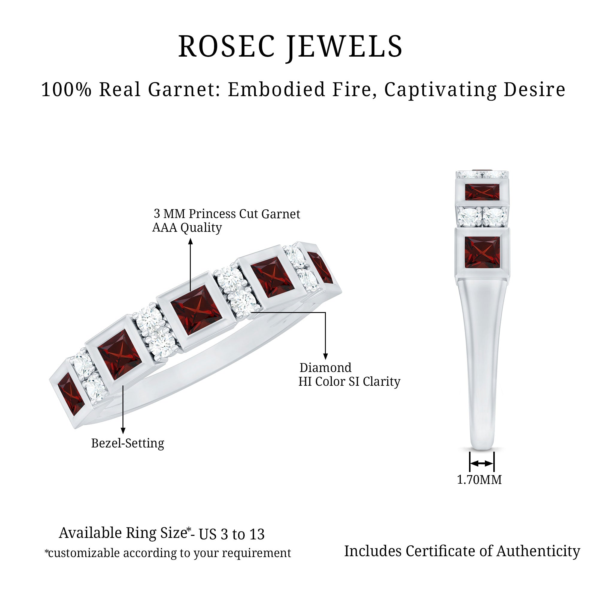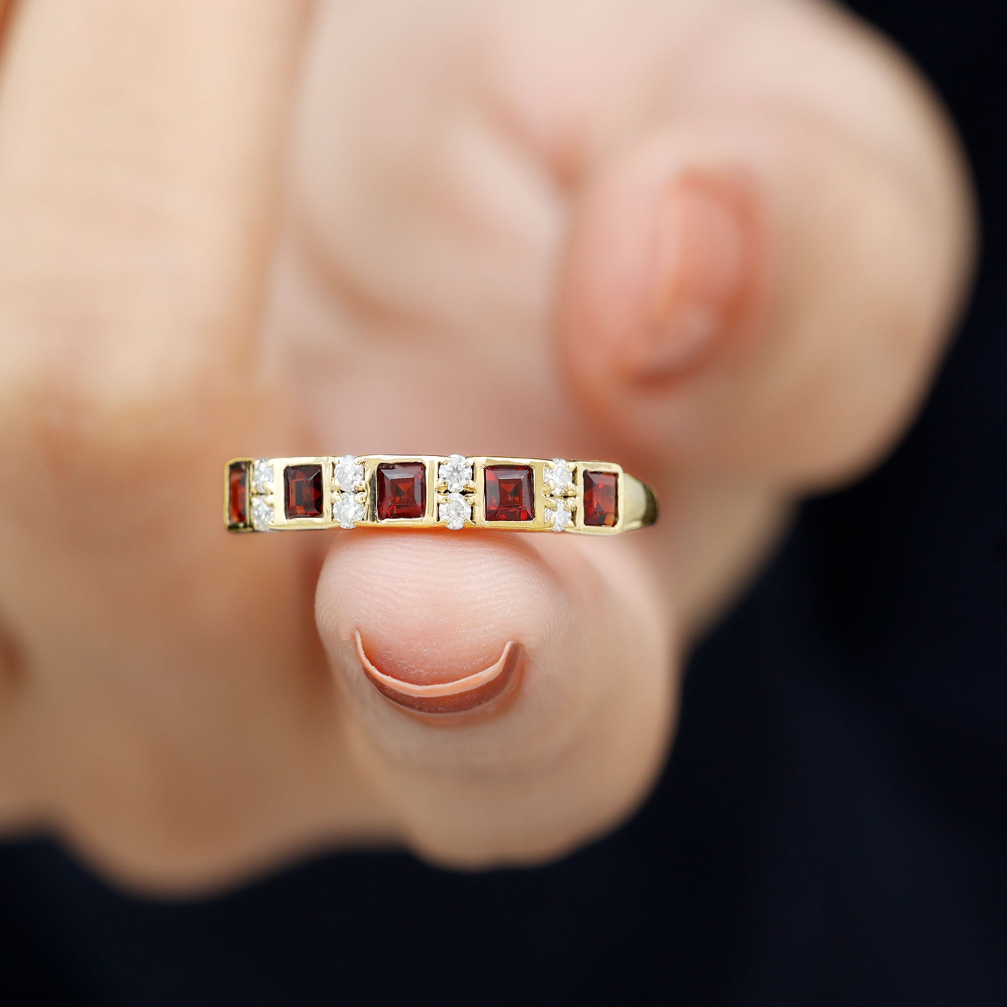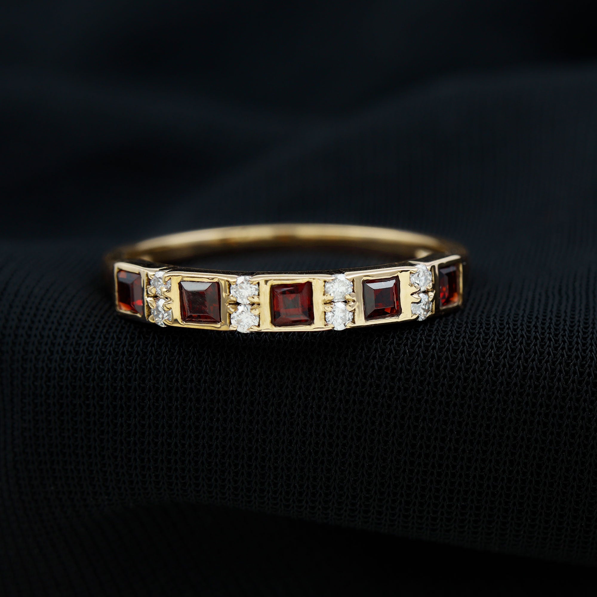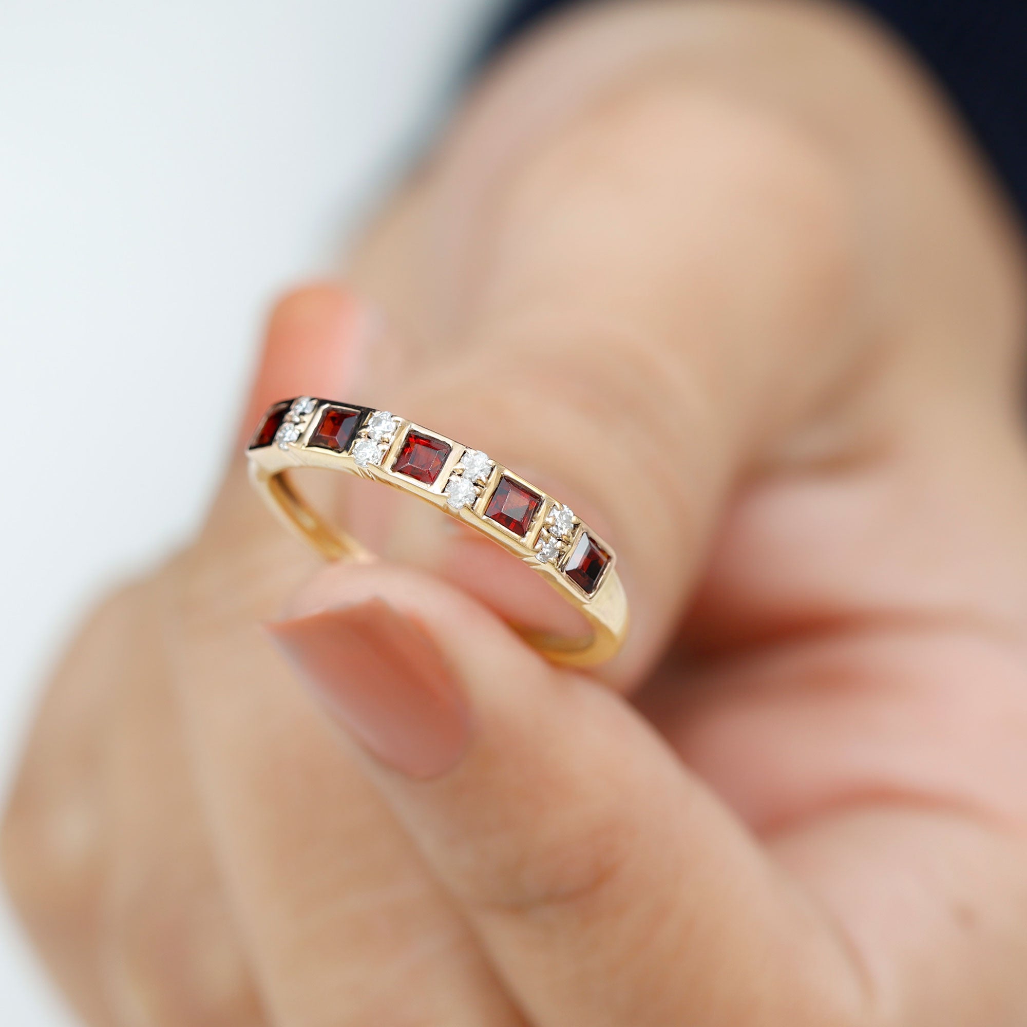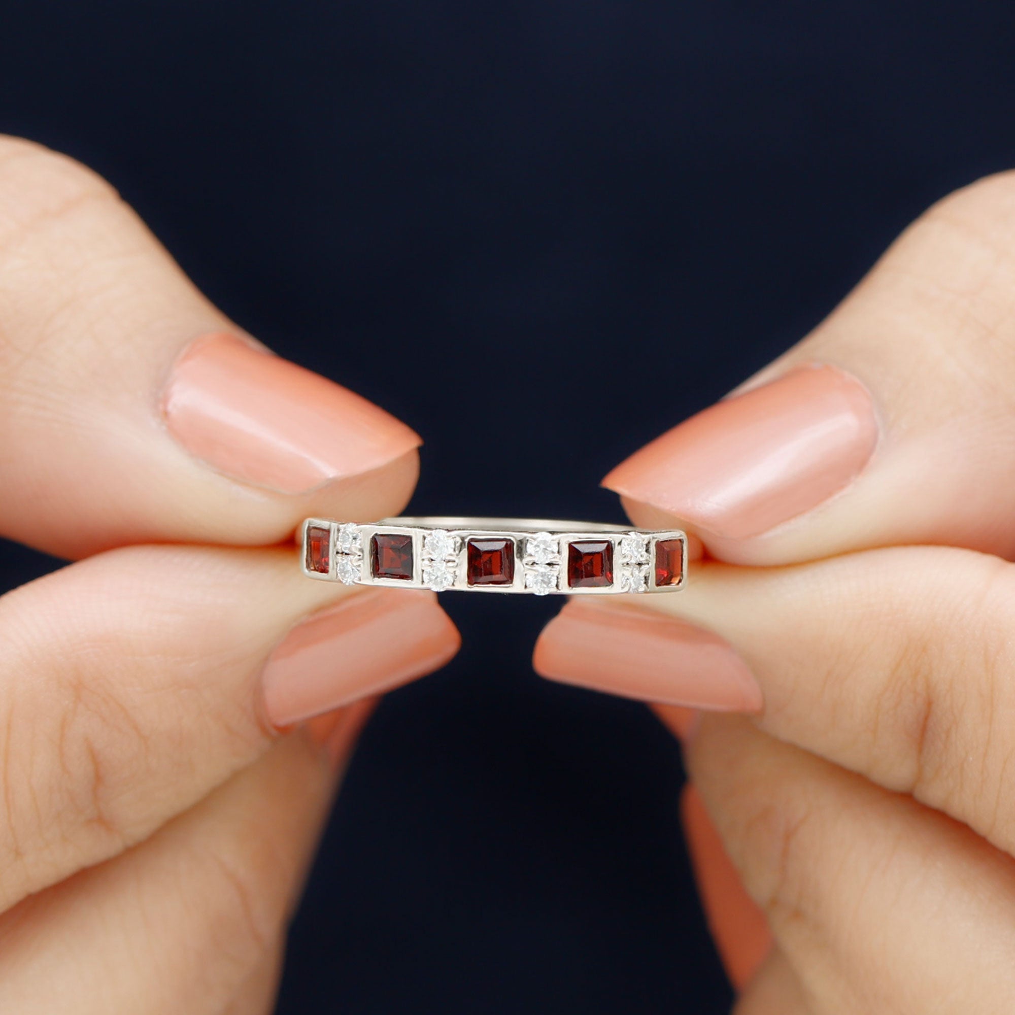 A perfect choice to celebrate a love that lasts, this Half Eternity Ring is a stunning symbol of passion and commitment. The deep 3 mm Princess Cut Garnet stones are beautifully arranged alongside sparkling Round Shape Diamond stones, creating a harmonious blend of bold color and delicate brilliance. The half eternity design allows the ring to shine elegantly on her hand while remaining comfortable for everyday wear. Meticulously crafted with care and available in various US ring sizes, this Garnet Eternity Ring is designed to fit perfectly while capturing the essence of a love that grows stronger with each passing year. Delivered in a signature jewelry box, this Garnet Diamond Ring is ready to gift and sure to create a memorable, heartfelt moment. This Princess Cut Garnet Ring represents shared memories, devotion and the promise of many more milestones together. Let this Garnet Eternity Ring be a radiant reminder of your enduring love, a piece she will treasure forever and always wear close to her heart.