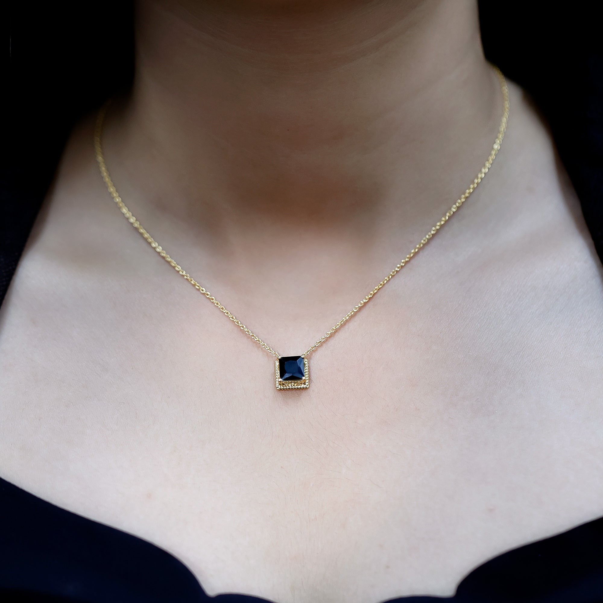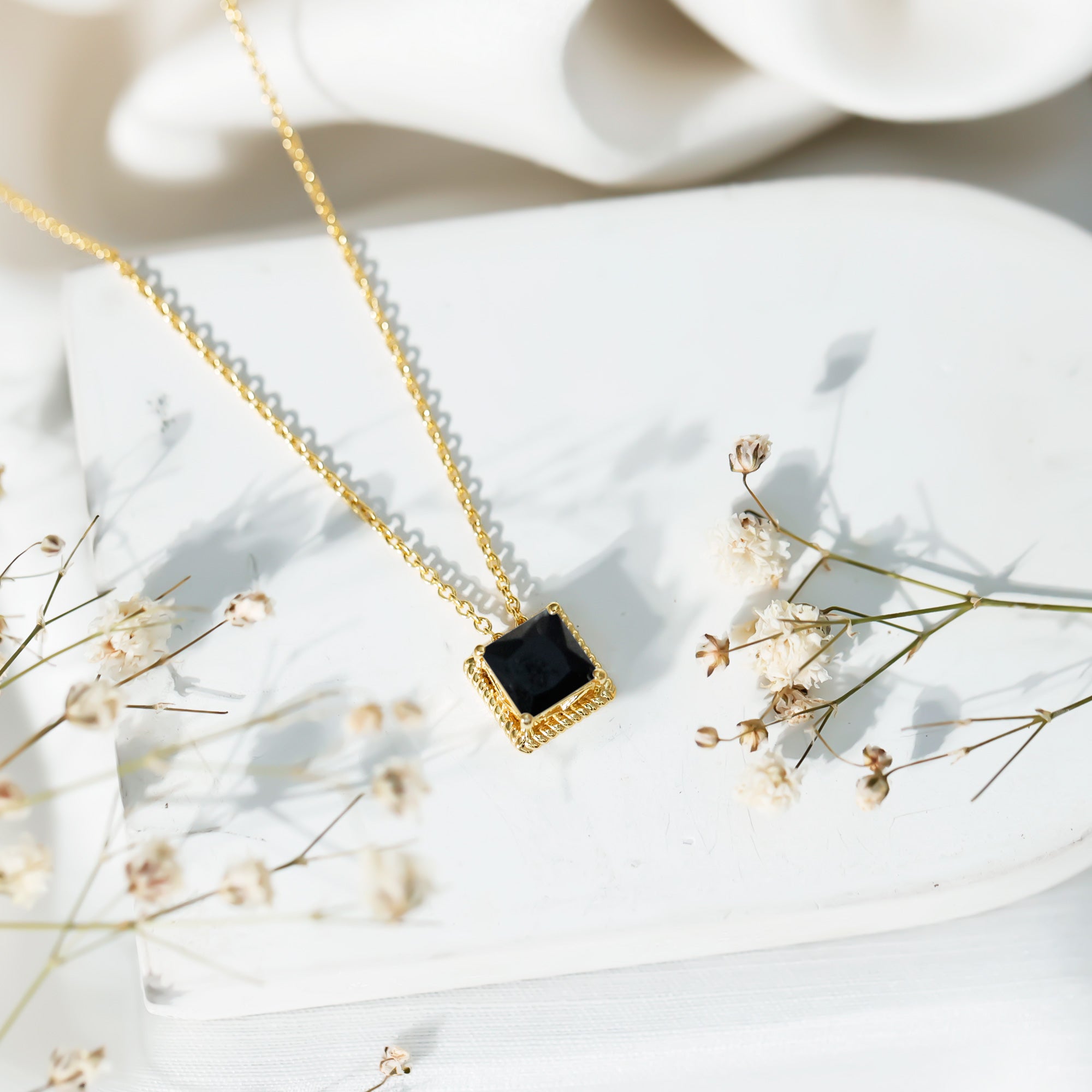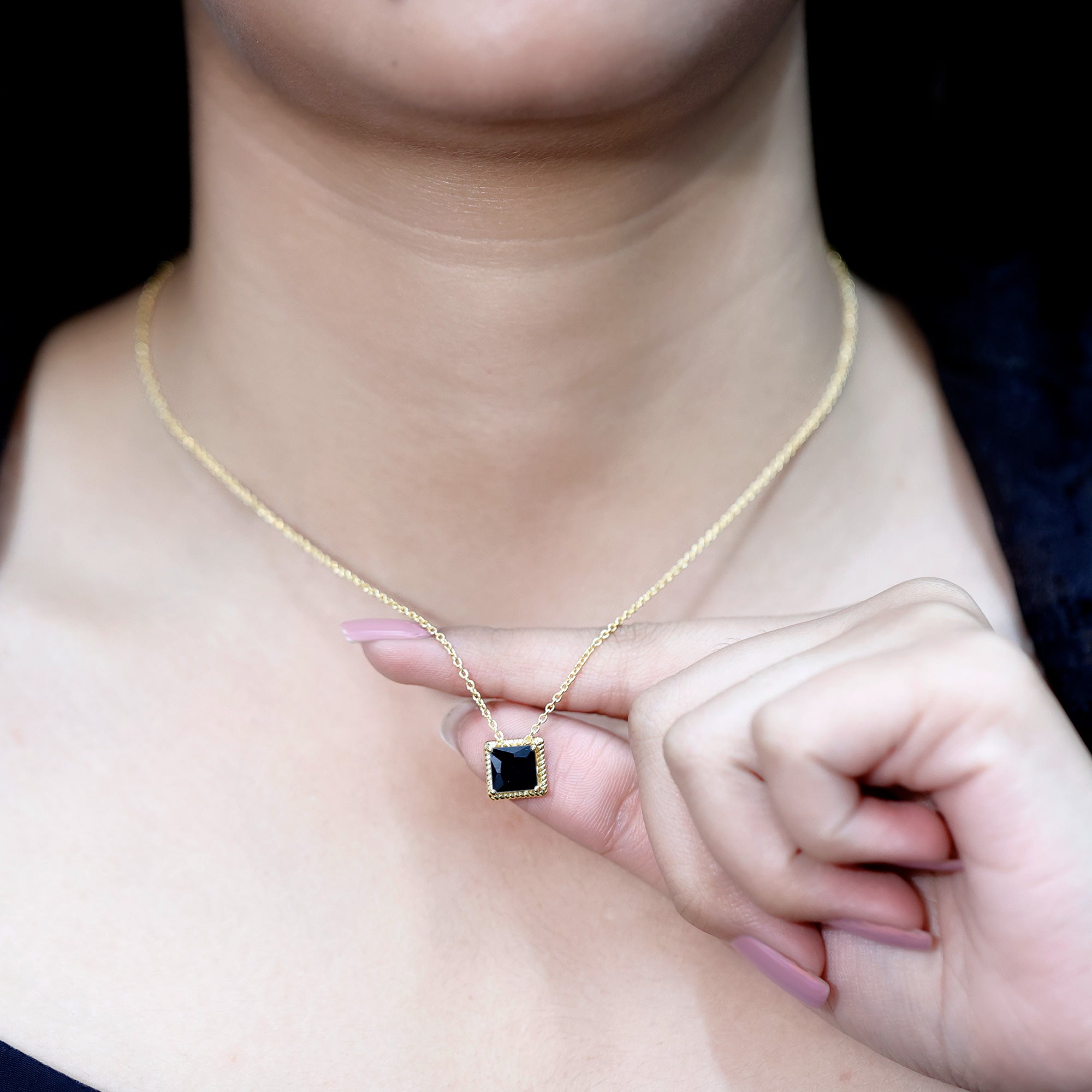 Add a bold touch to your everyday style with a necklace that speaks elegance. If you are looking for something modern, sophisticated, and full of character, this Lab Created Black Diamond Necklace is exactly what your jewelry collection needs. At the heart of the design is a striking 7 MM princess cut lab grown black diamond, set in prong setting. What sets this Princess Cut Necklace apart is the beautiful twisted rope frame that surrounds the center stone. Crafted in 14k yellow gold plated silver, the detailed rope pattern gives the pendant a rich, textured look with a touch of vintage charm. This Black Diamond Solitaire Necklace is not only ethical but also environmentally friendly, perfect for those who care about the planet as much as they do fashion. Suspended from a durable chain with a standard bail, this Black Gem Necklace is made for comfortable, secure wear all day long. Whether you are dressing up a basic tee or adding polish to your evening outfit, it transitions effortlessly from casual to elegant. It also makes a thoughtful and meaningful gift for someone who loves to stand out without saying a word. So, whether you are heading into a meeting or a night out, let this Womens Black Diamond Necklace add that subtle wow factor to your look.