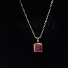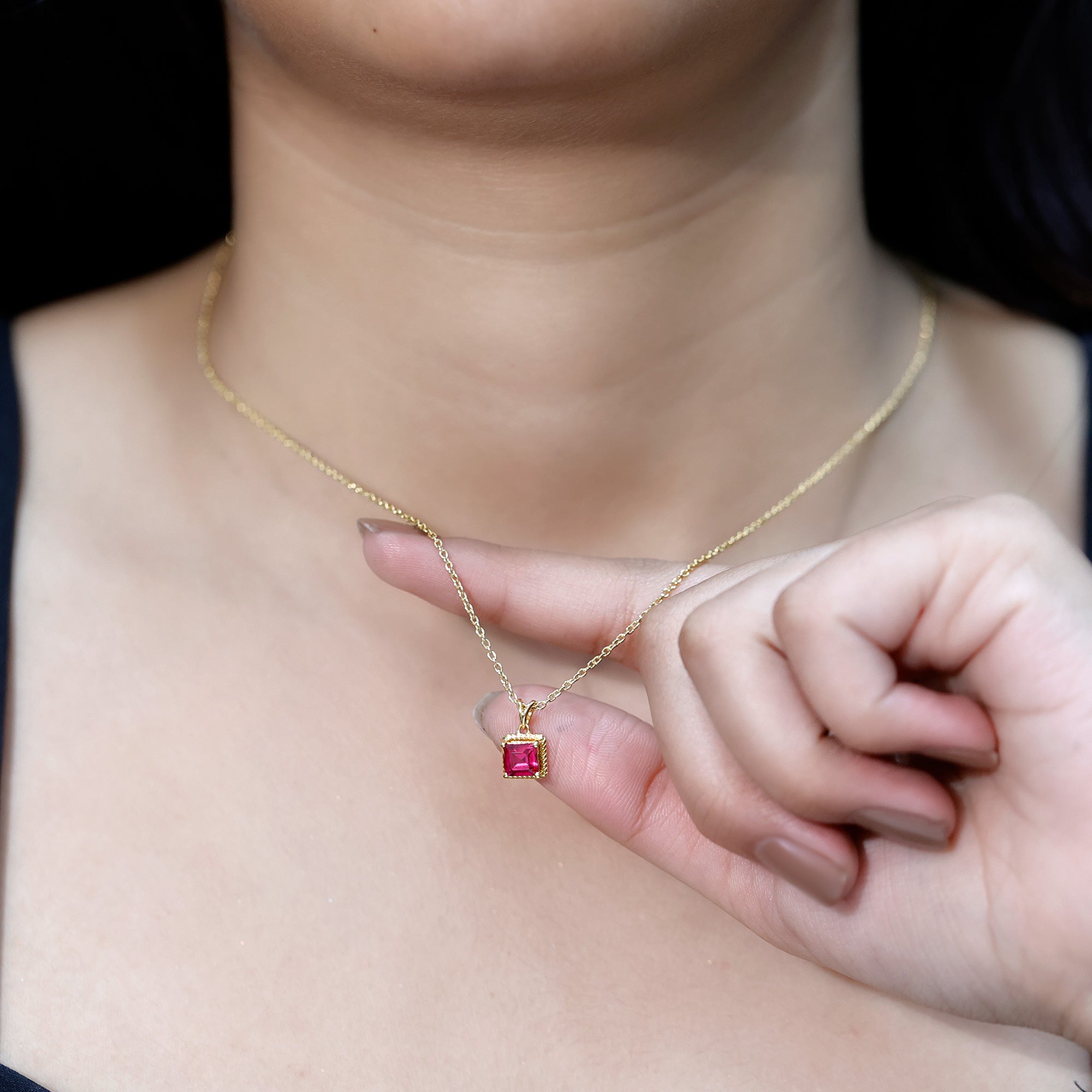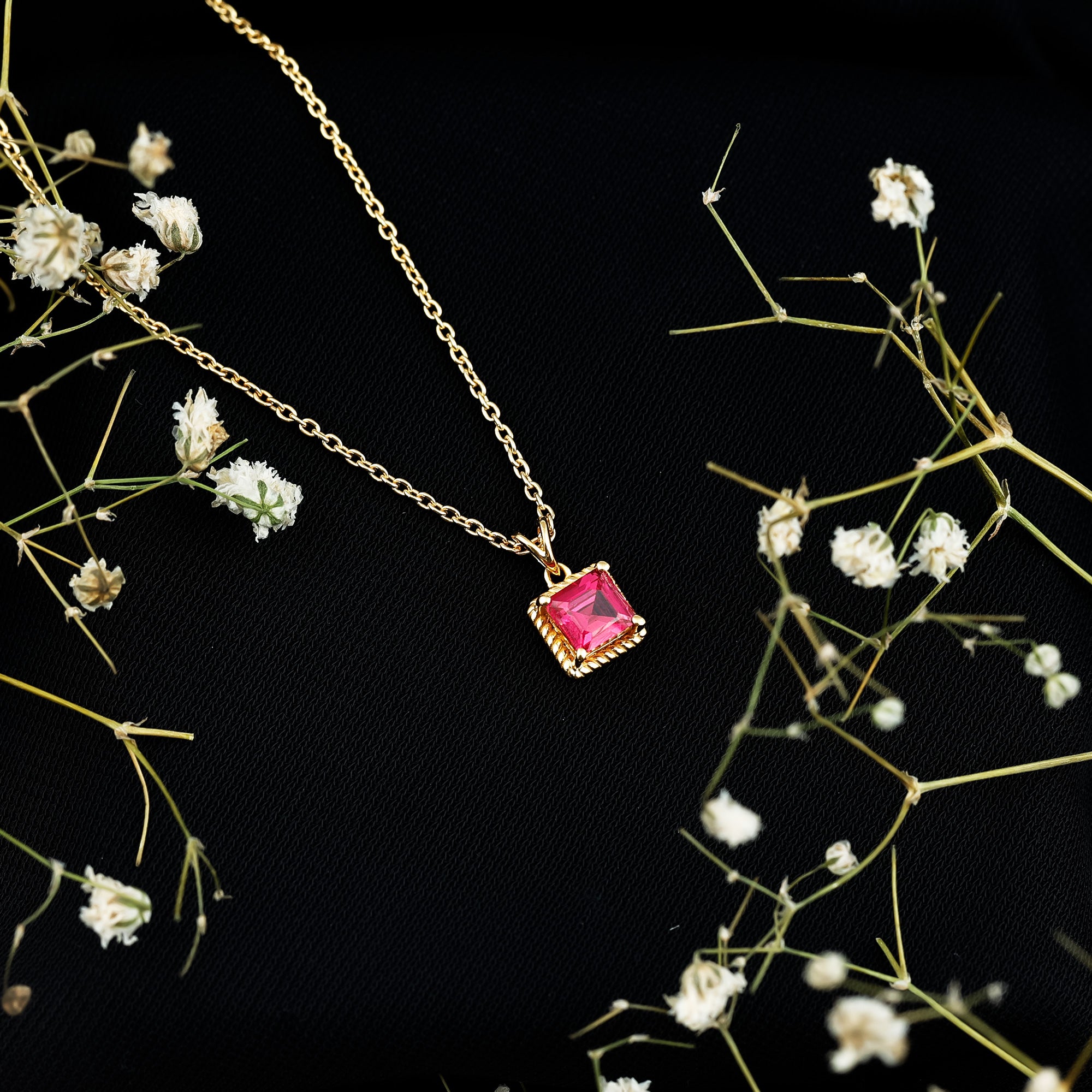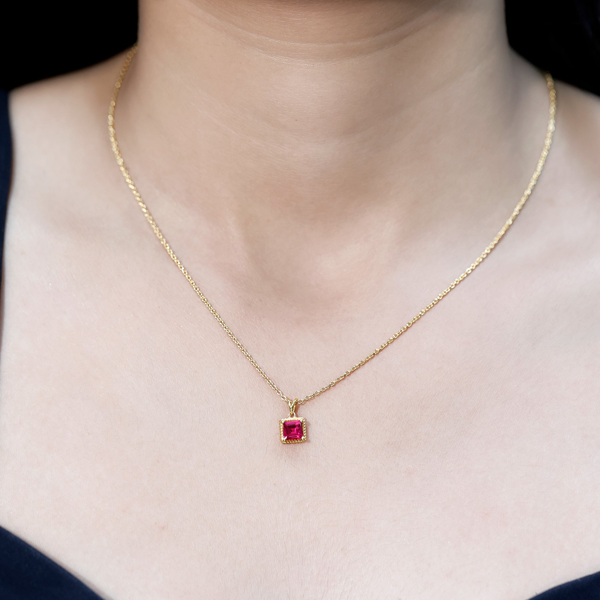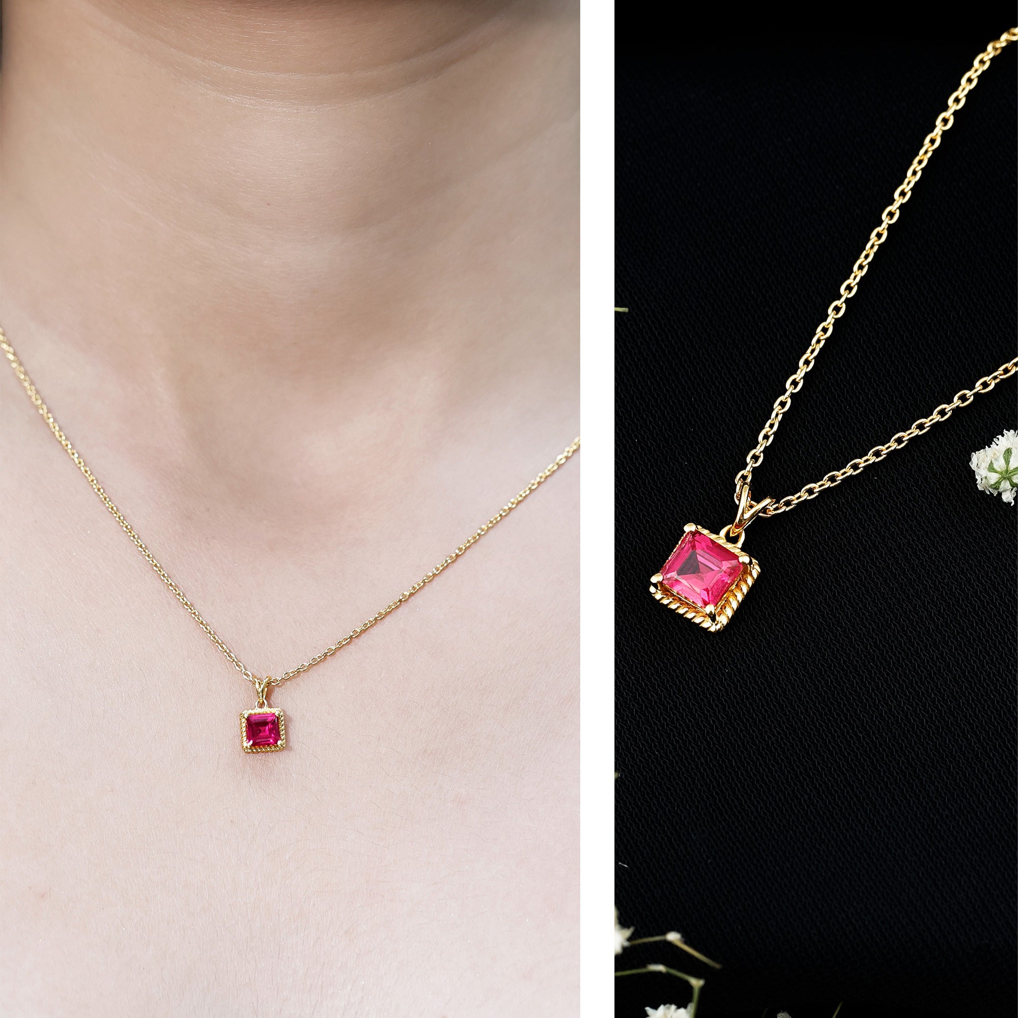 Make a statement that lasts forever with this stunning Princess Cut Ruby Necklace, a timeless piece designed to turn heads. Crafted in 14k yellow gold plated silver, this Solitaire Necklace centers around a vivid 5 MM princess cut lab created ruby, expertly set in secure prong setting. The romantic red of the ruby is beautifully framed by a twisted rope border, adding a touch of texture and vintage charm to the sleek, modern cut of the stone. Suspended from a polished cable chain, the Ruby Pendant Necklace is finished with a graceful rabbit ear bail that enhances the overall elegance and gives it a distinctive silhouette. The lobster clasp ensures a secure fit and easy adjustment for your ideal length, whether you wear it solo or layered with other favorites. This AAAA quality lab created ruby offers exceptional clarity and color, delivering the same beauty and brilliance as a natural gemstone, but with a sustainable and ethical origin. Perfect for both special occasions and everyday wear, this Red Ruby Necklace brings just the right amount of color and sophistication to any outfit. Elegant, fiery, and unforgettable, this Sterling Silver Ruby Necklace is a piece you will treasure forever.