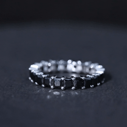 Celebrate the extraordinary person in your life with this remarkable Eternity Band Ring. This ring features a distinctive Princess Cut Created Black Diamond, expertly placed in a Shared Prong Setting on a Full Eternity Ring.