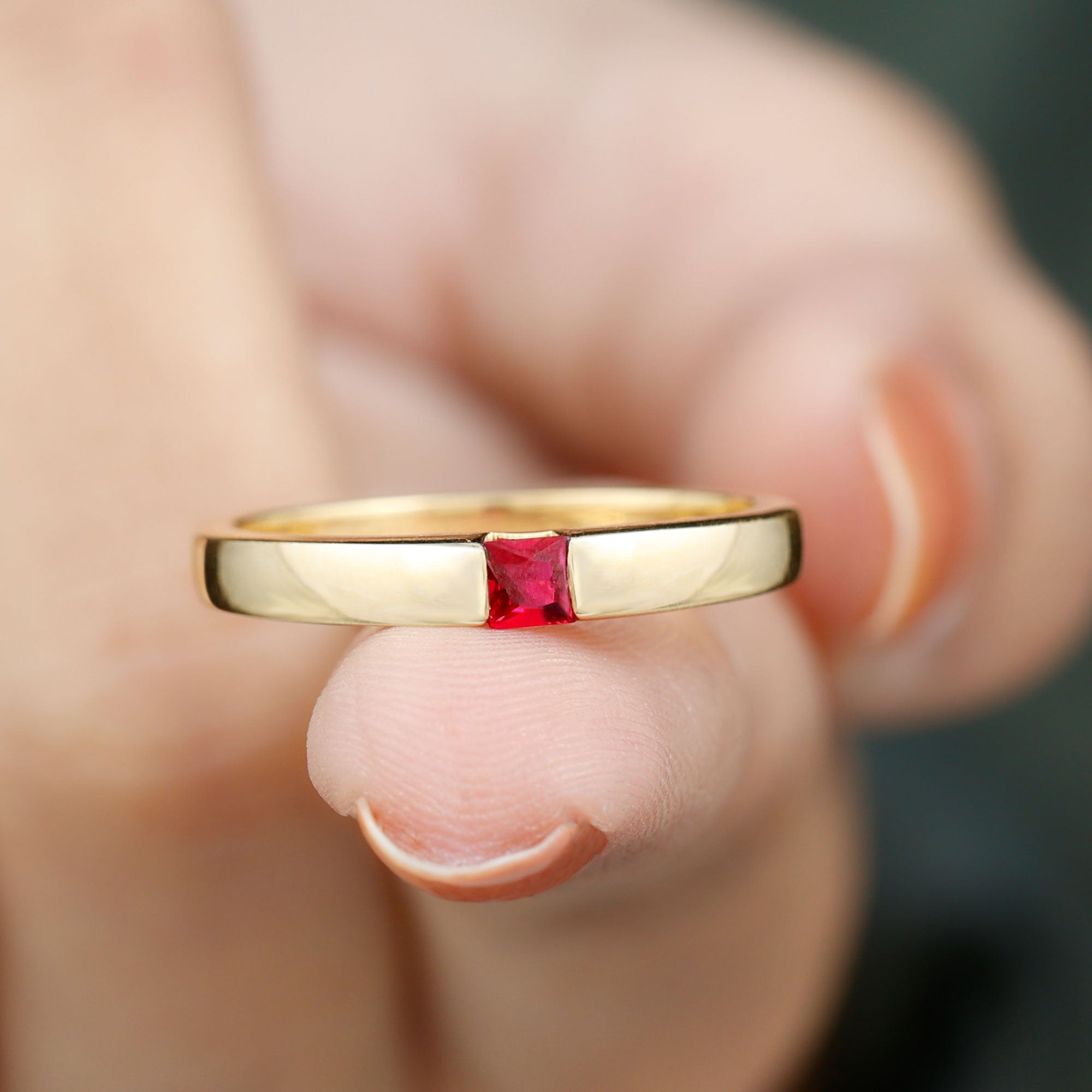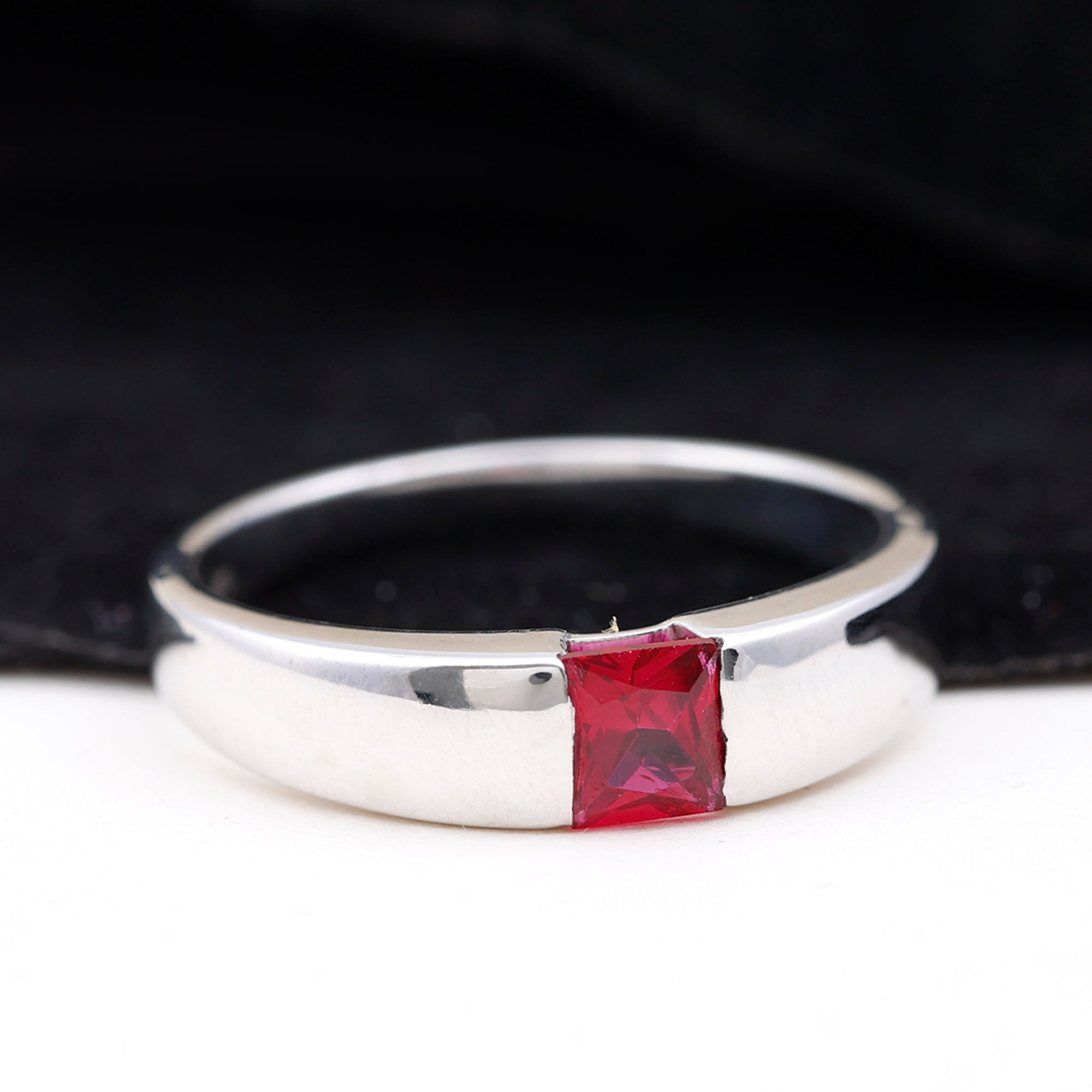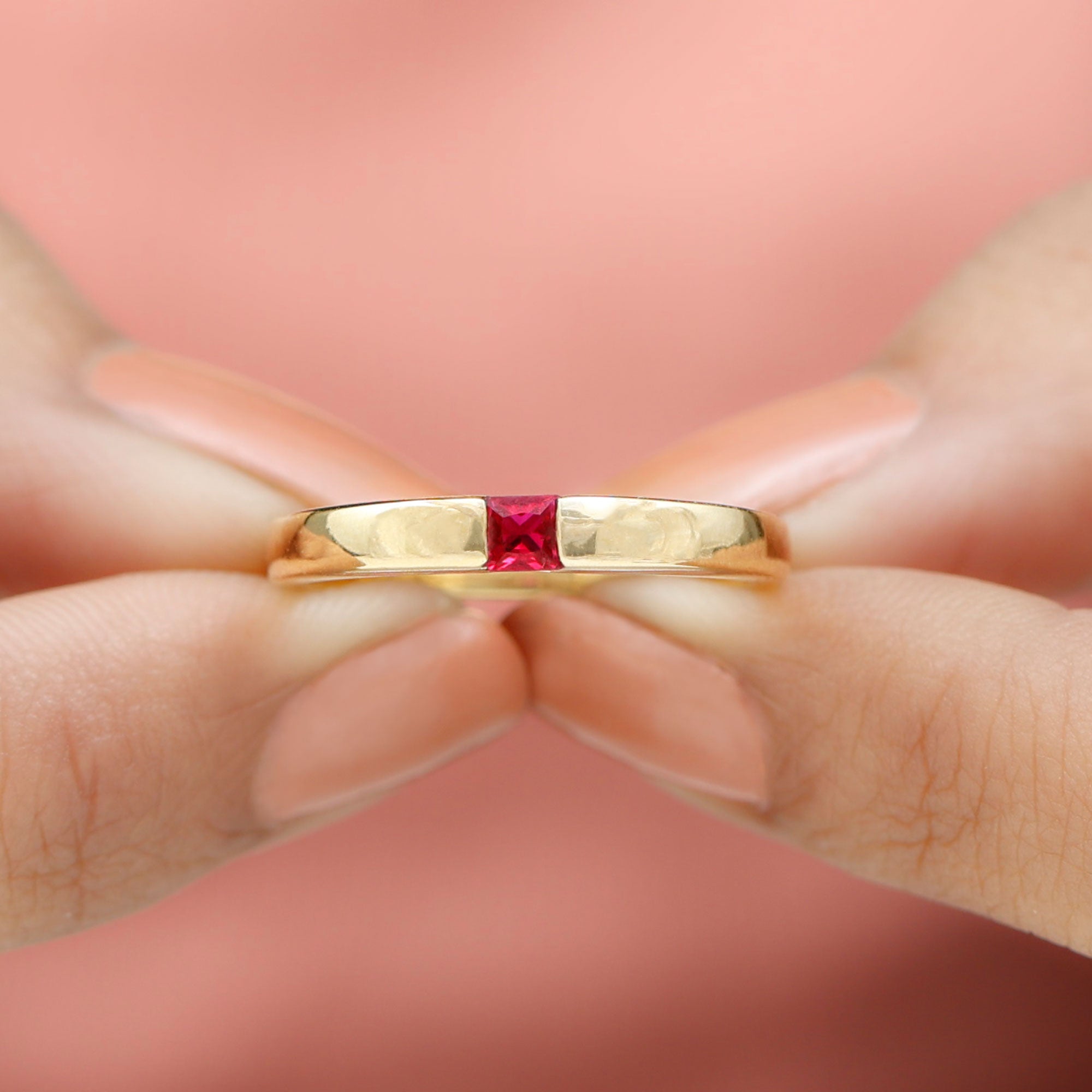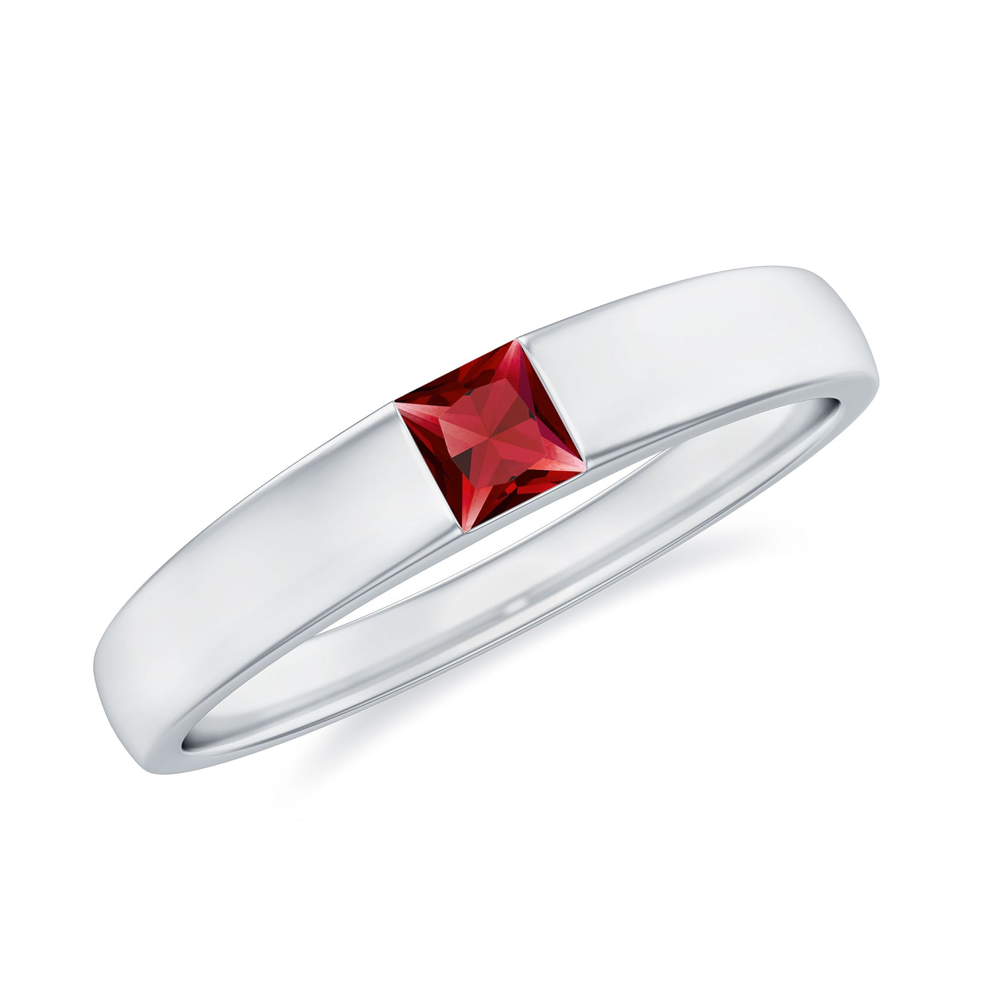 Make a promise of forever with this Solitaire Promise Ring adorned with Princess Cut Created Ruby elegantly set in flush-setting. The deep red allure of ruby symbolizes love and compassion designed to capture her heart. With unique design and infinite sparkle, the Created Ruby Ring makes a thoughtful or meaningful present for your loved ones.