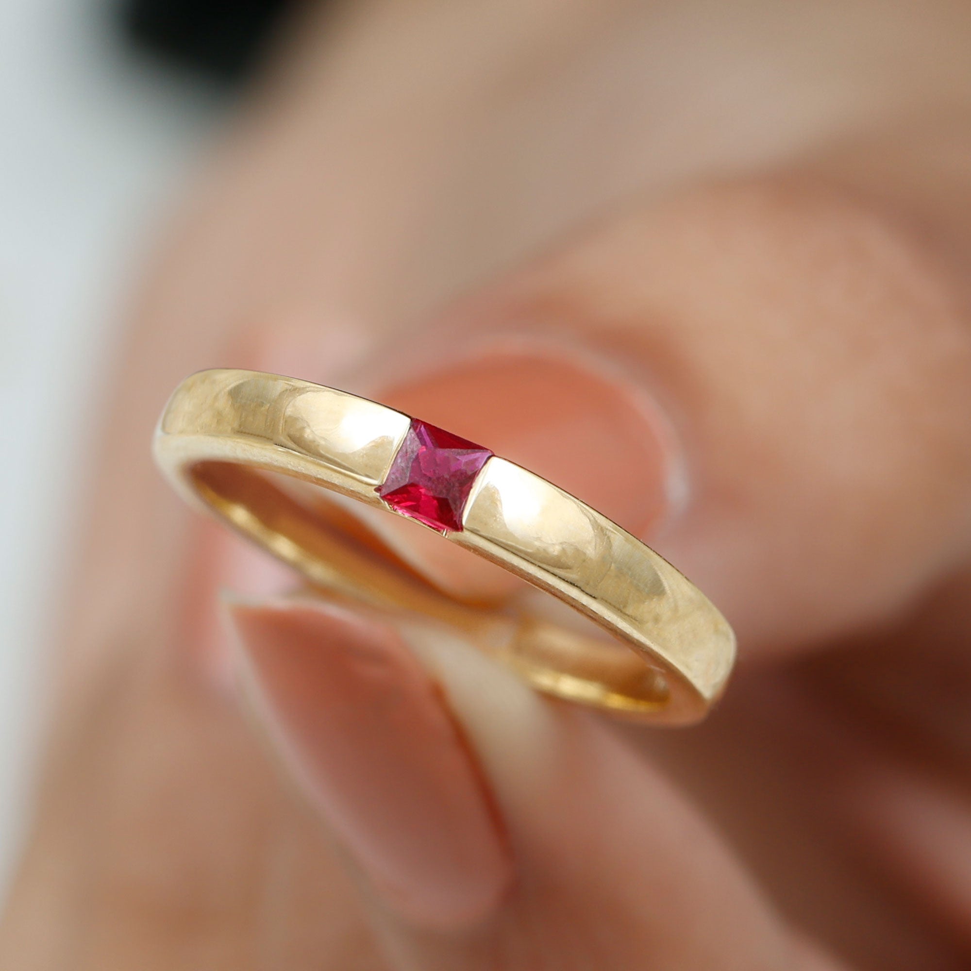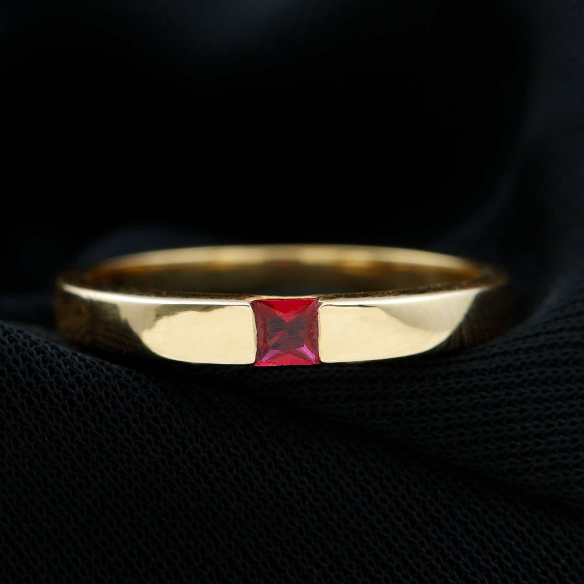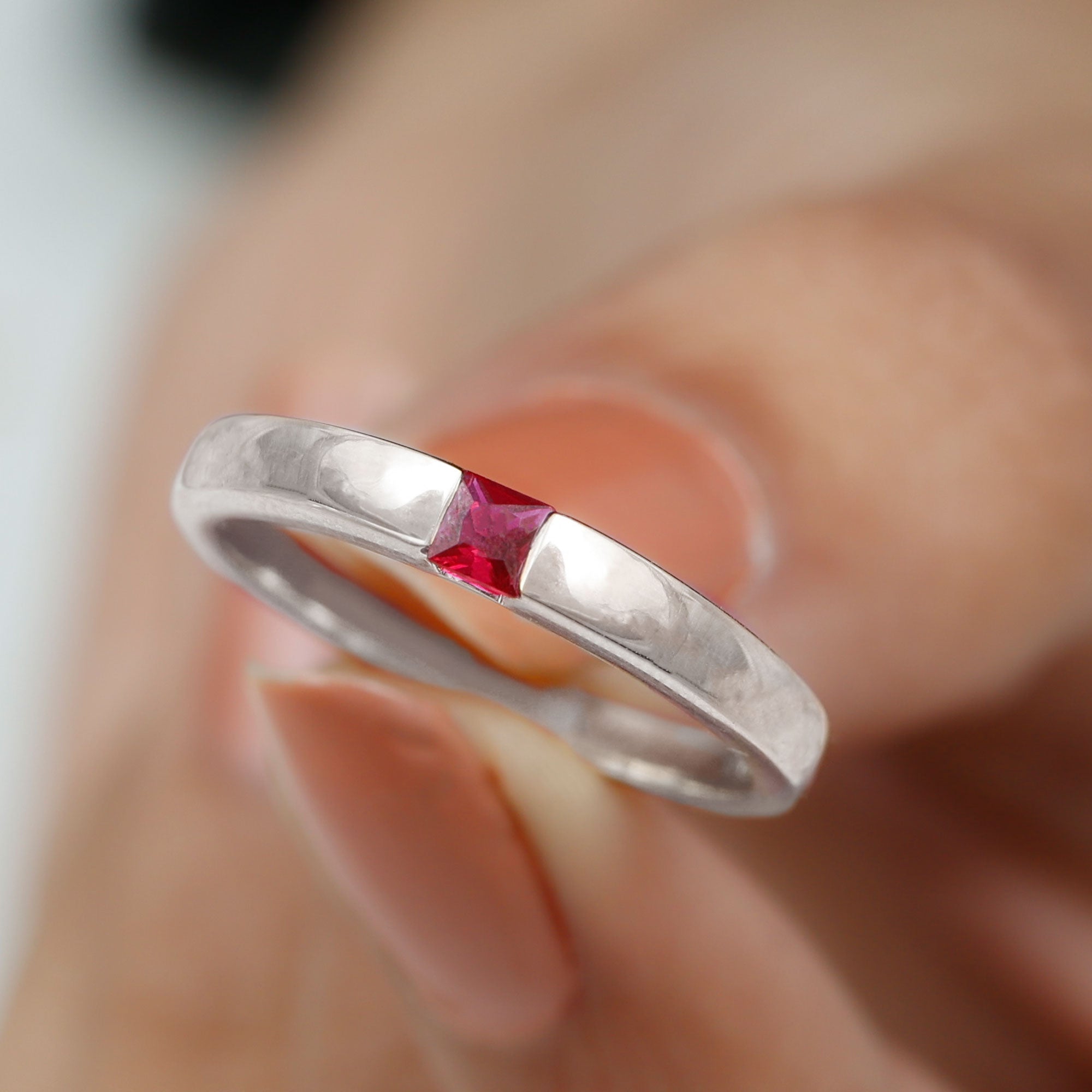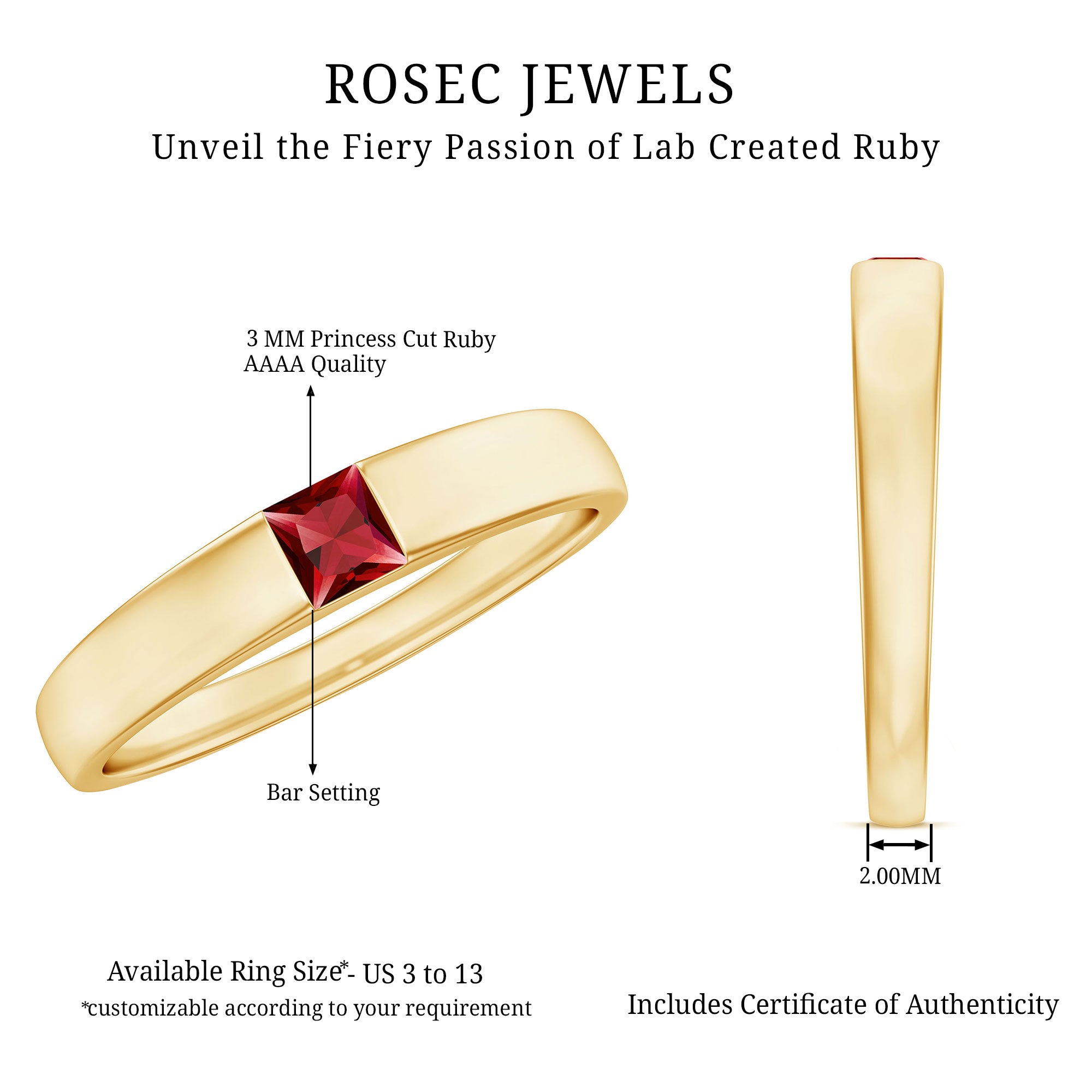 Make a promise of forever with this Solitaire Promise Ring adorned with Princess Cut Created Ruby elegantly set in flush-setting. The deep red allure of ruby symbolizes love and compassion designed to capture her heart. With unique design and infinite sparkle, the Created Ruby Ring makes a thoughtful or meaningful present for your loved ones.