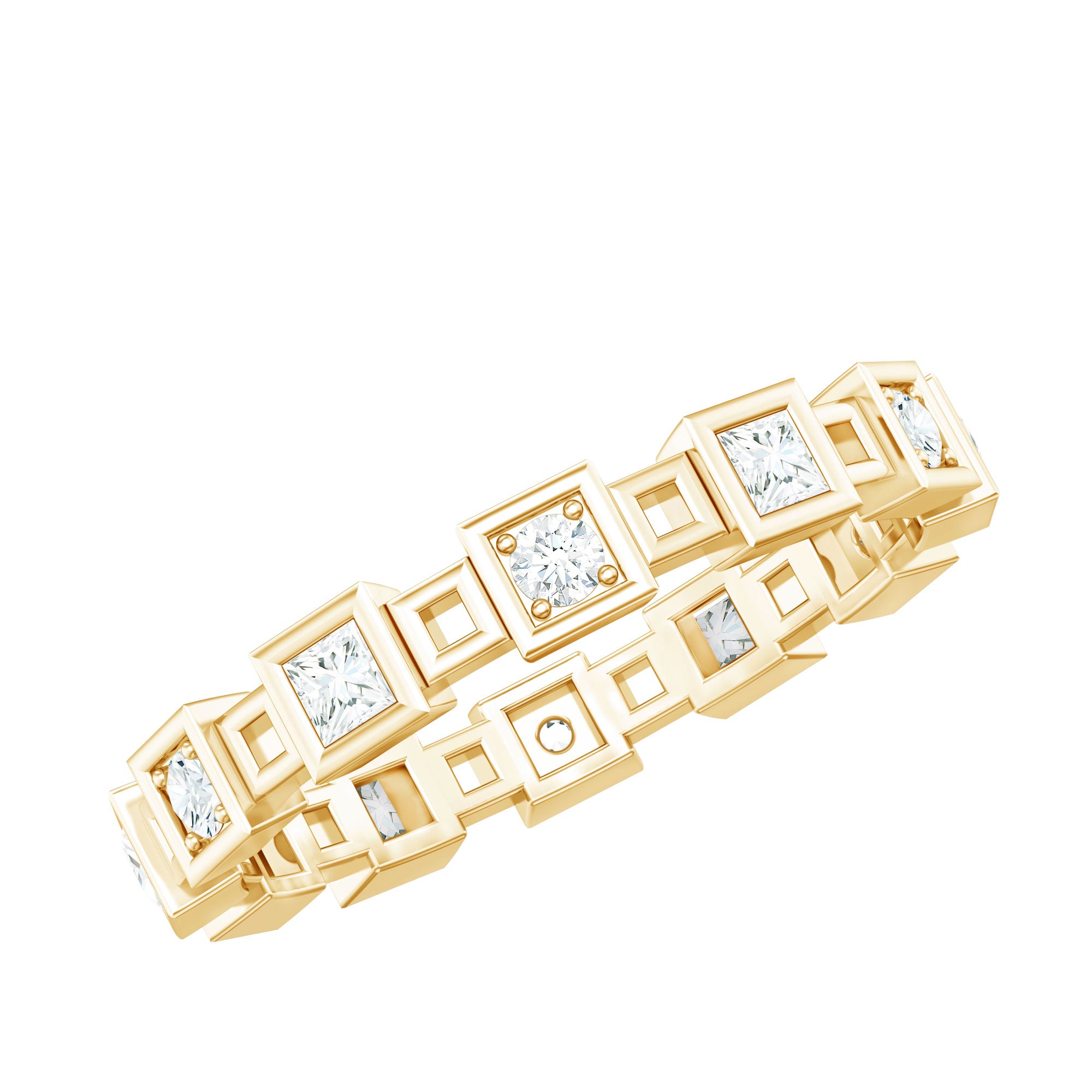 Bold, unique, and beautifully modern, this Moissanite Eternity Band is a true statement piece. Featuring an alternating pattern of princess and round cut moissanite stones, each set within square frames, this Wedding Band Ring brings together clean lines and eye-catching sparkle in a stunning geometric design. Whether you wear it as a wedding band, an anniversary gift, or a Moissanite Stackable Ring with a twist, it is sure to stand out. The open square motifs in between the stones add dimension and airiness to the overall design, giving it a lighter, architectural feel despite its bold presence. This Geometric Wedding Band is perfect for someone who appreciates a sleek, modern aesthetic but still wants that timeless sparkle. It is minimal, yet intricate. Refined, yet expressive. The structured layout gives the piece a strong identity, making it ideal for stacking with other rings or wearing solo as a signature look. The craftsmanship ensures each D-VS1 quality moissanite is set securely and precisely, catching the light at every angle without being overly flashy. Whether you are marking a special moment or simply treating yourself to something striking and meaningful, this contemporary band blends contemporary design with classic brilliance in the most effortless way.