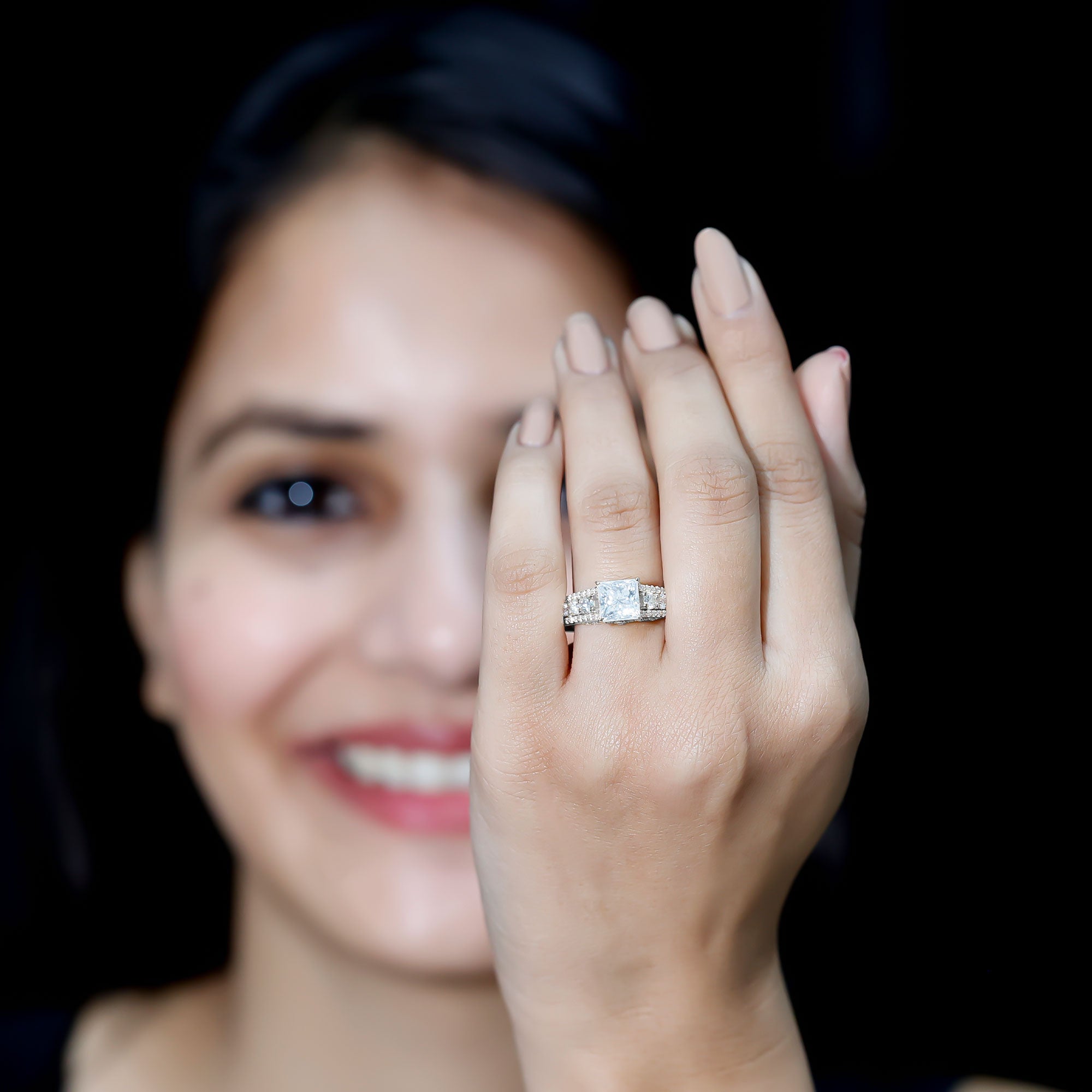 Celebrate your love with this captivating Princess Cut Moissanite Engagement Ring, a flawless blend of timeless elegance and contemporary brilliance. At its heart lies a dazzling 8 MM princess cut moissanite, securely set in prong setting that showcases the stone’s exceptional clarity and fire. This striking Square Engagement Ring features shimmering side stones that enhance the brilliance of the center gem, adding depth, radiance, and a luxurious finish. The overall design flatters the finger with a structured yet elegant presence, making it a standout piece that is both refined and eye-catching. Meticulously crafted with attention to every detail, this Side Stone Engagement Ring reflects superior craftsmanship and enduring quality. It is a perfect choice for life’s most meaningful moments, from heartfelt proposals to wedding anniversaries and beyond. Designed to symbolize lasting commitment, it’s a ring that tells your unique story with timeless beauty. Presented in an elegant signature jewelry box, this Statement Ring is ready to be gifted and cherished. A true statement of love, it blends modern aesthetics with classic charm, making it a piece to treasure for a lifetime.