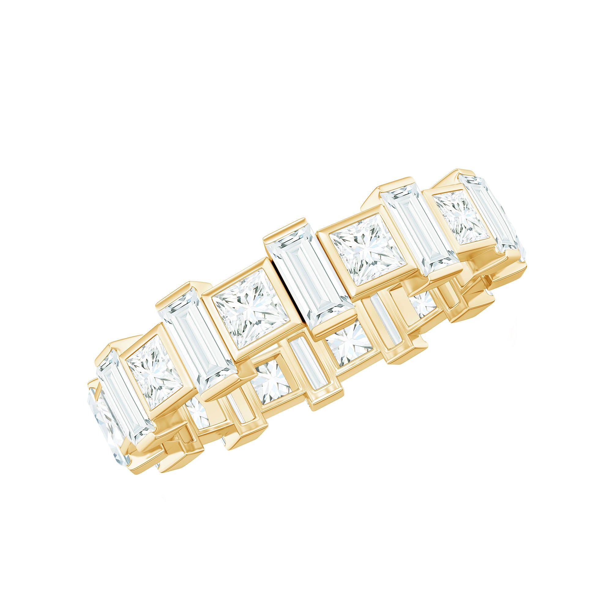 This Moissanite Eternity Ring blends classic beauty with a modern twist. Designed with alternating princess cut and baguette cut moissanite stones, it shines brightly from every angle. The princess cut stones are set in secure bezel setting, while the baguette cut stones are held in safe bar setting, creating a stylish and eye-catching pattern all around the band. Each moissanite stone is D-VS1 quality, offering amazing brilliance and fire. Whether you are celebrating a wedding, anniversary, or any special occasion, this Eternity Wedding Band makes a perfect and meaningful gift. Its full eternity design represents never-ending love, adding deep symbolism to its sparkle. The ring’s unique, uneven design gives it a soft, elegant look that stands out. You can wear it on its own or stack it with other rings for a trendy layered style. It is made with comfort in mind, so it is easy to wear every day while still feeling special. Crafted to last a lifetime, this Moissanite Wedding Band is not only beautiful but also durable. It comes packaged in a luxurious jewelry box, making it ready to gift and sure to impress. Whether you are dressing up or keeping it casual, this Moissanite Anniversary Ring adds a glowing touch of elegance to any outfit.