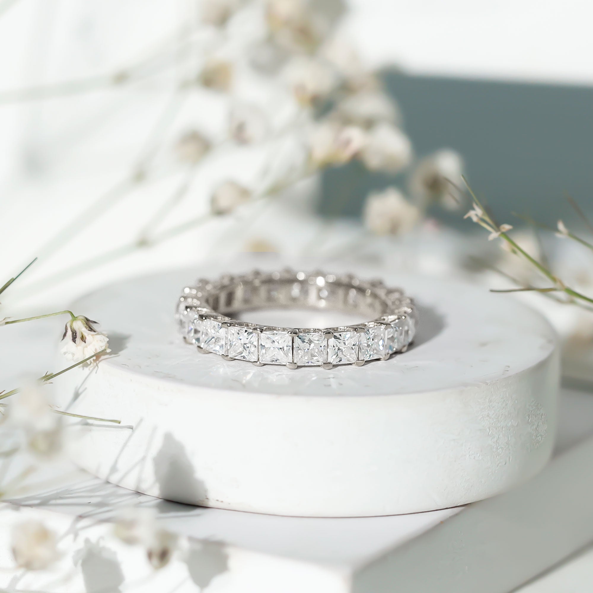 Mark your everlasting love with this dazzling Moissanite Eternity Band, a piece designed to bring sparkle and elegance to every moment. Expertly crafted, this Full Eternity Ring features a continuous row of princess cut moissanite stones set in shared prong setting. Its timeless design makes it a perfect symbol of love, commitment, and special memories. This Moissanite Wedding Band is not only stunning on its own but also versatile enough to be stacked with other rings, making it ideal for creating a personalized look. Whether worn as a wedding band, anniversary gift, or a meaningful token of affection, this Moissanite Band Ring is a thoughtful choice that will be cherished for years to come. Its elegant sparkle adds a touch of sophistication to everyday wear while still standing out on special occasions. Made with D-VS1 quality moissanite, this Princess Cut Wedding Band combines beauty with durability, ensuring it remains a treasured piece in any jewelry collection.