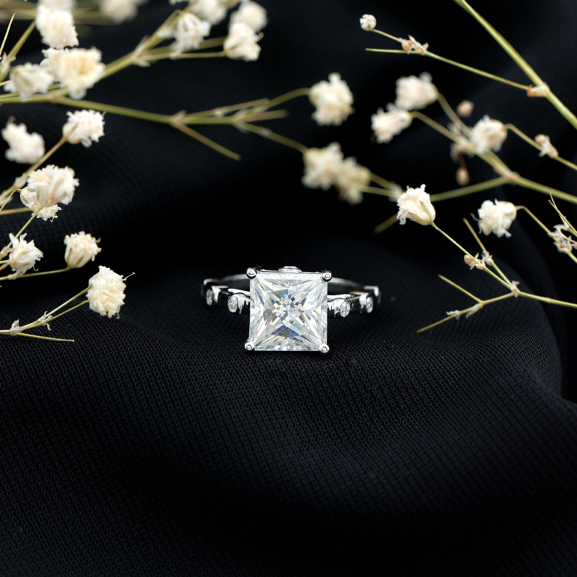 Princess Cut Moissanite Solitaire Engagement Ring with Spaced Accent
