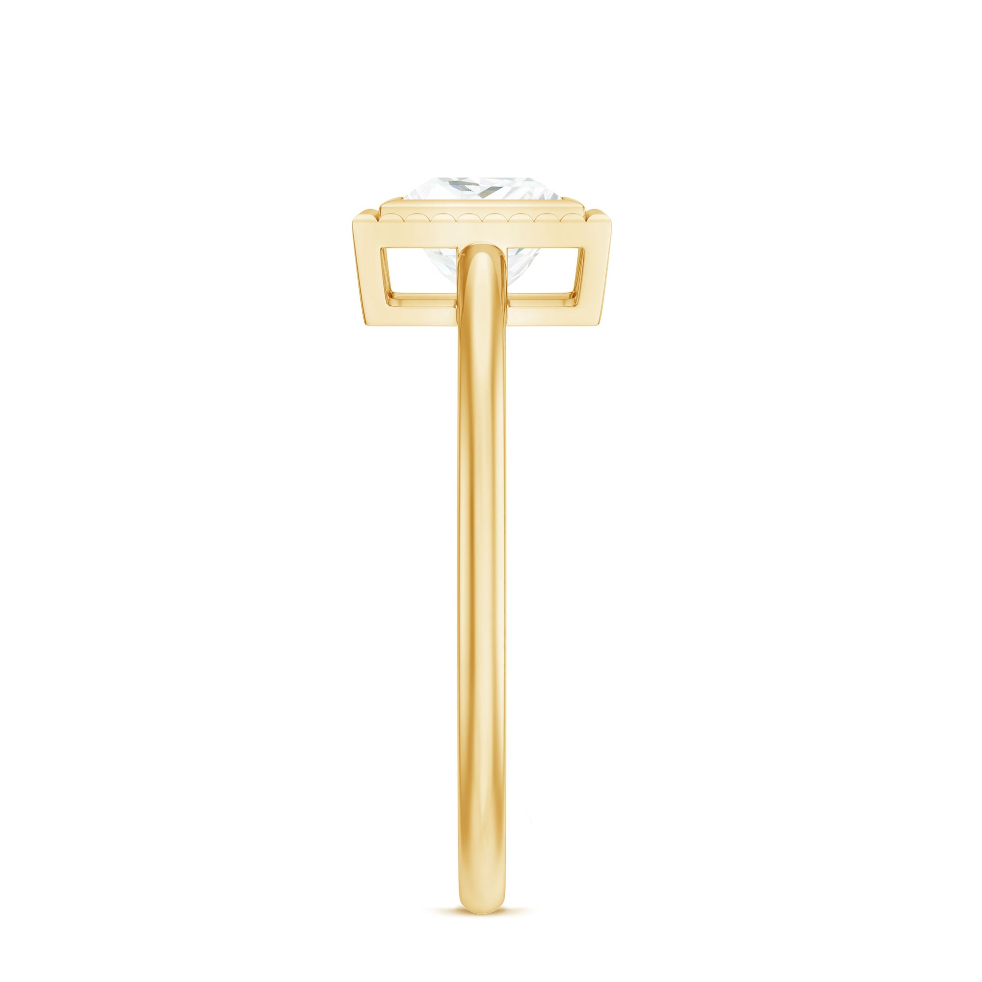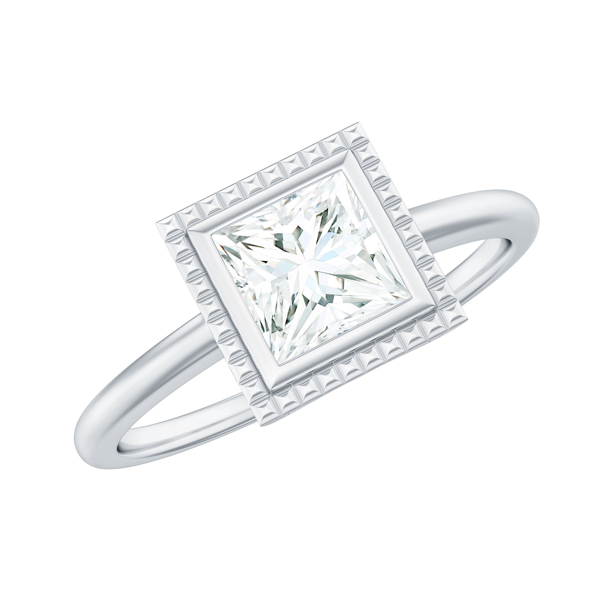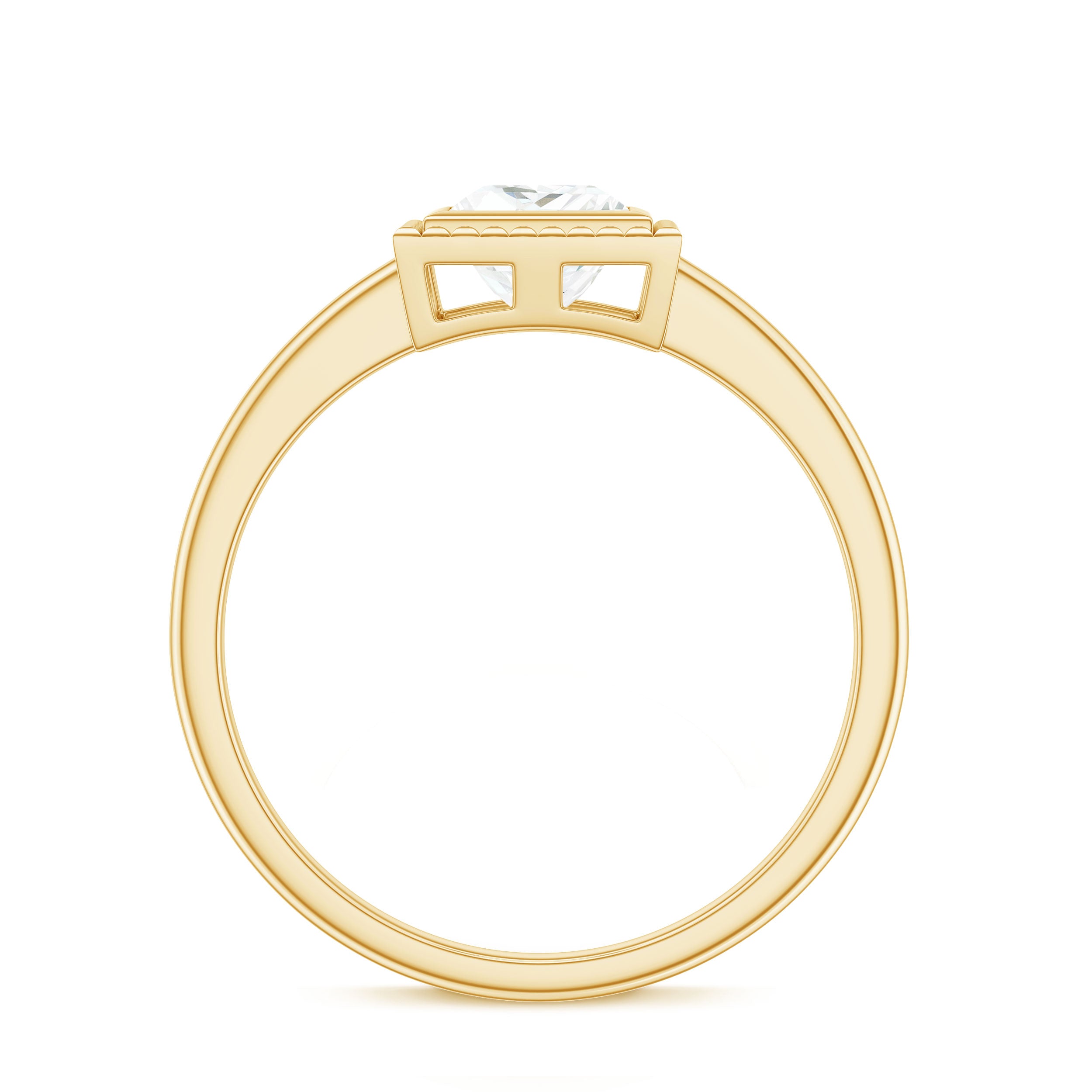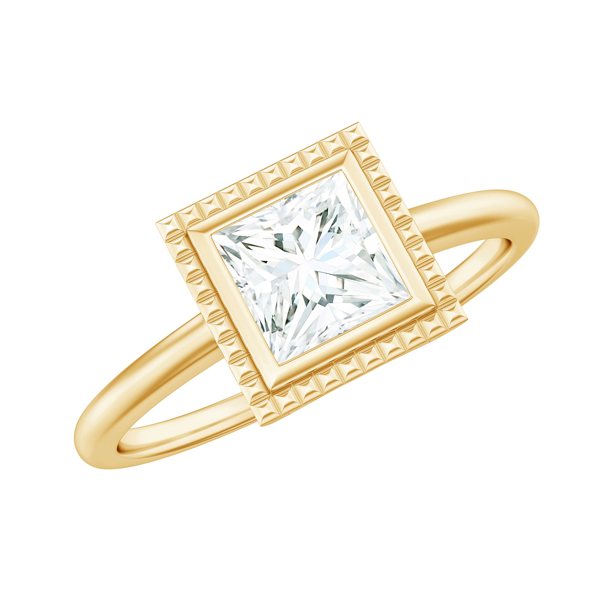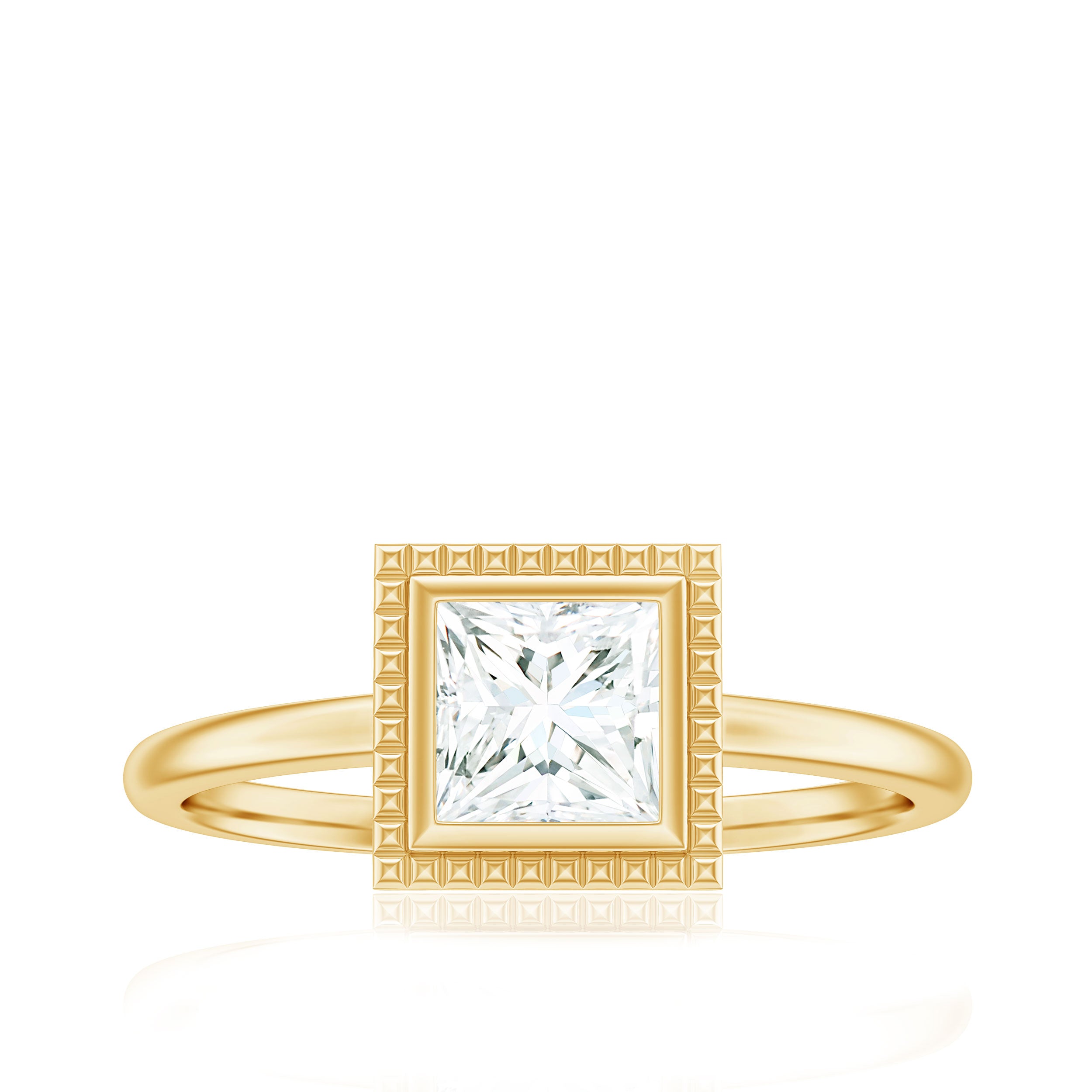 The Bezel Engagement Ring combines historic sensibility with modern and thoughtful details. This Solitaire Ring embellished with 5mm princess cut Moissanite set at the center as solitaire in a bezel setting surrounded with engraved style frame. These fascinating Princess Cut Moissanite Ring shine through your fingers. Having a mesmerizing appearance, this Moissanite Solitaire Ring have a unique shape which is beautiful and enthralling, making it so uniquely offering timeless elegance for everyday wear or by adding a touch of glamour for special events. Having a mesmerizing beauty, this Single Stone Ring has a mesmerizing beauty with exquisite craftsmanship that would ignite your style with fiery style. Having a unique beauty, This Princess Cut Solitaire Ring bring a sense of warmth and energy to the wearer.
