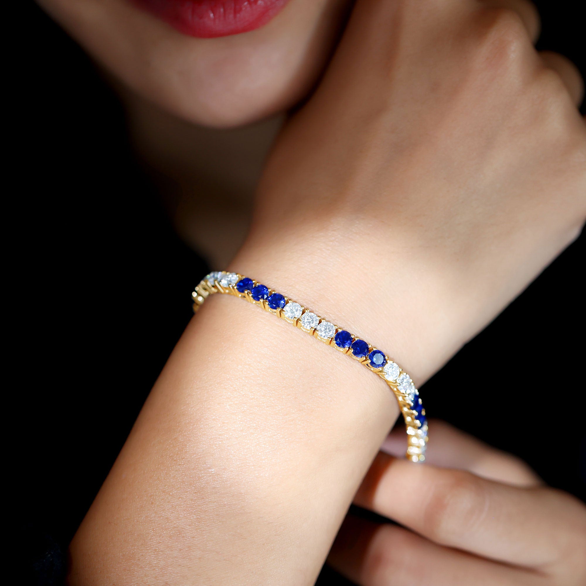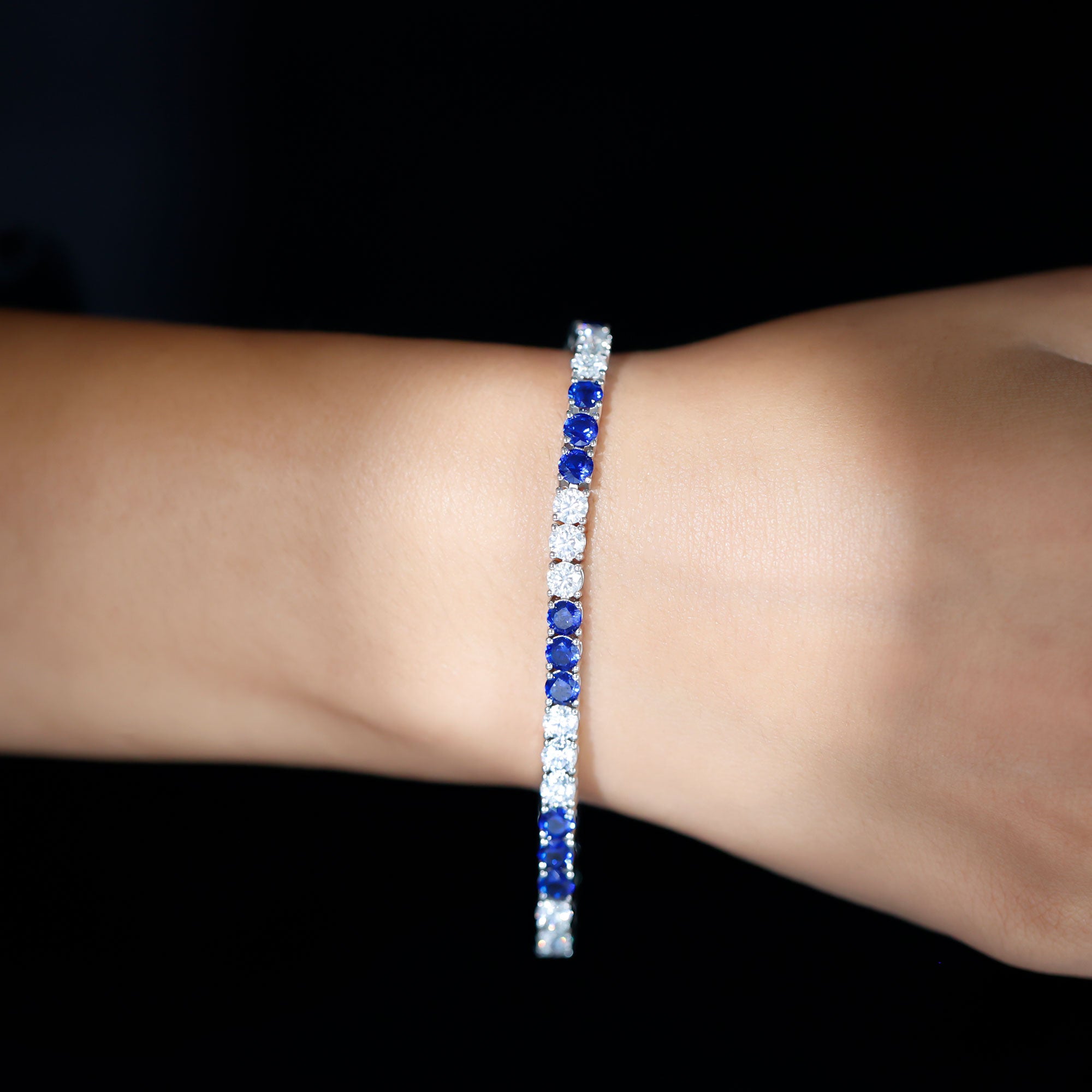 This Lab Grown Diamond Bracelet is a luxurious and charming accessory to adorn your wrist. Indicating love and commitment, this Bracelet is beautifully adorned with Round Shape Lab Grown Diamond and Lab Blue Sapphire in Prong Setting, giving a subtle appearance. Celebrate the enduring beauty with the stunning Bracelet as a symbol of timeless glamor, and is also a classic addition to the jewelry collection. Encapsulating affection and elegance, this Lab Diamond Sapphire Bracelet is a tangible symbol of continuous and everlasting affection. Offering brilliance and a vogue appearance, this Lab Diamond Stackable Bracelet displays a parallel look. Designed to elevate outfits, this bracelet is perfect for everyday styling, giving an eye-catching sparkle. The EF-VS Quality Lab Grown Diamond and AAAA Quality Lab Blue Sapphire have an understated and classic accessory, which is an exceptionally versatile piece of jewelry for your collection. Either style it as a minimalist or as a bold statement piece, this bracelet is sure to draw attention.