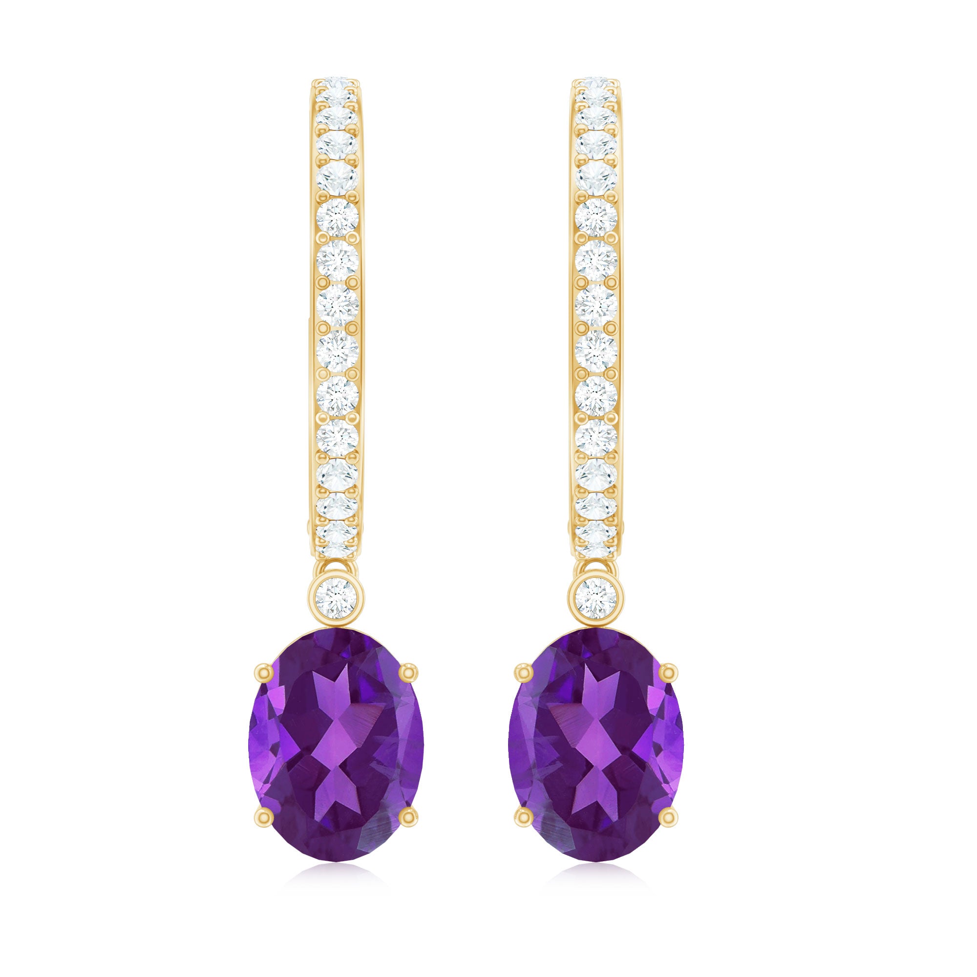 Dazzling in every detail, these Amethyst Drop Earrings are the epitome of elegance and romance. Each earring features a captivating 6X8 mm Oval Shape Amethyst set in Prong Setting, radiating a rich violet glow that symbolizes wisdom and calm. The gemstones gracefully dangle from a Diamond studded Hinged Hoop, where each tiny Diamond sparkles like starlight, perfectly complementing the vibrant beauty of the Amethyst below. Designed to move gently with you, these Amethyst Hoop Earrings catch the light from every angle, creating an aura of effortless sophistication. The secure Hinged Closure ensures both comfort and confidence, making them ideal for all-day wear, whether you are stepping out for an evening soiree or adding a touch of glam to your everyday style. Presented in a signature jewelry box, these Amethyst Diamond Earrings make an unforgettable gift for someone special or a timeless treasure for your own collection. Let these Hoop Drop Earrings be your go-to accessory for moments that deserve a little extra sparkle and a whole lot of love.