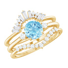 Celebrate your unique love story with this one-of-a-kind Engagement Ring Set. The center of the Aquamarine Engagement Ring is adorned with a Round Brilliant Aquamarine Solitaire held in a claw setting, and accented with Round Shape Diamond on both sides. The set also includes two Diamond Ring Enhancers, which are embellished with Round and Baguette Cut Diamond. All pieces in the set are crafted from Solid Gold, making it a beautiful choice for the special woman in your life.