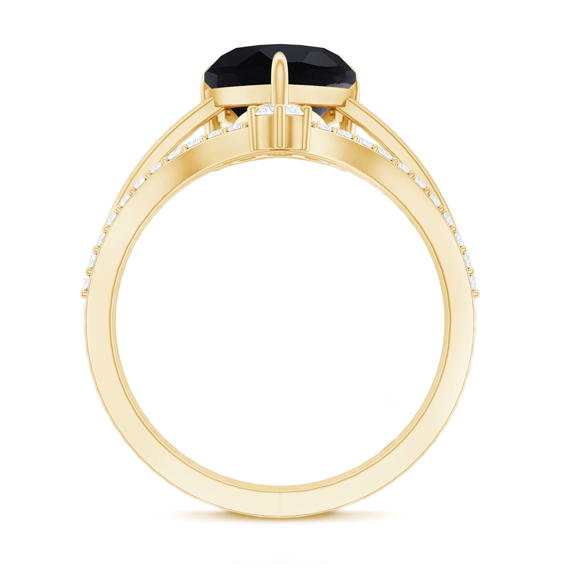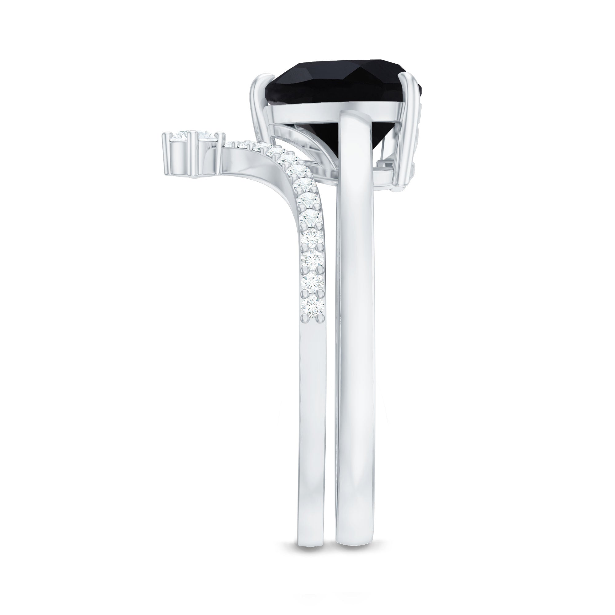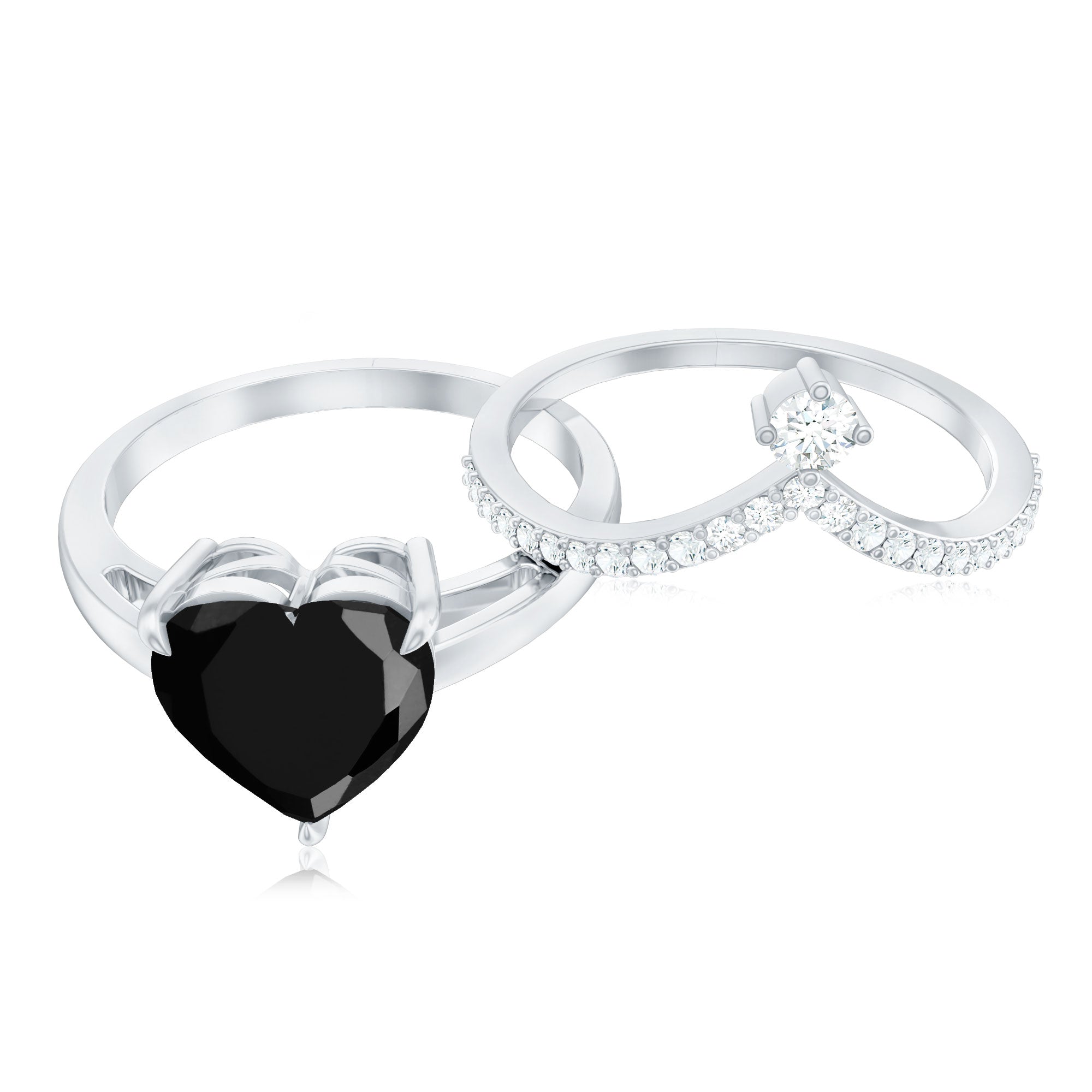 Turn a meaningful moment into a lasting memory with this Heart Bridal Ring Set designed to honor true love. This Black Onyx Wedding Ring Set brings together striking contrast and graceful detail, making it a beautiful choice for those who value both style and sentiment. The engagement ring showcases an 8 MM heart shaped Black Onyx, held in secure claw setting that highlights its bold and elegant shape. Paired with the engagement ring is a chevron style wedding band, delicately adorned with round cut diamonds. The gentle curve of the band fits perfectly against the heart shaped centerpiece, creating a balanced look. Every detail of this Heart Engagement Ring with Wedding Band Set has been thoughtfully crafted to reflect lasting commitment and personal style. Whether worn together or individually, the rings complement each other effortlessly, blending the boldness of AAA quality black onyx with the timeless brilliance of HI-SI quality diamonds. With its unique design and emotional meaning, this Black Onyx and Diamond Bridal Set is a beautiful reminder of the journey you are on together.