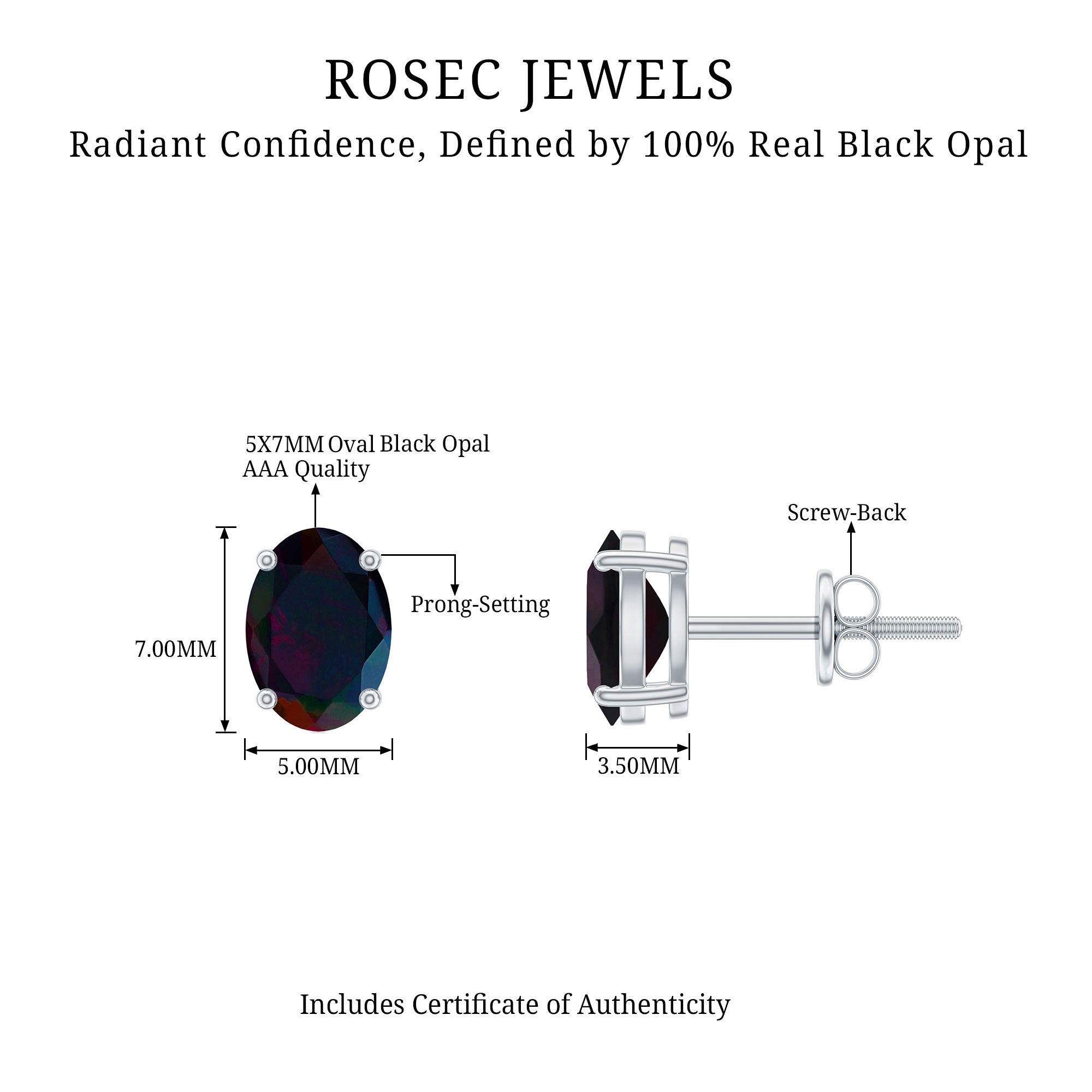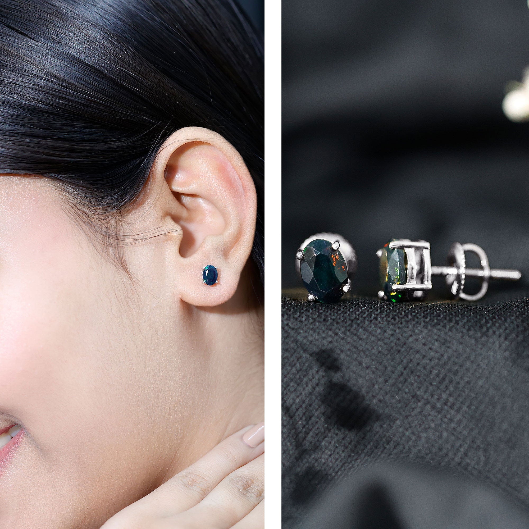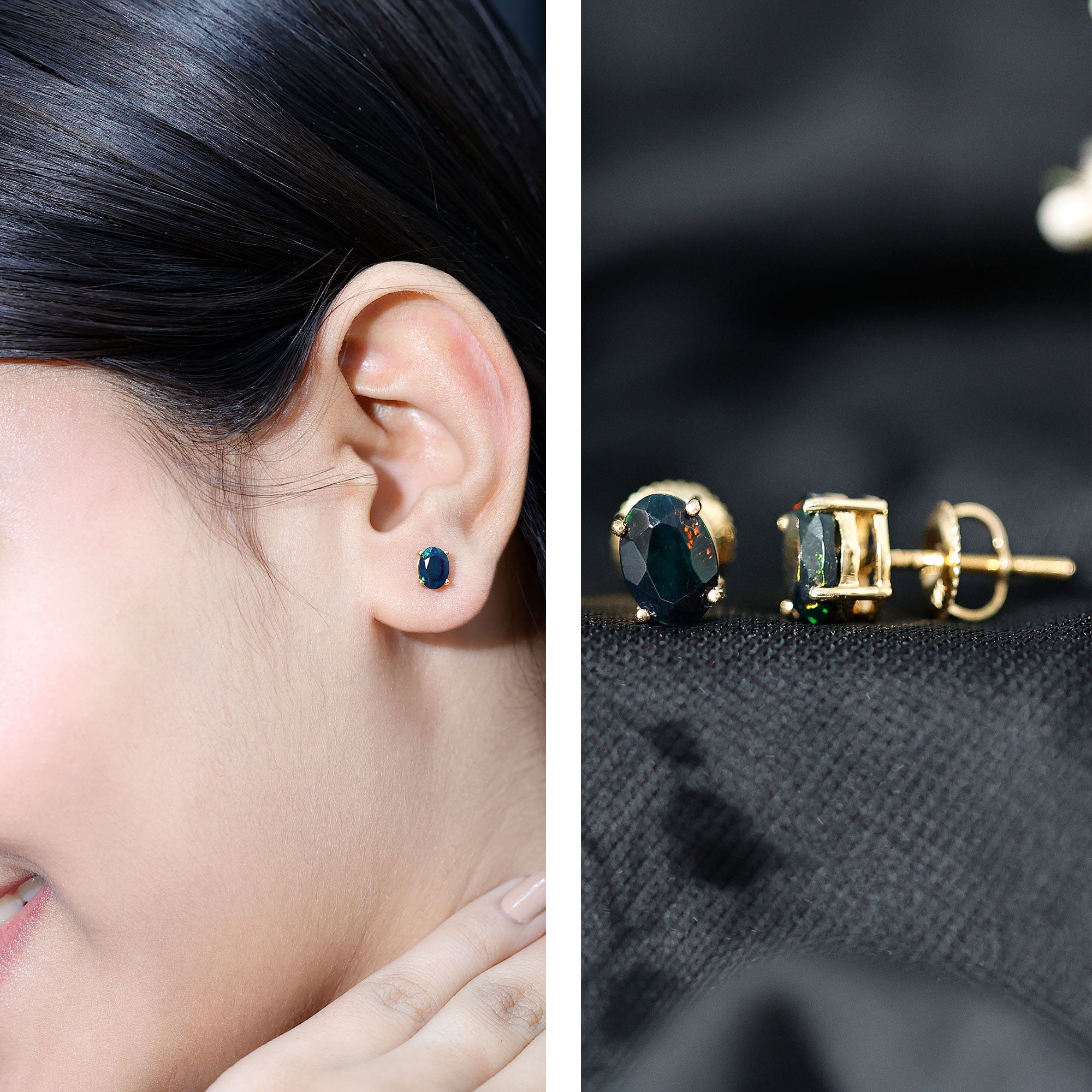Enhance your style with a hint of elegance and sophistication using these Black Opal Stud Earrings. Each earring showcases a 5X7 MM oval cut black opal, securely set in 4-prong setting. The Solitaire Earrings come with screw back closures, ensuring they remain comfortably in place all day long. They are lightweight and easy to wear, making them ideal for daily wear as well as special events. The sleek design ensures comfort, allowing you to wear them for hours without any irritation. Black opal carries significant meaning, often linked to strength, creativity, and protection. Thus, these October Birthstone Earrings serve not only as a lovely accessory but also as a meaningful symbol. They make a perfect gift for birthdays, anniversaries, or simply to express your affection. These Oval Stud Earrings blend timeless elegance with a contemporary touch, adding a splash of color and sophistication to any outfit, whether it is casual or formal.